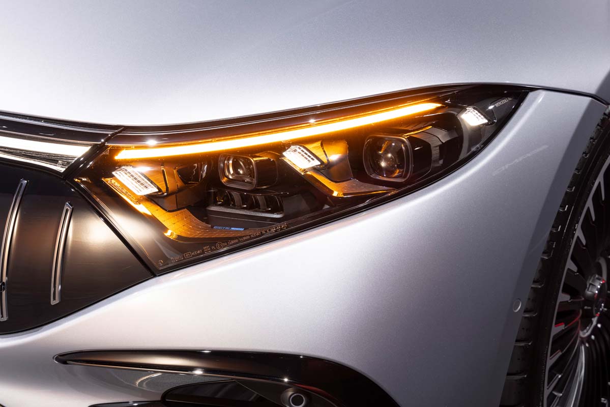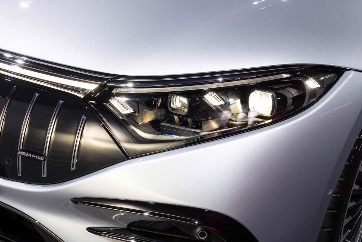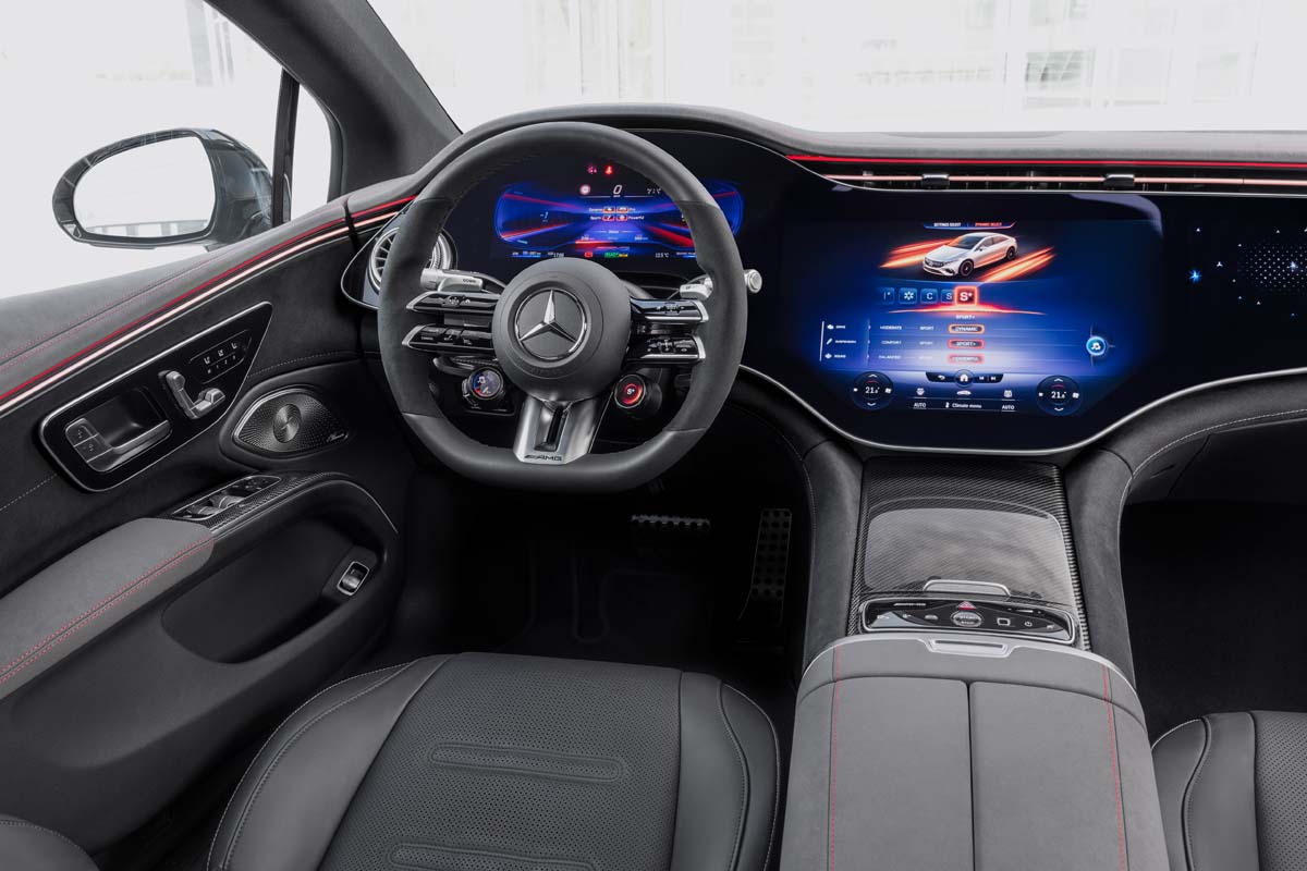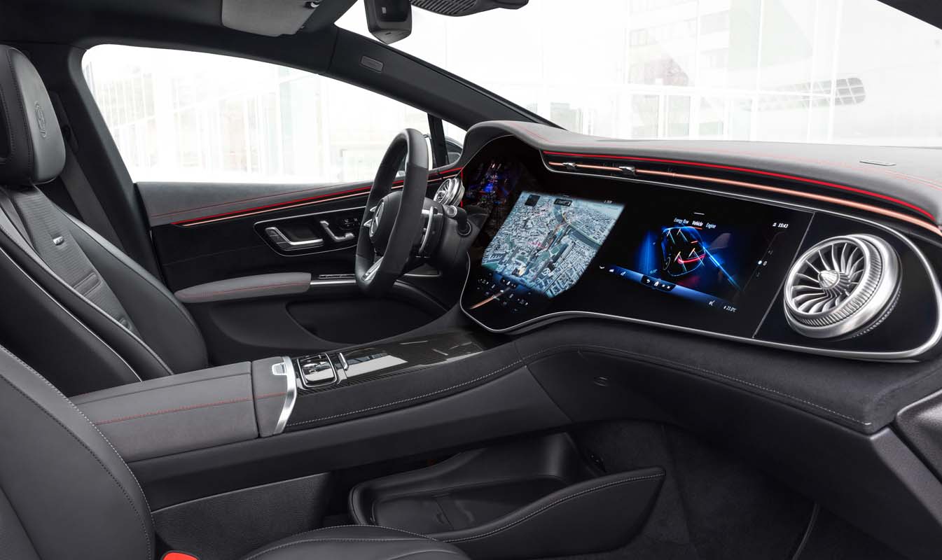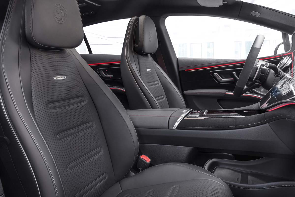 Numerous AMG options enhance the dynamic impression if required. These include design features such as the AMG Night Package Dark Chrome, red brake callipers, AMG carbon trim elements and AMG seat covers in nappa leather with specific seat graphics. The high-performance electric saloon can also be technically further refined for even more driving dynamics, for example with corresponding hardware such as the AMG ceramic high-performance compound brake system. There is also a choice of aerodynamically optimised 21- and 22-inch AMG light-alloy wheels.