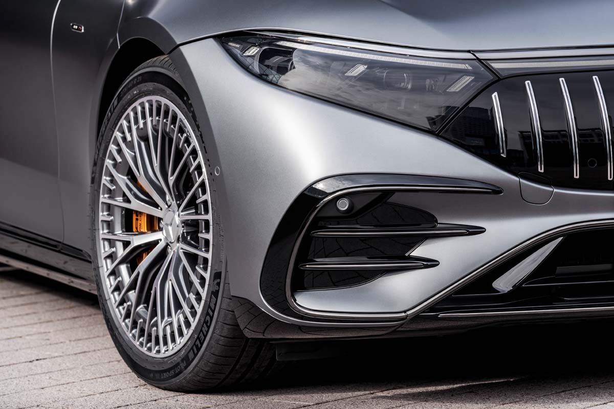 The Mercedes-AMG EQS53 4MATIC+ is not only a top performer when it comes to driving dynamics, but also in handling safety. This is amply demonstrated by the AMG high-performance compound brake system with six-piston brake callipers and brake discs measuring 415×33 millimetres at the front, and single-piston brake callipers and brake discs measuring 378×22 millimetres at the rear. The optional AMG ceramic high-performance compound brake system uses even larger brake discs measuring 440×40 millimetres at the front. Another high-tech feature is the additional i-Booster function. This ensures that the braking system combines electric recuperation with the hydraulic brake in a highly efficient manner. For that really authentic driving experience, the i-Booster is specially tuned to the hallmark AMG pedal feel and the larger AMG braking system.