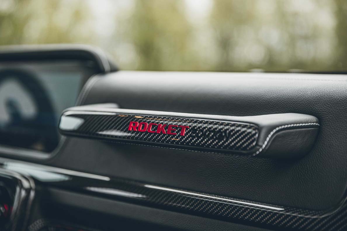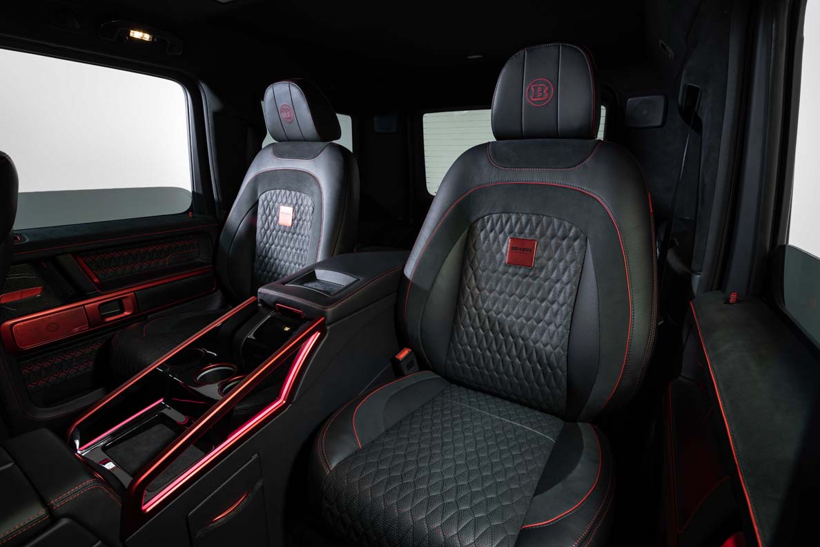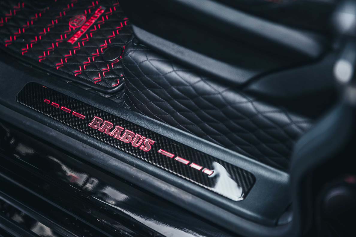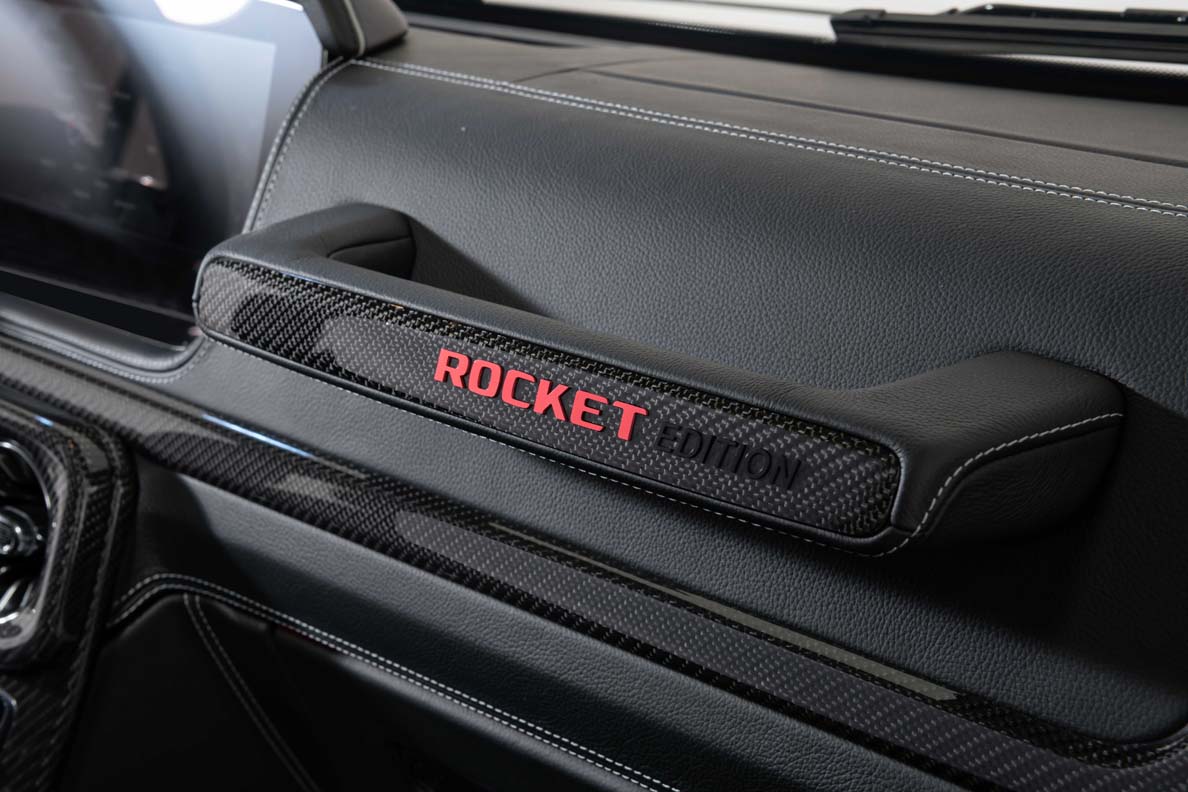 Defined not only by its hallmark BRABUS paintwork in either “Signature Black” or “Stealth Gray”, this unique bodywork conversion is also characterized by its attention to detail. Carbon fiber trim elements around the fender flares on the front and rear axles accentuate the re-imagined Widestar exterior design. Matching its rocket ship flair are the restyled signature twin sidepipes framed by an exposed carbon trim with integrated ROCKET Launch Ambience Light for an extra sporty and extravagant appearance. Last but not least, the hallmark radiator grille with integrated RAM-AIR intakes, ROCKET Startup Glow and an illuminated ROCKET logo as well as our red signature stripes ensure the unmistakable BRABUS look.
