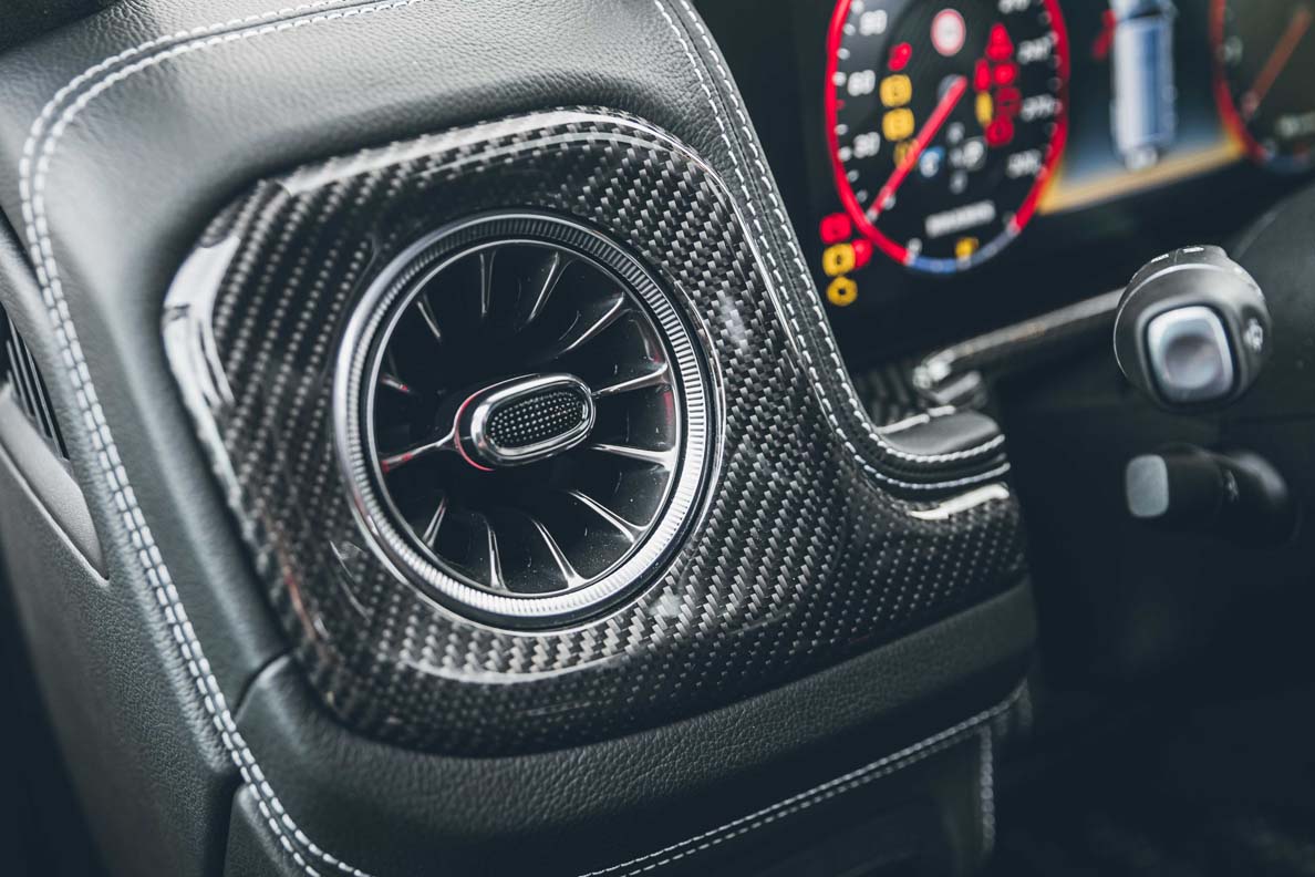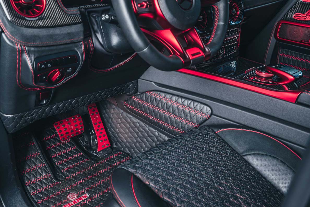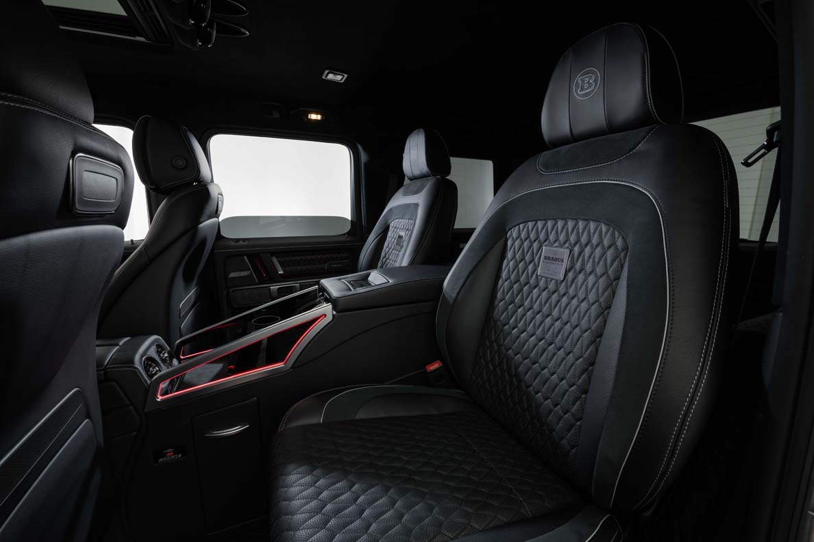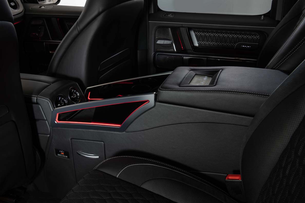 Defined not only by its hallmark BRABUS paintwork in either “Signature Black” or “Stealth Gray”, this unique bodywork conversion is also characterized by its attention to detail. Carbon fiber trim elements around the fender flares on the front and rear axles accentuate the re-imagined Widestar exterior design. Matching its rocket ship flair are the restyled signature twin sidepipes framed by an exposed carbon trim with integrated ROCKET Launch Ambience Light for an extra sporty and extravagant appearance. Last but not least, the hallmark radiator grille with integrated RAM-AIR intakes, ROCKET Startup Glow and an illuminated ROCKET logo as well as our red signature stripes ensure the unmistakable BRABUS look.