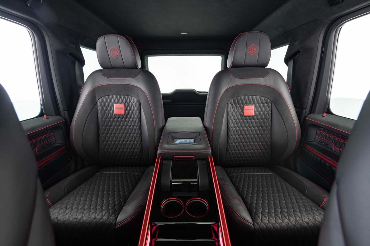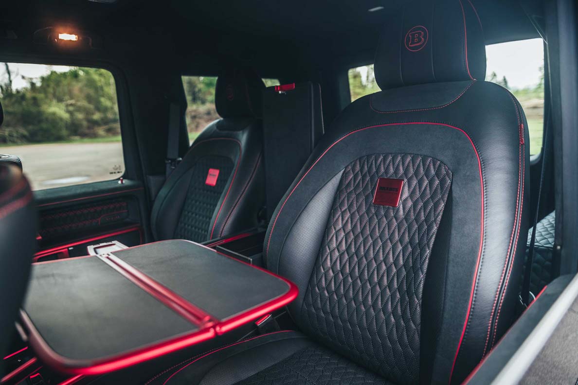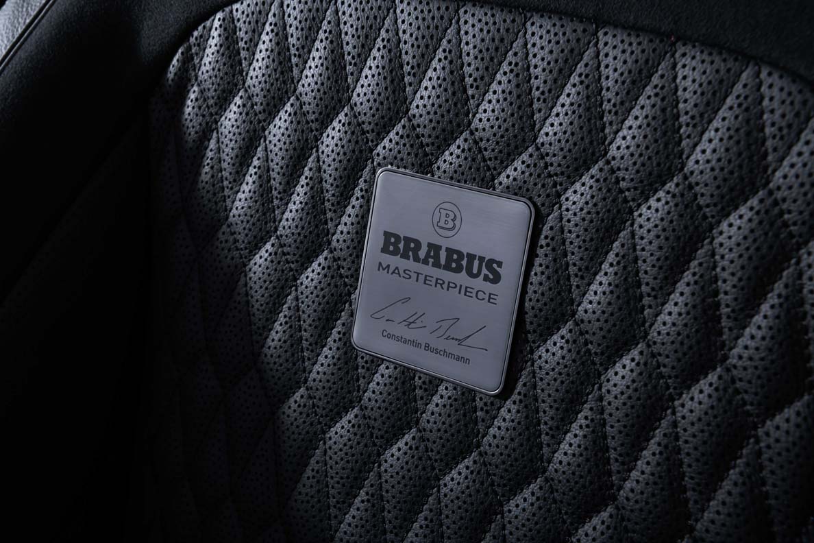 Fortune favors the bold – as indicative by the red framed rear badge; our master artisans developed a bespoke, fully hand-crafted BRABUS Masterpiece interior specifically for this brand new model to match its sporty, vigorous appearance as well as its uncompromising performance. Refined down the last detail, the black leather design impresses with its immaculate finish, complete with crest-shaped quilting applied through pinpoint precision on the seats, trim elements and the footwells, which are likewise upholstered in the finest leather. Highly precise, colored decorative topstitching adds intriguing contrast. Unique for the variant painted “Stealth Gray,” these and all the controls feature a finish matching the vehicle color. The topstitching in the BRABUS 900 ROCKET Edition in “Signature Black” features red yarns. All 216 cockpit elements from switches to speaker covers and air vents as well as all trim and handles feature the signature “ROCKET RED” glazing so you can feel truly at home on your way through the stratosphere.