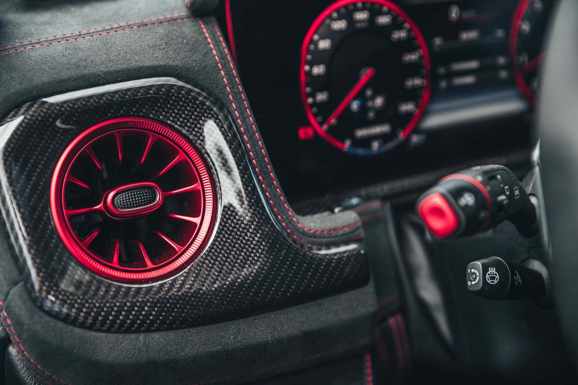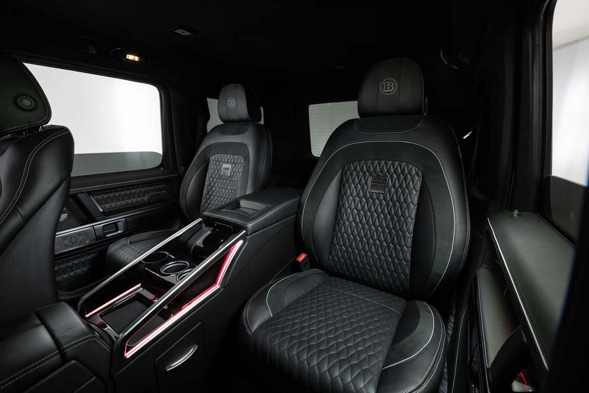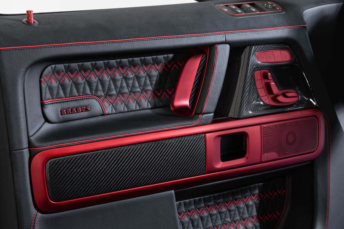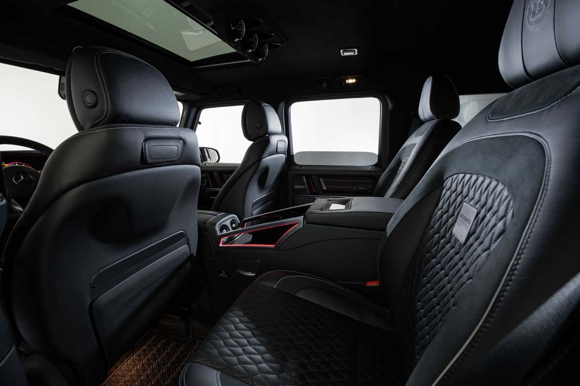 Fortune favors the bold – as indicative by the red framed rear badge; our master artisans developed a bespoke, fully hand-crafted BRABUS Masterpiece interior specifically for this brand new model to match its sporty, vigorous appearance as well as its uncompromising performance. Refined down the last detail, the black leather design impresses with its immaculate finish, complete with crest-shaped quilting applied through pinpoint precision on the seats, trim elements and the footwells, which are likewise upholstered in the finest leather. Highly precise, colored decorative topstitching adds intriguing contrast. Unique for the variant painted “Stealth Gray,” these and all the controls feature a finish matching the vehicle color. The topstitching in the BRABUS 900 ROCKET Edition in “Signature Black” features red yarns. All 216 cockpit elements from switches to speaker covers and air vents as well as all trim and handles feature the signature “ROCKET RED” glazing so you can feel truly at home on your way through the stratosphere.