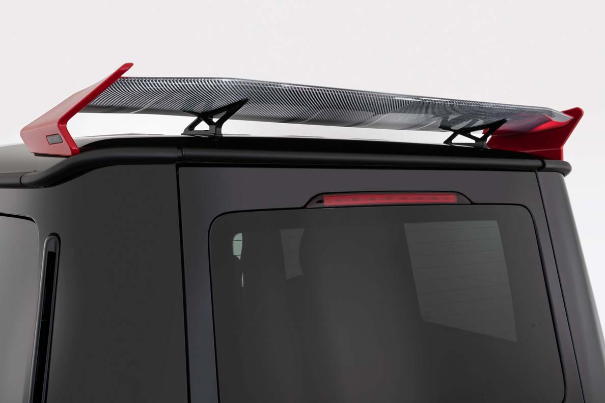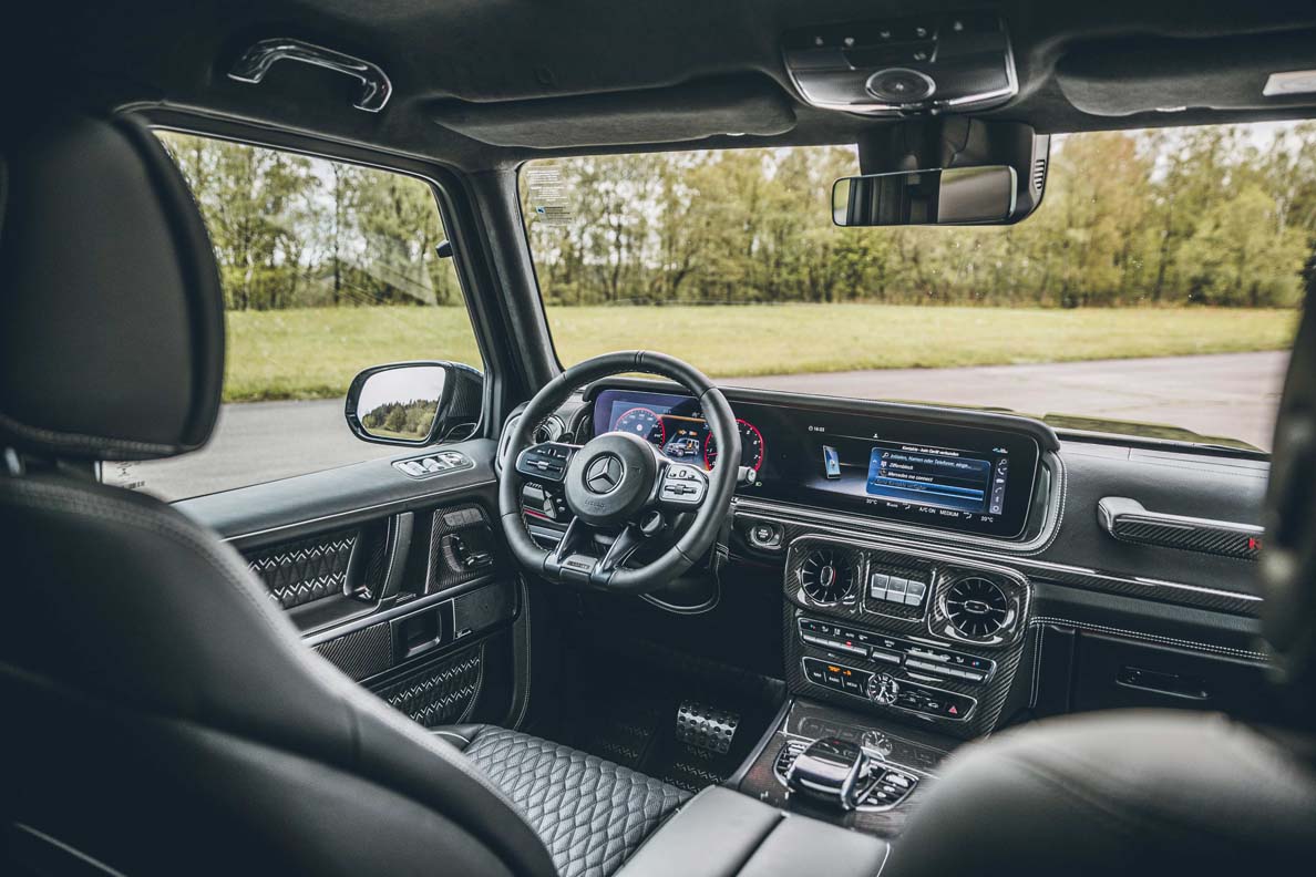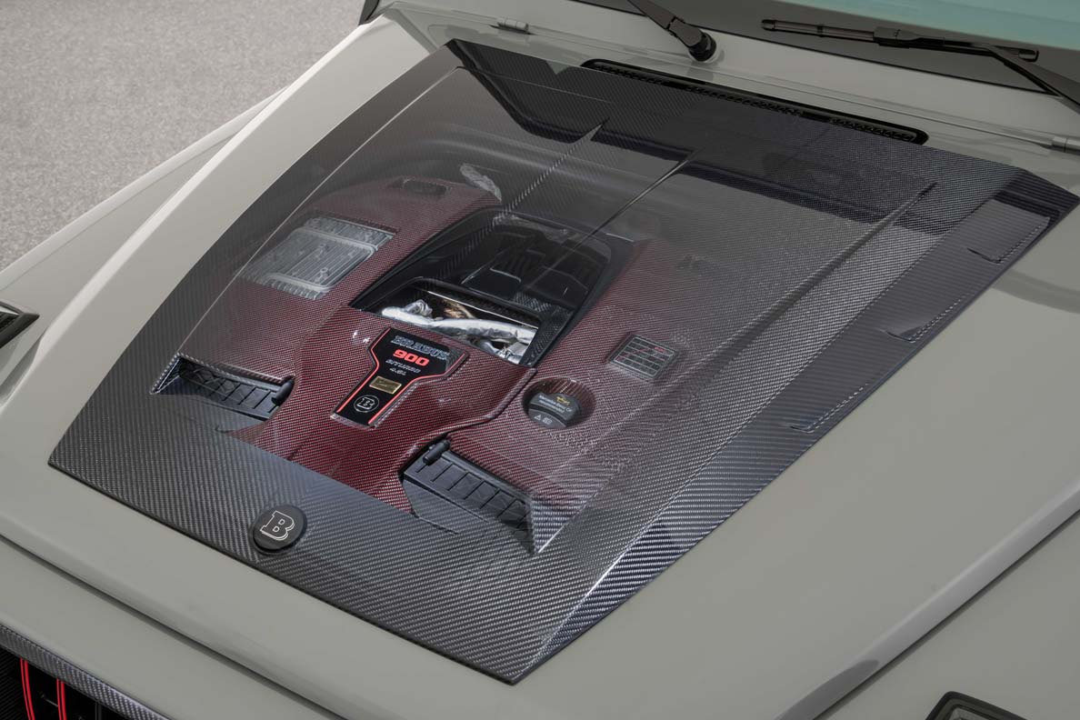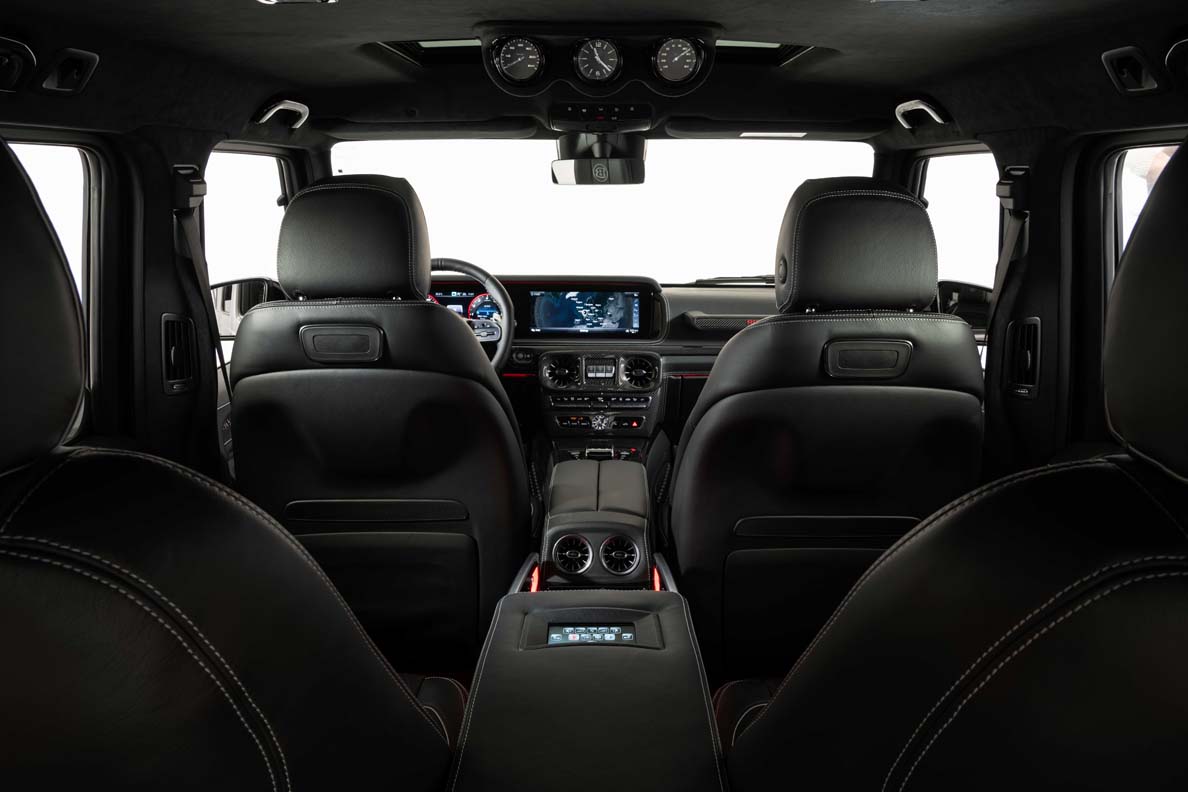 Defining the bold looks of the brand new BRABUS 900 Rocket Edition is a tailor-made, newly developed variant of the signature BRABUS Widestar exterior concept. Designed not only to give the SUV its extra athletic appearance but also its hyperspace aerodynamics, this purpose-built design features a special, all-carbon front spoiler enhanced by custom side flaps which reinvents the car’s iconic face while reducing front-axle lift at its staggeringly high speeds which, in turn, results in immaculate handling stability. In the rear, an emphatically sporty, roof-mounted wing as well as a custom diffuser maximize the full aerodynamic potential of the all-new BRABUS 900.