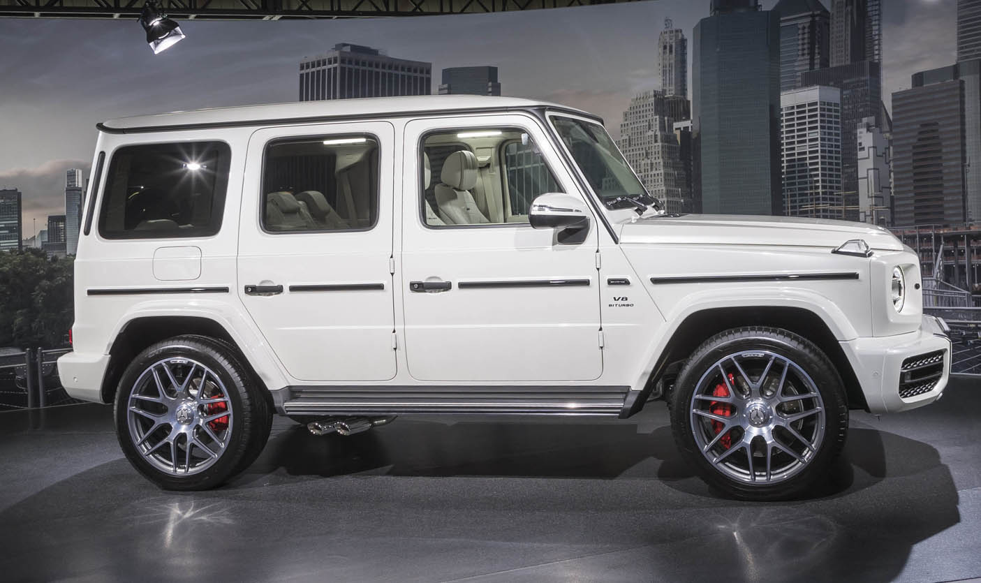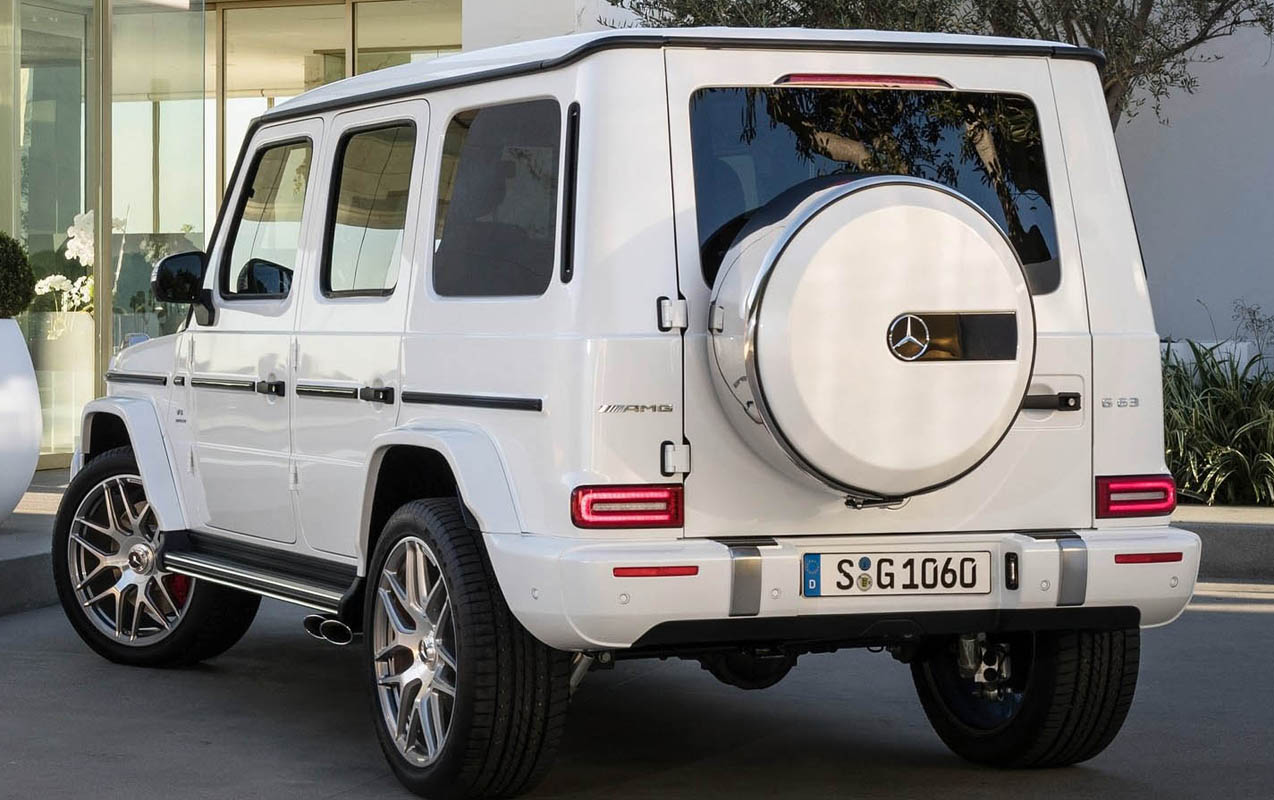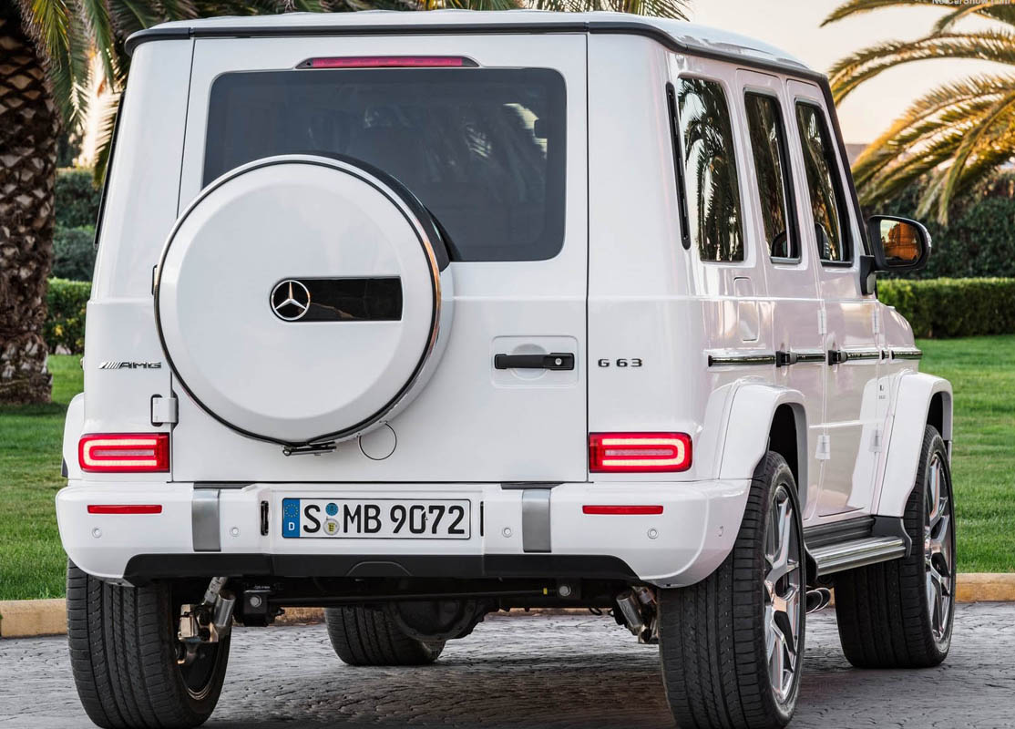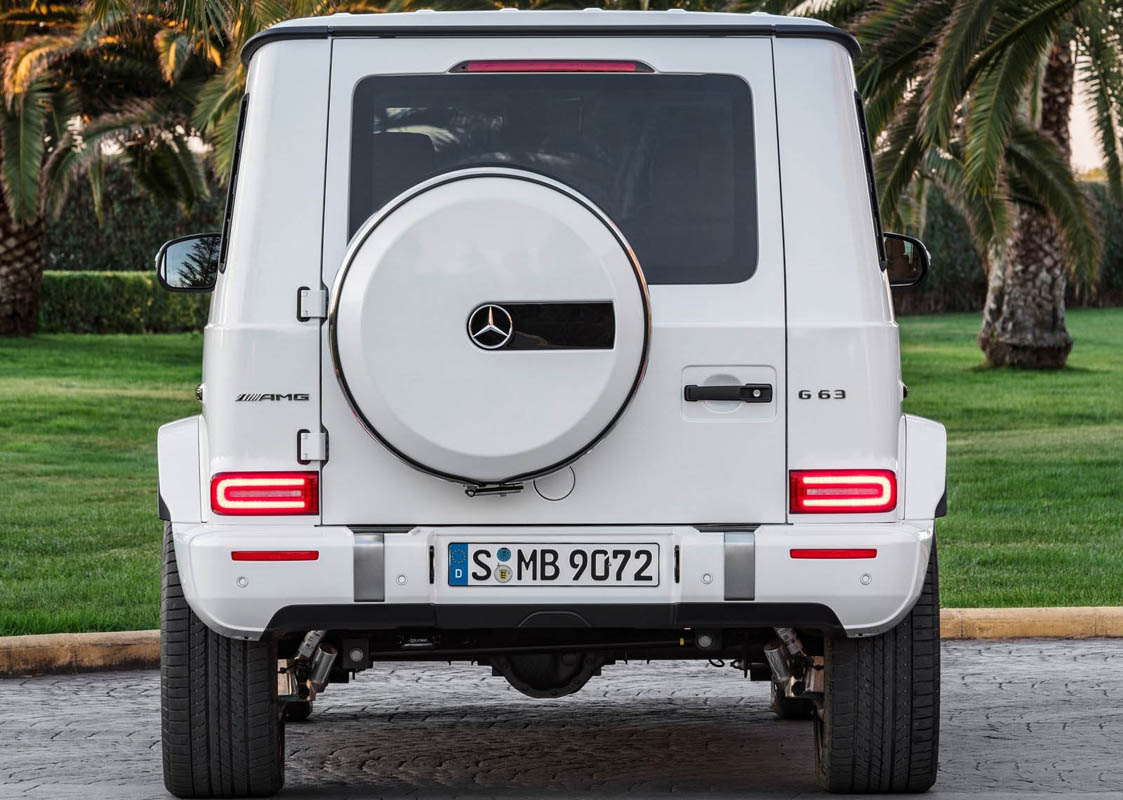 Unmistakable design features give the new AMG G63 its unique appearance: the boxy silhouette, the proud bonnet, external door hinges, round headlamps, mounted direction indicators, robust door handles, muscular protective strips with inserts in high-gloss black with a silver AMG emblem, the exposed spare wheel on the rear door with a stainless steel cover and three-dimensional Mercedes star.