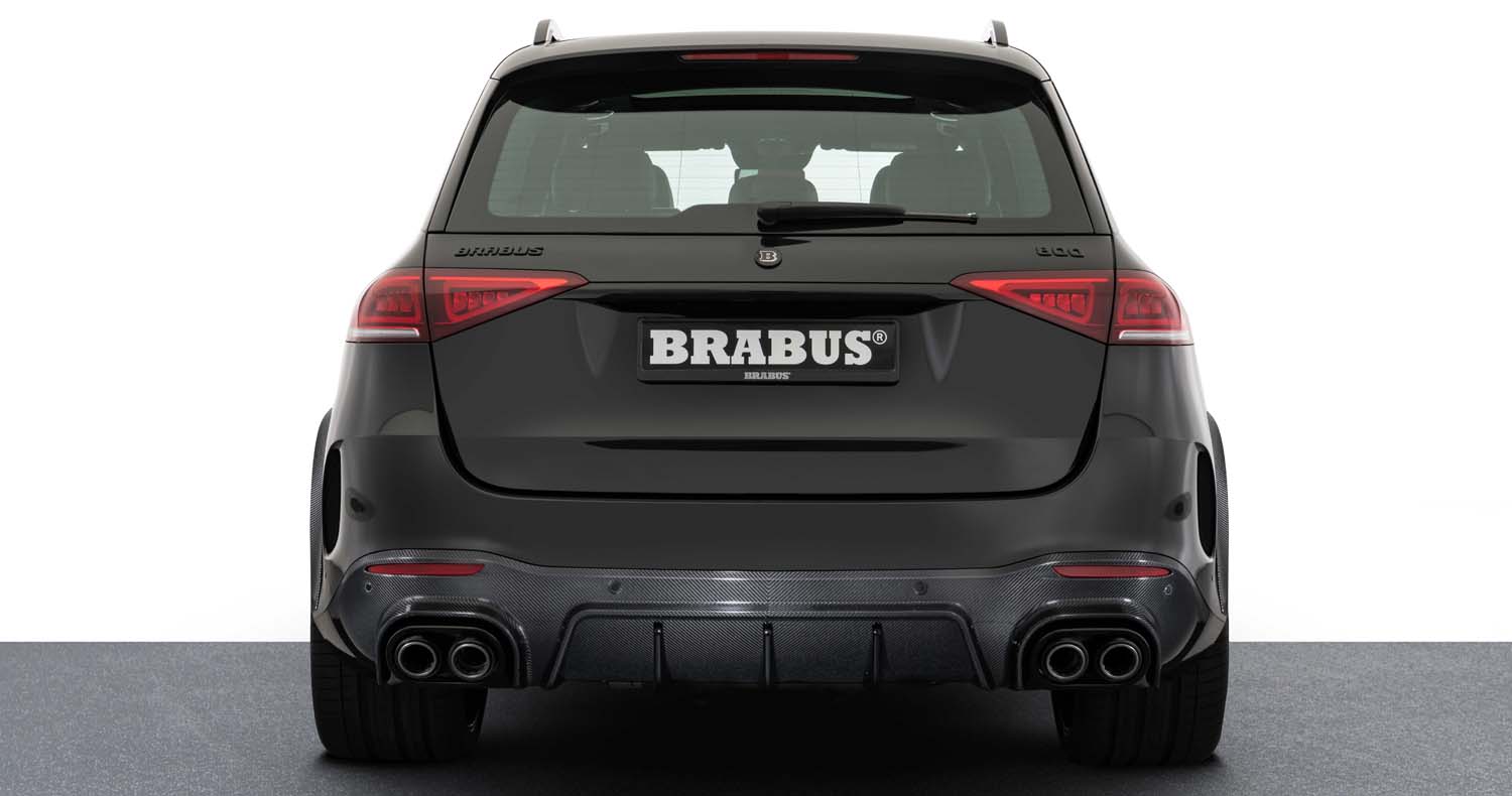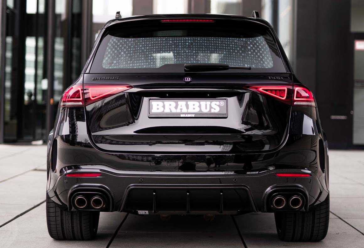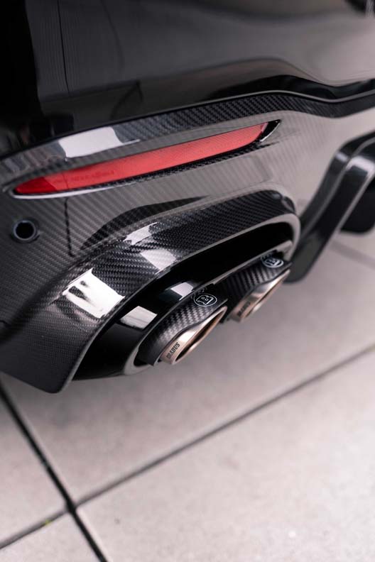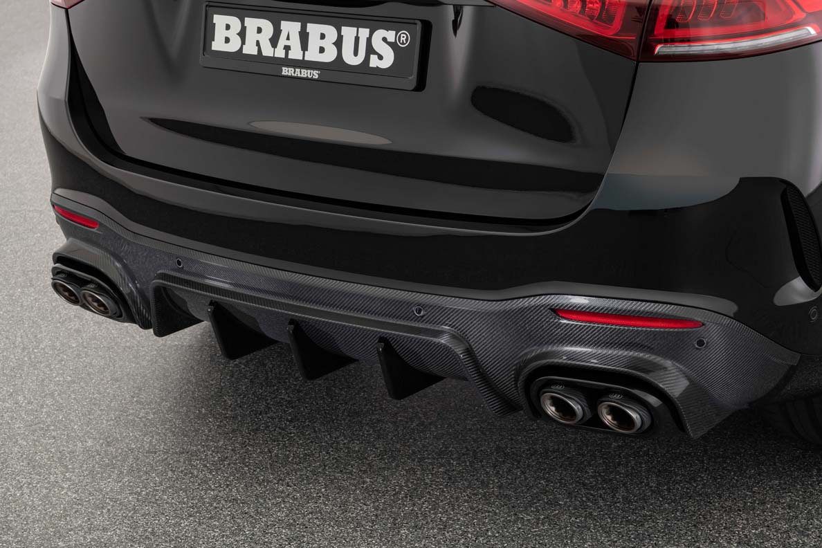 BRABUS can also refine the side view by adding a touch of racing flair. To this end, BRABUS offers carbon elements that replace the ex-factory wheel arch trim. The BRABUS diffuser insert was developed for the rear fascia. It perfectly showcases the four BRABUS titanium/carbon tailpipes with a diameter of 90 millimeters (3.5 in). The BRABUS roof spoiler rounds off the aerodynamics concept for the five-door.