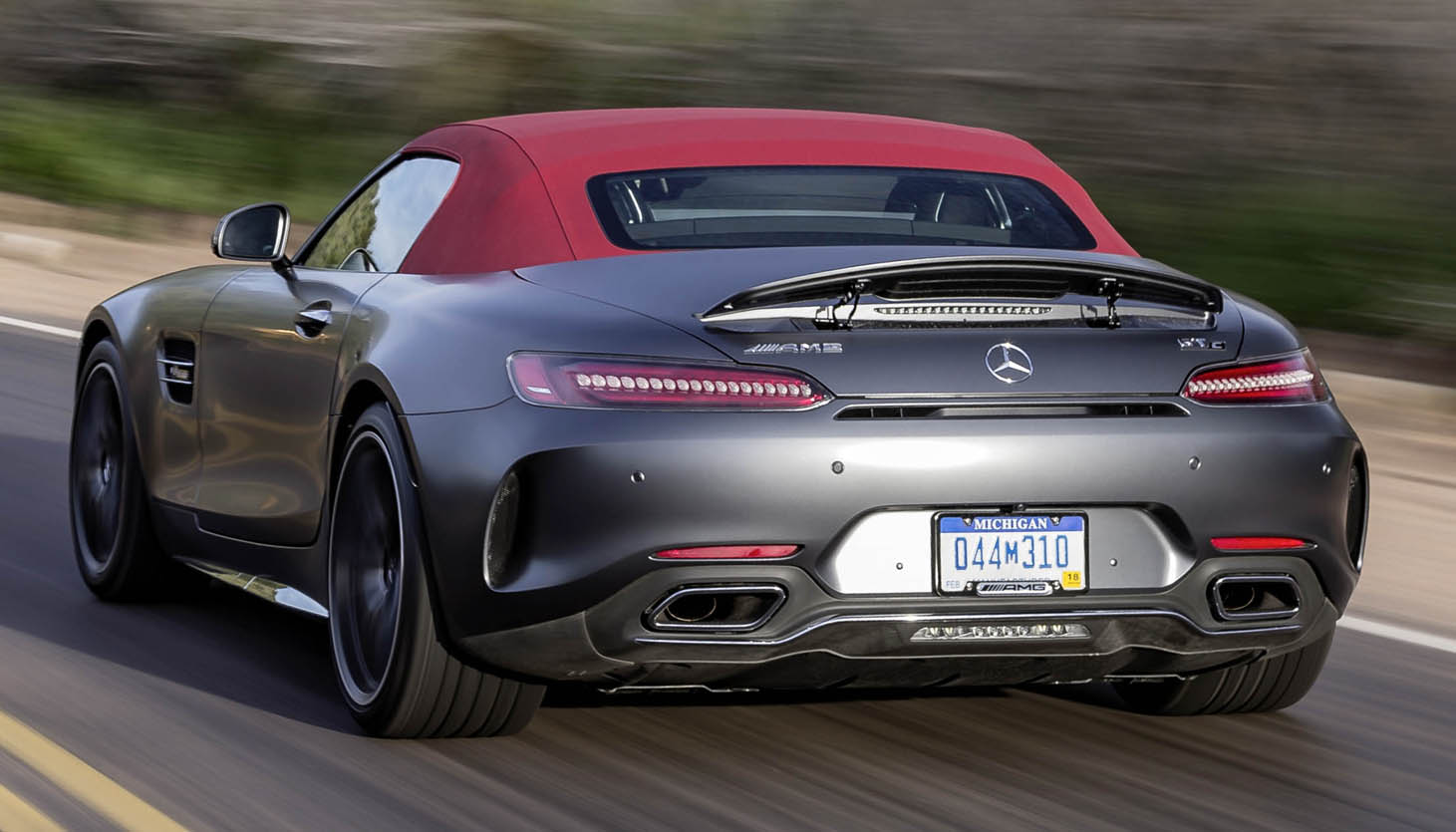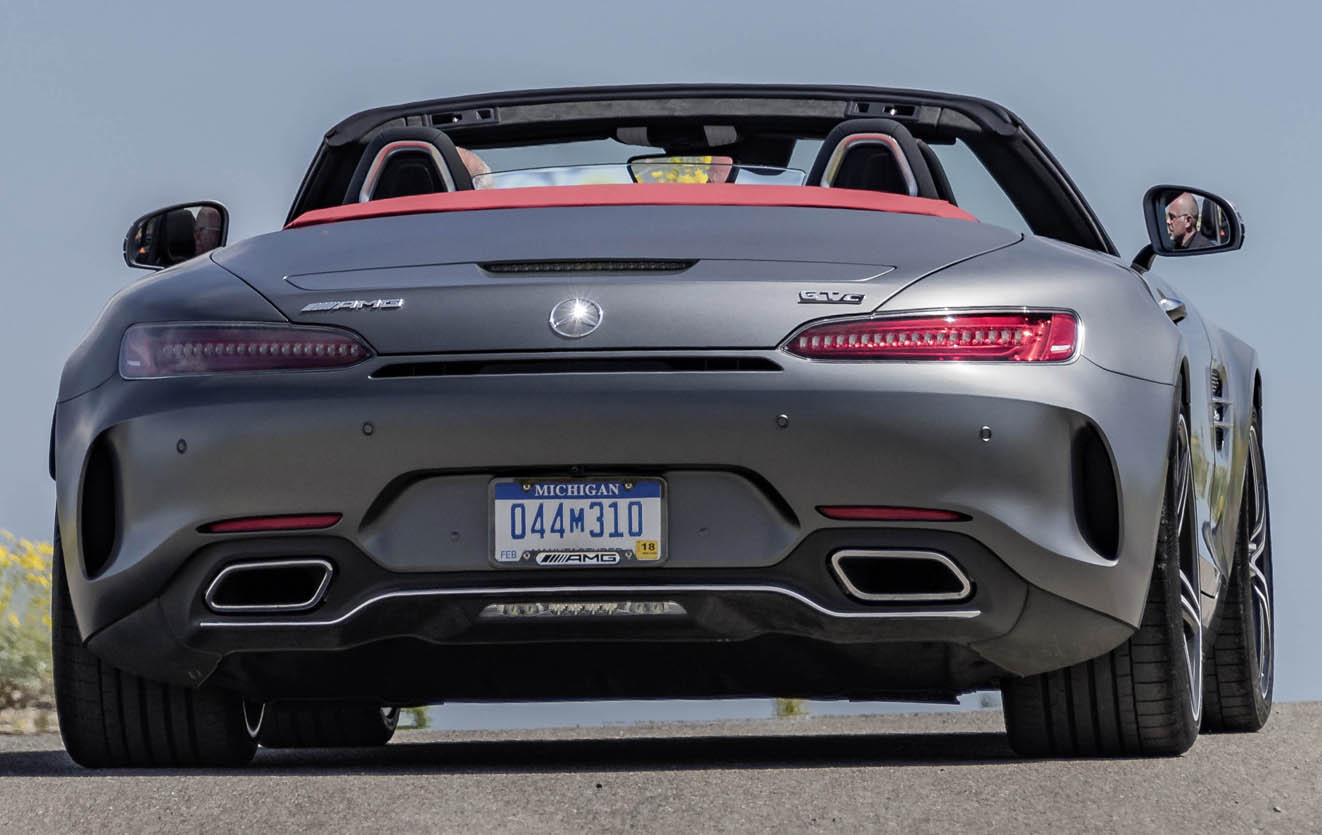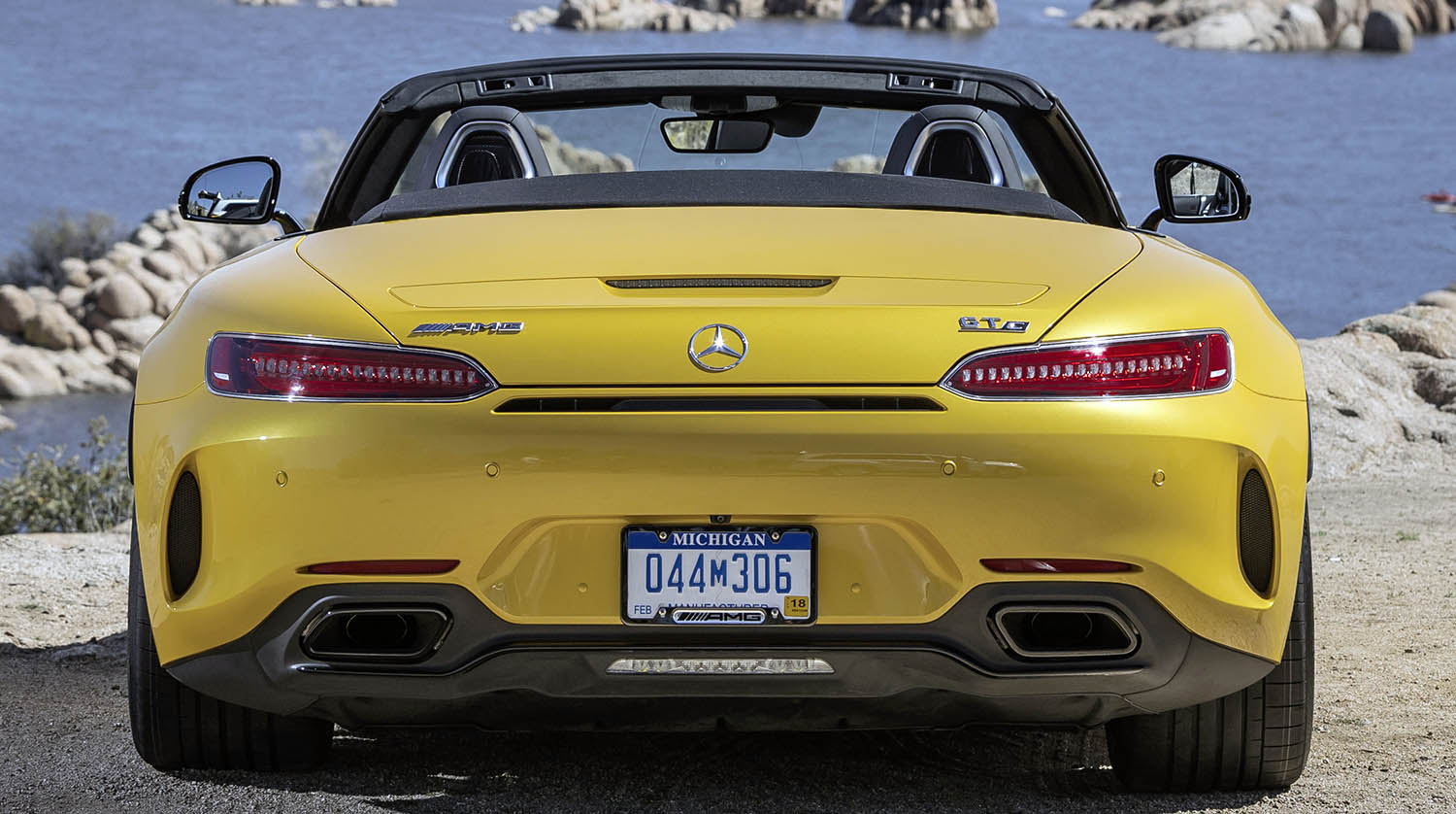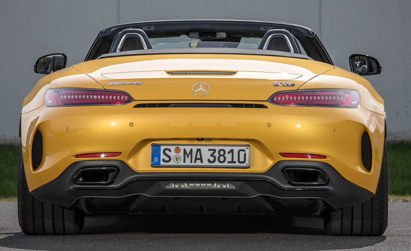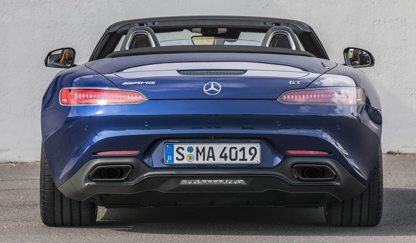 From the back the new look of the rear bumper is striking, its sporty black diffuser insert was redesigned for the AMG GT and AMG GT C. At the same time the tail pipe outlet was visually redesigned and matched to the shape of the AMG GT 4-door coupe. The AMG GT now has two round twin tail pipe outlets, the AMG GT C has trapezoidal shaped twin tail pipe outlets. The rear design of the AMG GT R keeps its distinctive shape with the large, centrally positioned tail pipe outlet with center bar. It is flanked by two more black tail pipes on the left and right of the diffuser.