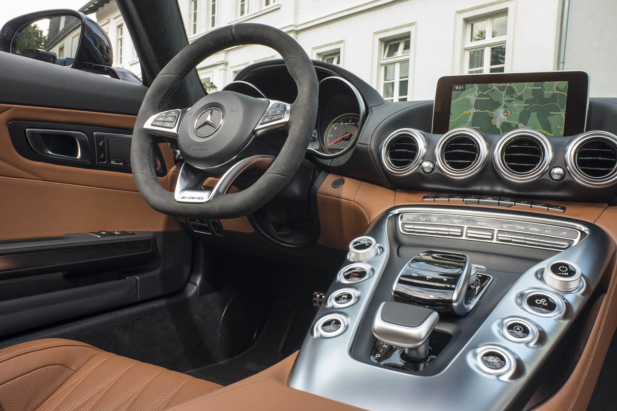 The 2-door AMG GT will also receive the new AMG performance steering wheel which celebrated its debut in the AMG GT 4-door coupe and is also available in the C 63. It is characterized by its sporty design, a flattened bottom section with a heavily contoured rim and intuitive operation. The steering wheel cover in black nappa leather is perforated at the sides to ensure optimum grip.