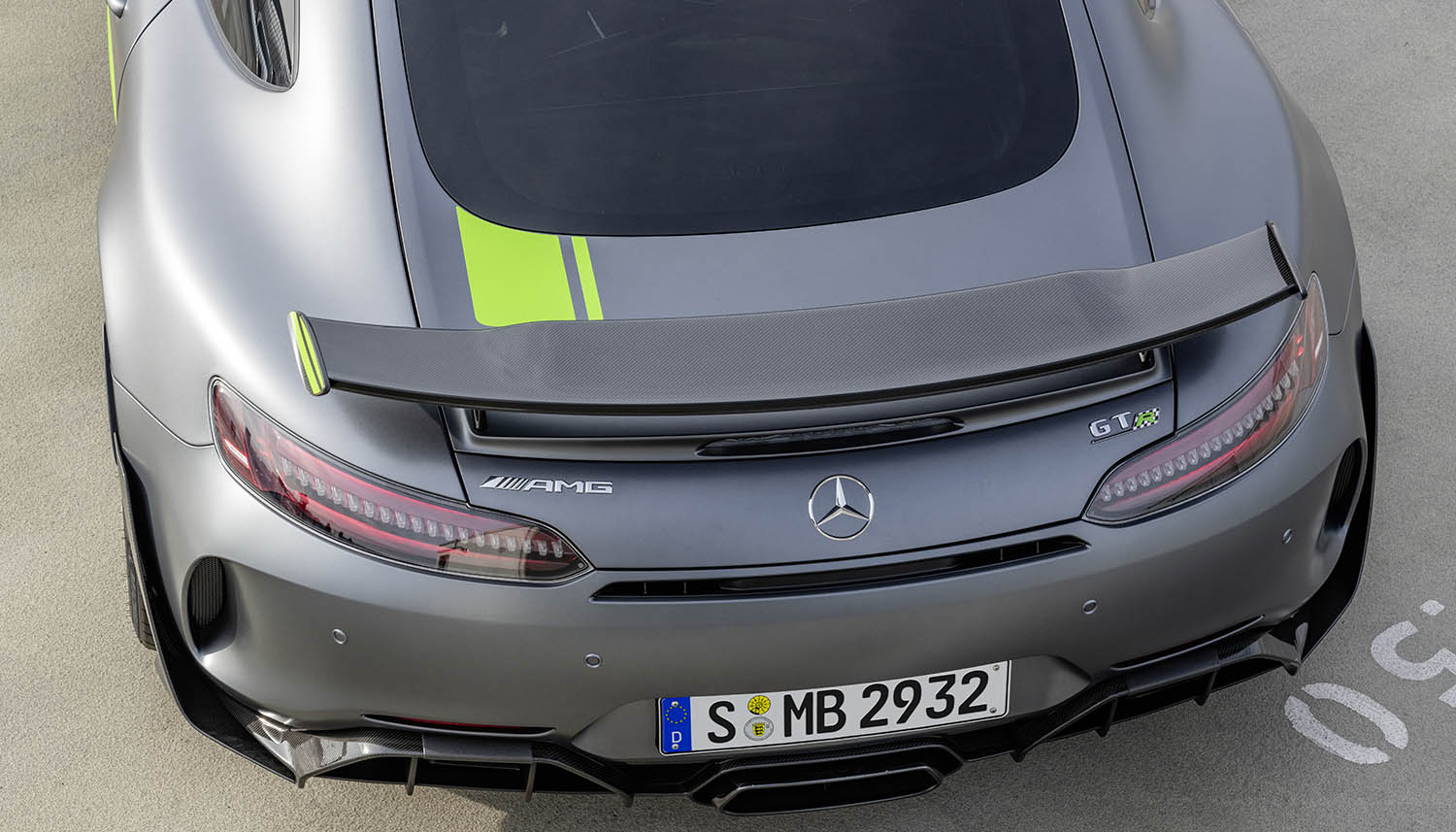 The AMG GT R PRO doesn’t only drive like a racing car, it also looks the part. The standard-fit Carbon Packages I and II with front splitter, fins in the fenders, trim strips in the side sills, side mirrors, rear spoiler, and a diffuser with high-quality clear-coated carbon-fiber finish emphasize the proximity to motorsport, as does the redesigned carbon-fiber roof with lowered center.