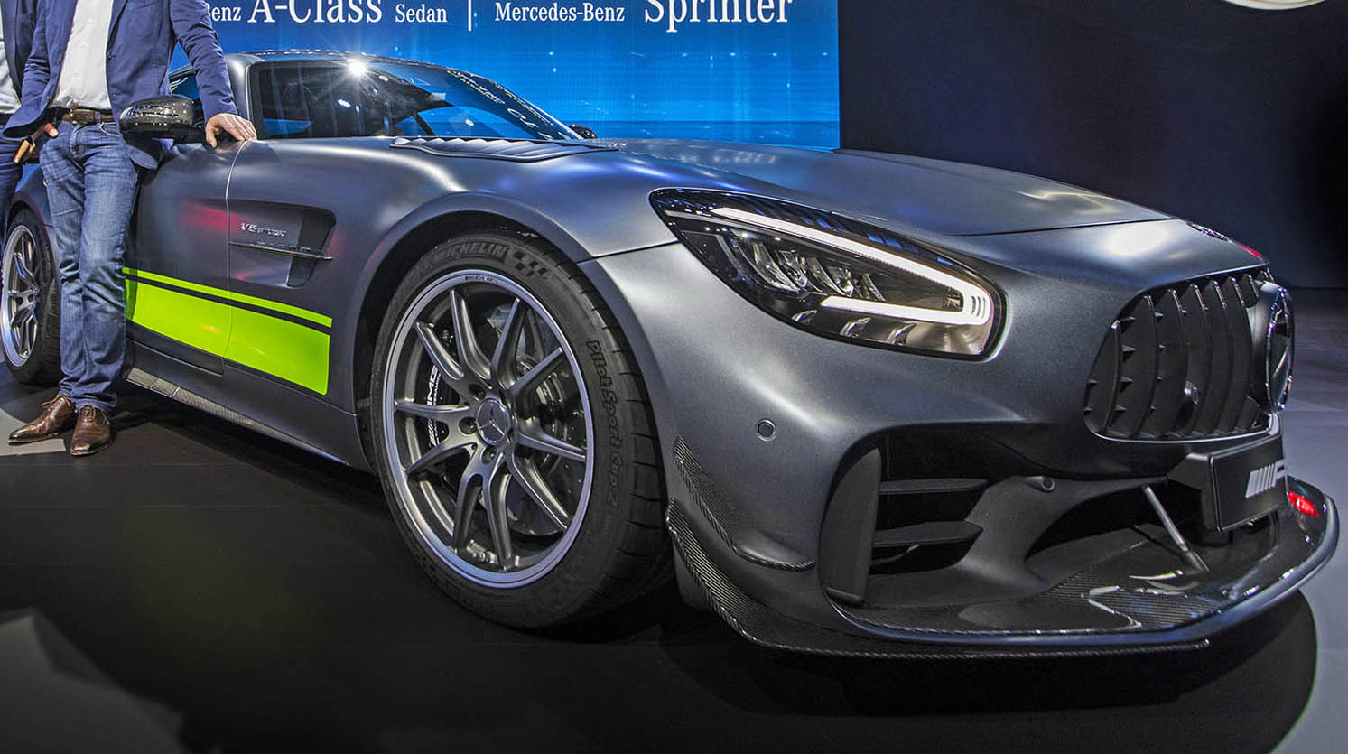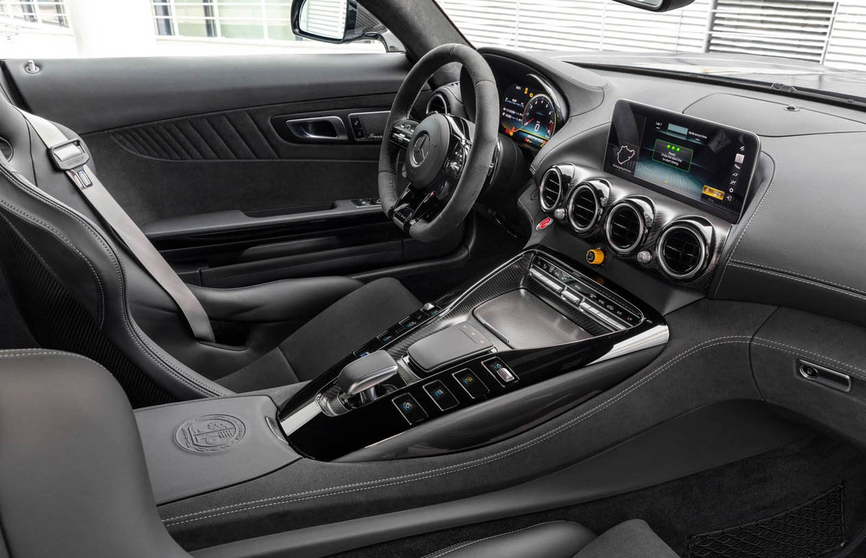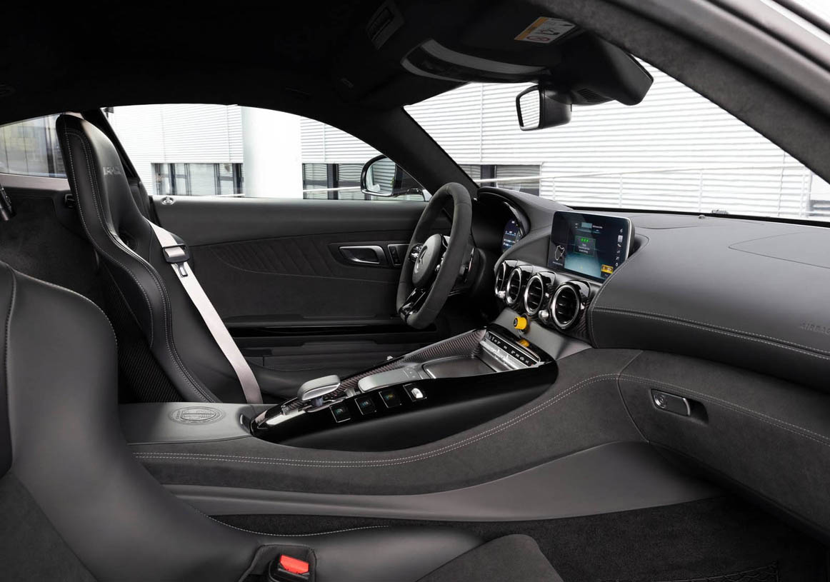 In addition to a host of carbon-fiber components, weight is saved by making the ceramic composite high-performance braking system standard. And exclusively for the AMG GT R PRO, the brake calipers will be painted black with white lettering. The lightweight AMG Performance Twin 5-spoke forged wheels are exclusively painted titanium gray and feature a rim flange with high-sheen finish.