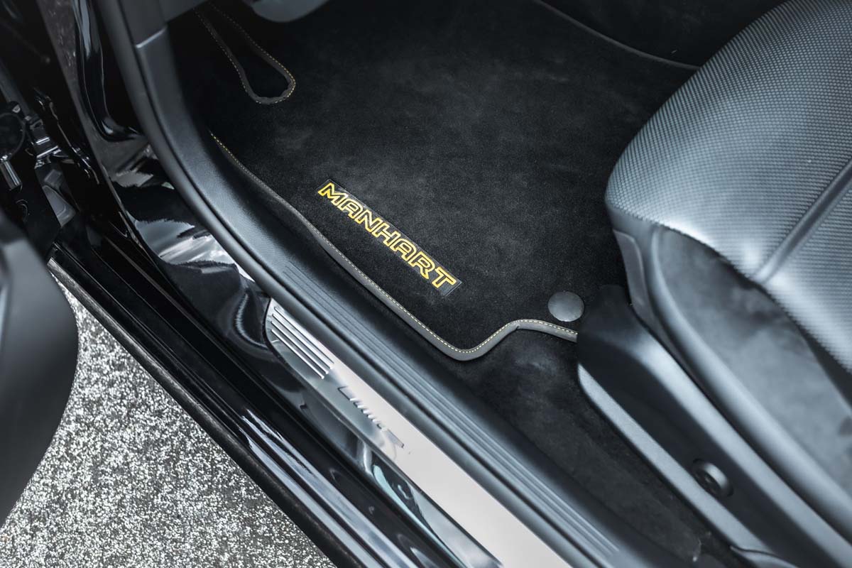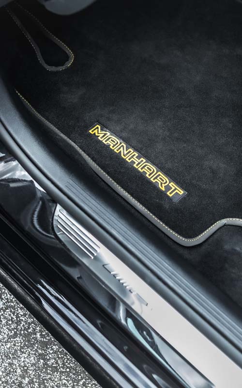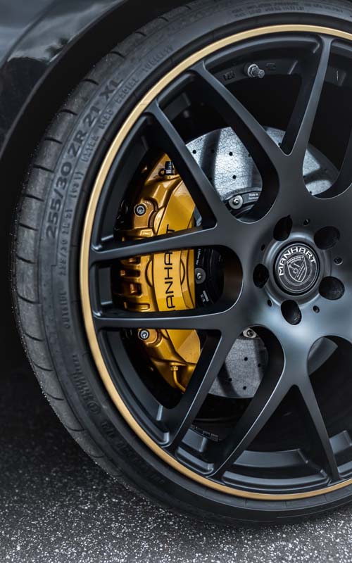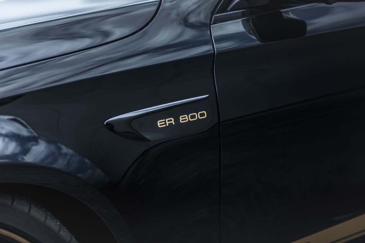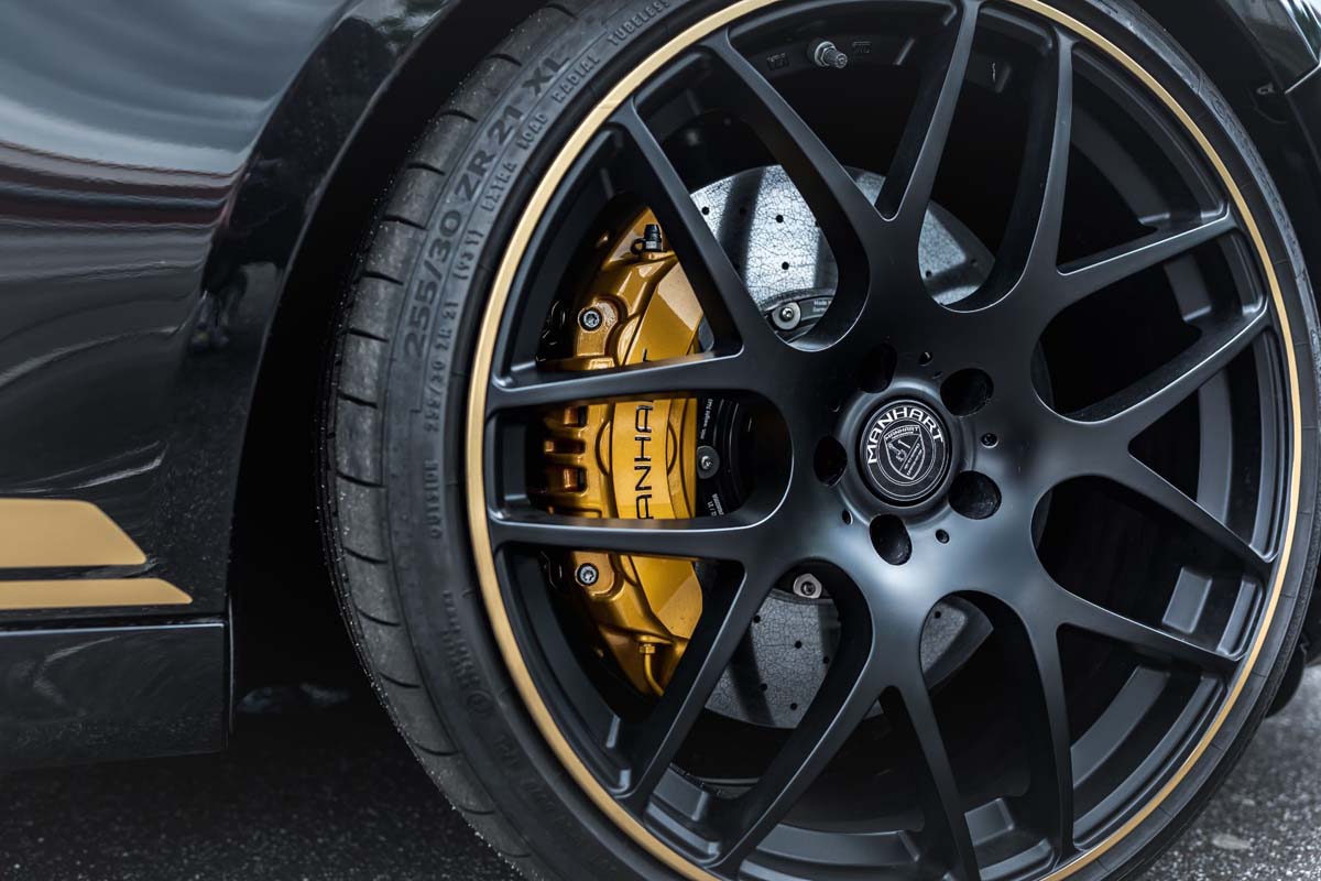 Manhart also improved the appearance as usual: In the wheel housings sit in-house Classic Line rims in the dimensions 9×21 and 10.5×21 inches with tyres in 255/30 ZR21 and 295/25 ZR21. On the vehicle shown, they have a typical MANHART finish in side matt black with golden decoration in the form of a decorative stripe on the rim edge. Alternatively, however, other individual colour configurations are also possible on request. To round things off, the ER 800 wears a black radiator grille and – as is also customary with MANHART creations – a golden set of decorations with decorative stripes and lettering on the black-painted body.