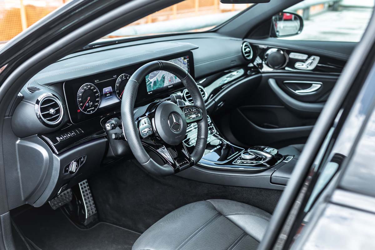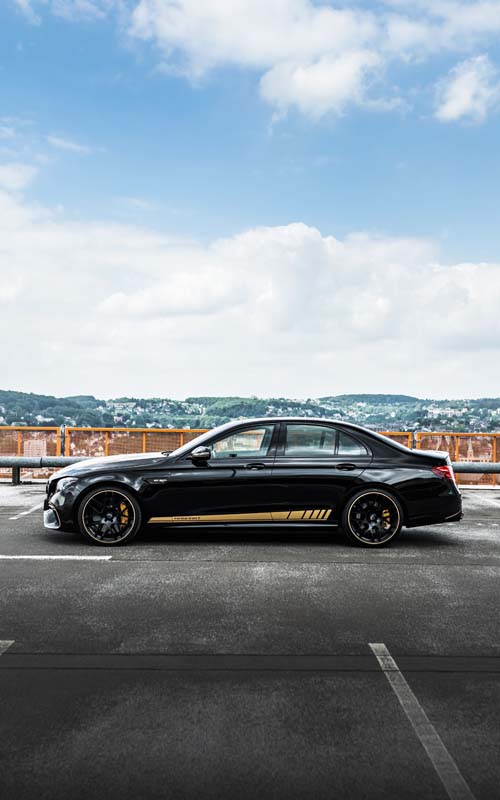 The AMG version of the E-Class already produces 571hp, (E 63) or 612hp (E 63 S) in standard condition. This output, which is by no means weak, is not only a good starting point on the way to significantly more power: as the new vehicle designation already indicates, the AMG’s four-litre, biturbo V8 receives a whopping power increase, boosting to an impressive 809hp and 1,070Nm of maximum torque. This is achieved by a MANHART turbo upgrade, a MANHART intercooler as well as a MANHART carbon intake and MANHART ECU remapping. To upgrade the exhaust system, there are also supplementary MANHART sports downpipes with 300-cell catalytic converters, which do not have TÜV approval and are therefore only intended for export.