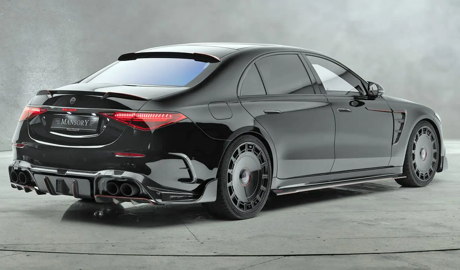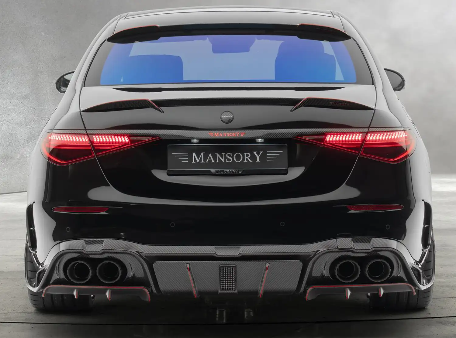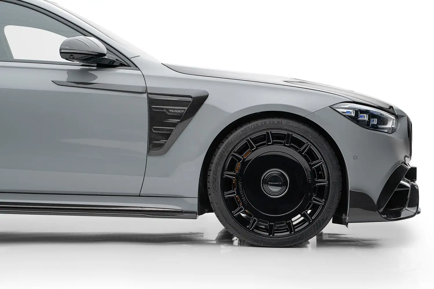 For this purpose, the front of the “Mercedes-AMG S 63 E PERFORMANCE by MANSORY” is redesigned with a completely new apron including integrated front lip and side flaps made of carbon. The ultra-light carbon bonnet with additional cooling air intakes in visible carbon completes the redesign of the front section. On the flanks, striking MANSORY side skirts made of full carbon ensure the continuation of the design language and give the “Mercedes-AMG S 63 E PERFORMANCE by MANSORY” a significantly more powerful, but also lower and more elongated appearance.
