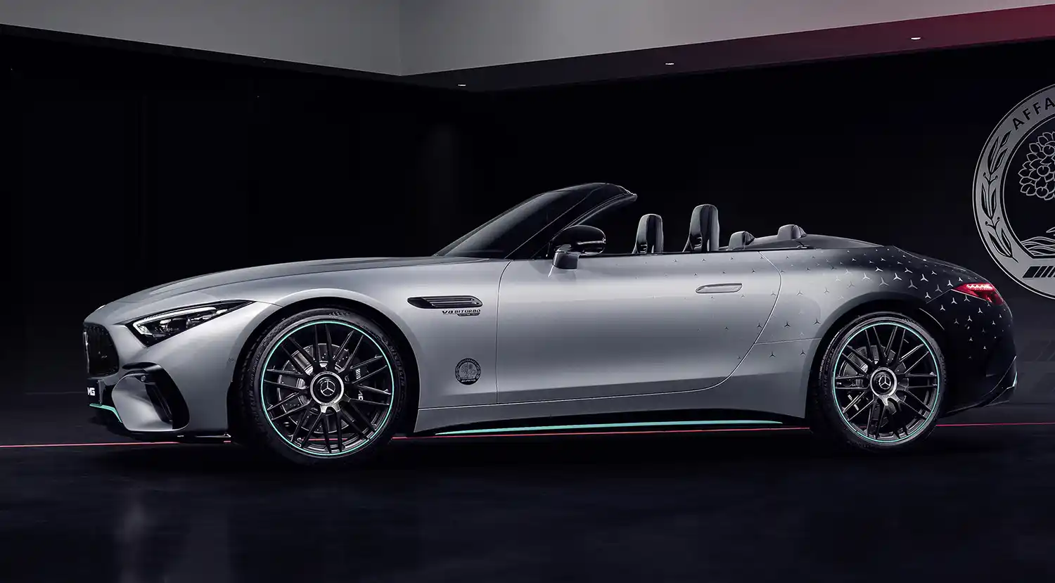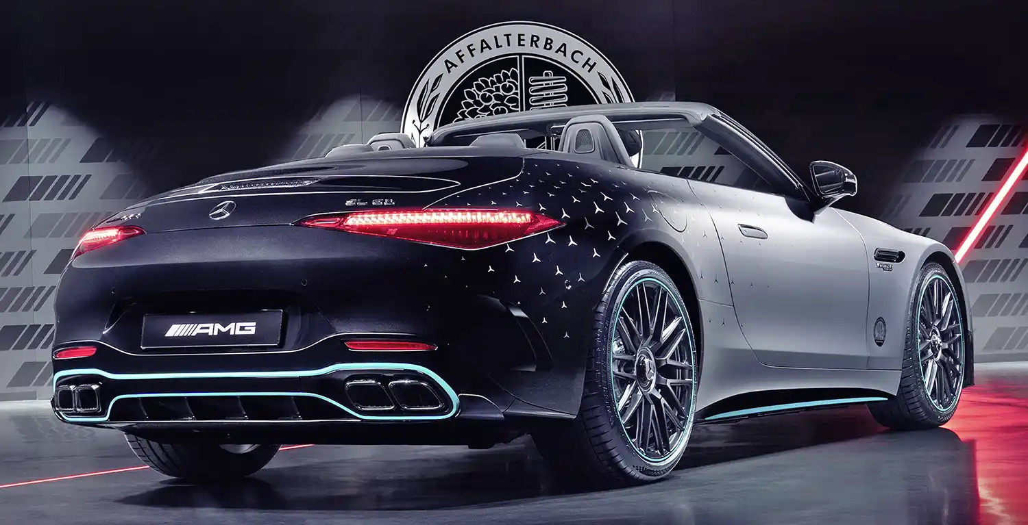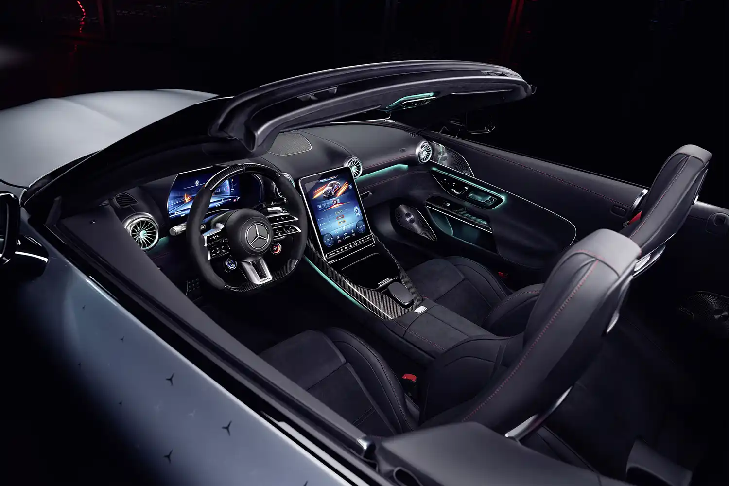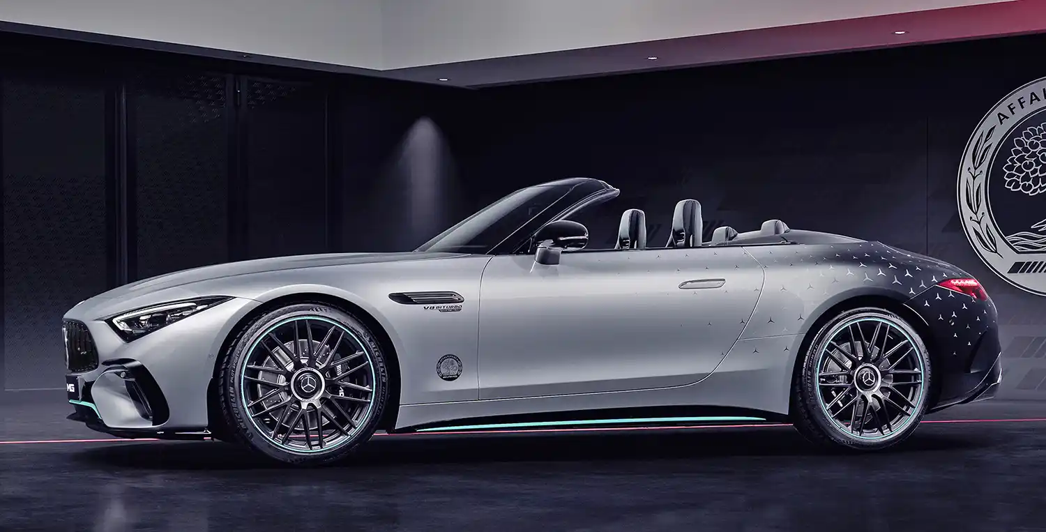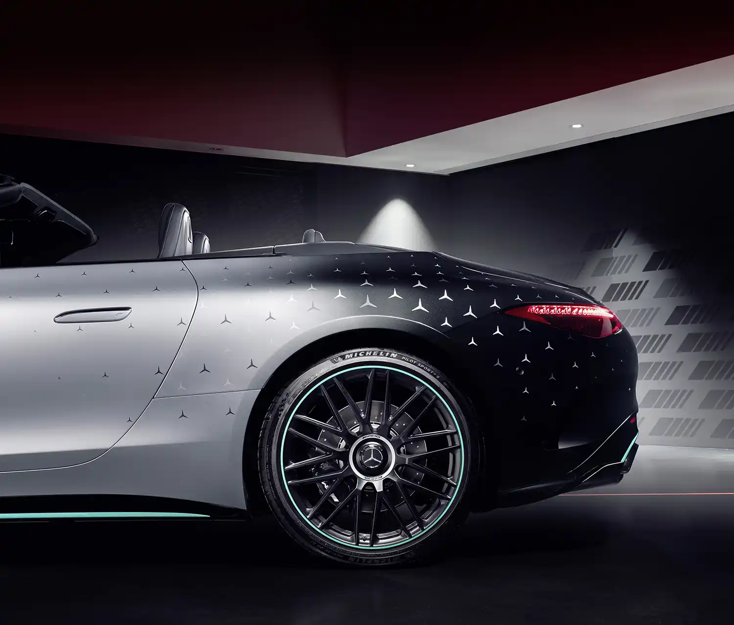 To mark the end of the 2022 Formula 1 season, Mercedes-AMG is presenting a special model of the SL 63 4MATIC+ (combined fuel consumption: 13.2–12.8 l/100 km, combined CO2 emissions: 300‑291 g/km)[1]. It reflects the look of the Mercedes-AMG F1 W12 E PERFORMANCE racing car. The colour graduation from high-tech silver metallic to obsidian black metallic is inspired by the model from the top class of motorsport. The same is true of the star pattern on the vehicle flanks and the PETRONAS-coloured contrasts: these can be found on the front apron, side sill panels and rear diffuser. Added to this are 21-inch AMG 10-twin-spoke forged wheels in a matt black finish with PETRONAS-coloured rim flanges. The electric soft top is in black.