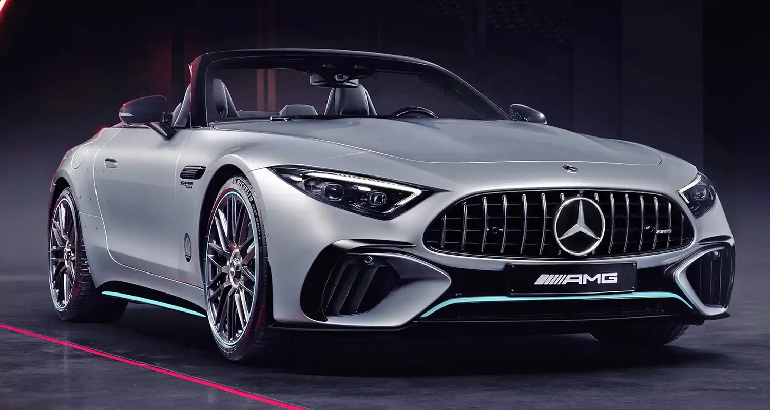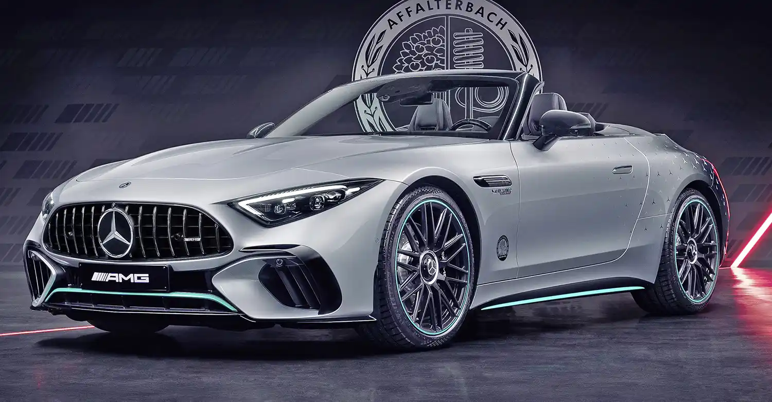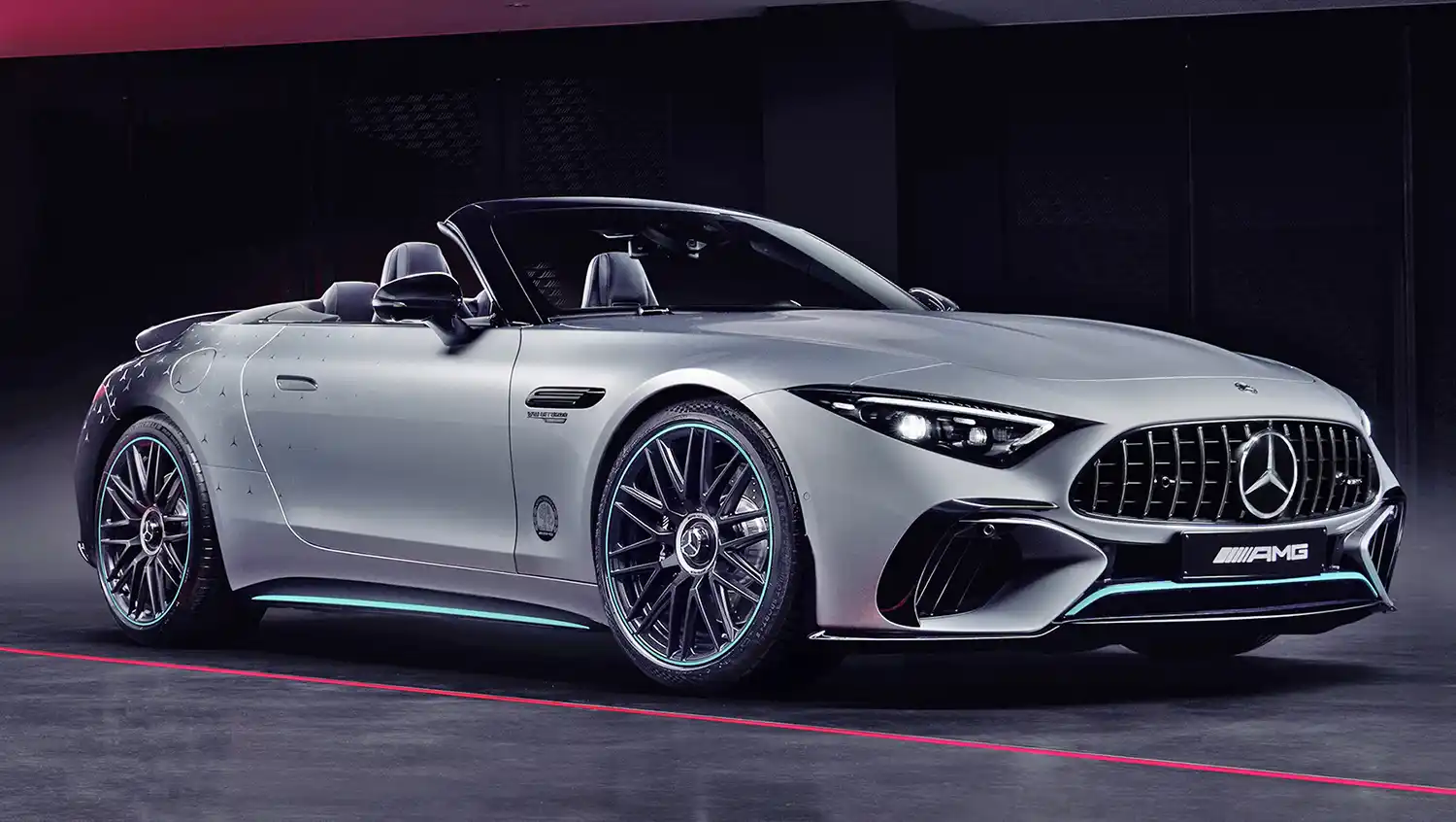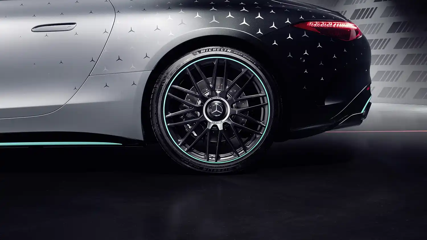 To mark the end of the 2022 Formula 1 season, Mercedes-AMG is presenting a special model of the SL 63 4MATIC+ (combined fuel consumption: 13.2–12.8 l/100 km, combined CO2 emissions: 300‑291 g/km)[1]. It reflects the look of the Mercedes-AMG F1 W12 E PERFORMANCE racing car. The colour graduation from high-tech silver metallic to obsidian black metallic is inspired by the model from the top class of motorsport. The same is true of the star pattern on the vehicle flanks and the PETRONAS-coloured contrasts: these can be found on the front apron, side sill panels and rear diffuser. Added to this are 21-inch AMG 10-twin-spoke forged wheels in a matt black finish with PETRONAS-coloured rim flanges. The electric soft top is in black.