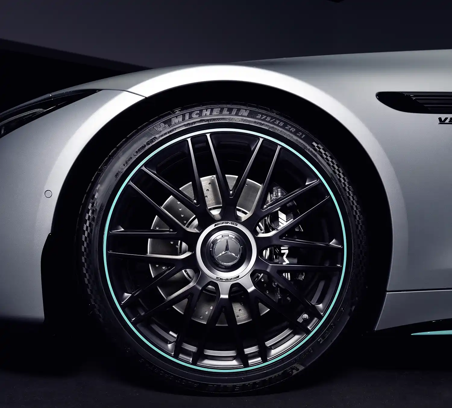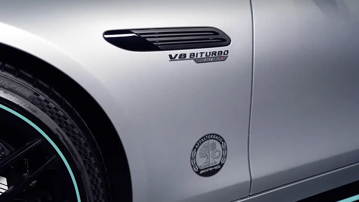 The AMG Night package and the AMG Night package II enhance the visual appearance of the “Motorsport Collectors Edition”. With the AMG Night package, selected exterior features are finished in high‑gloss black: the front splitter, side sill panels, mirror caps and the decorative trim in the rear diffuser. Added to this are darkened exhaust tailpipes. The AMG Night package II adds further features in black chrome, including the radiator grille, typography and Mercedes star at the rear. In addition, the interior components of the headlamps and rear lights are darkened. The brake callipers of the AMG high-performance composite brake system are also painted black. The AMG fuel filler cap in silver chrome with “AMG” lettering also emphasises the special status of the edition.