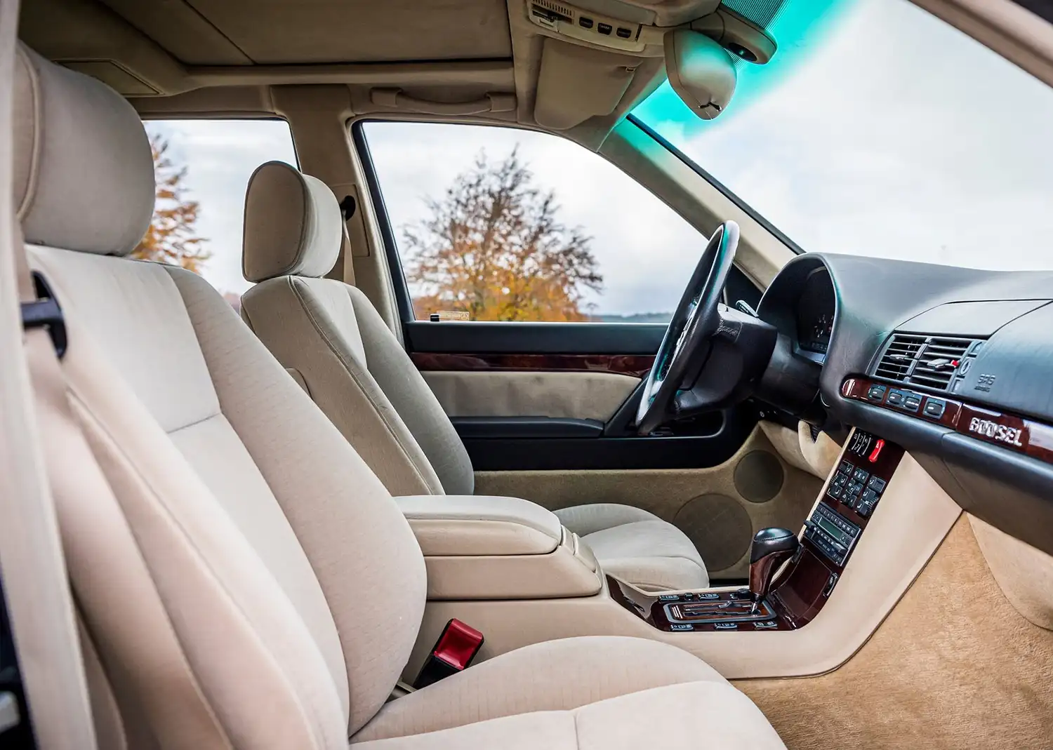 The W140 introduced a reimagined radiator grille, maintaining the classic design while integrating it into the bonnet with a narrower chrome frame. This design shift placed the iconic Mercedes star slightly back on the bonnet, enhancing the vehicle’s streamlined appearance. In addition to aesthetic changes, the ride quality saw significant improvements. The W140 featured reduced tyre noise and vibrations, contributing to a notably quieter and more serene cabin experience. The use of insulating glass panes was a first for Mercedes-Benz, effectively preventing condensation and improving both noise and thermal insulation.