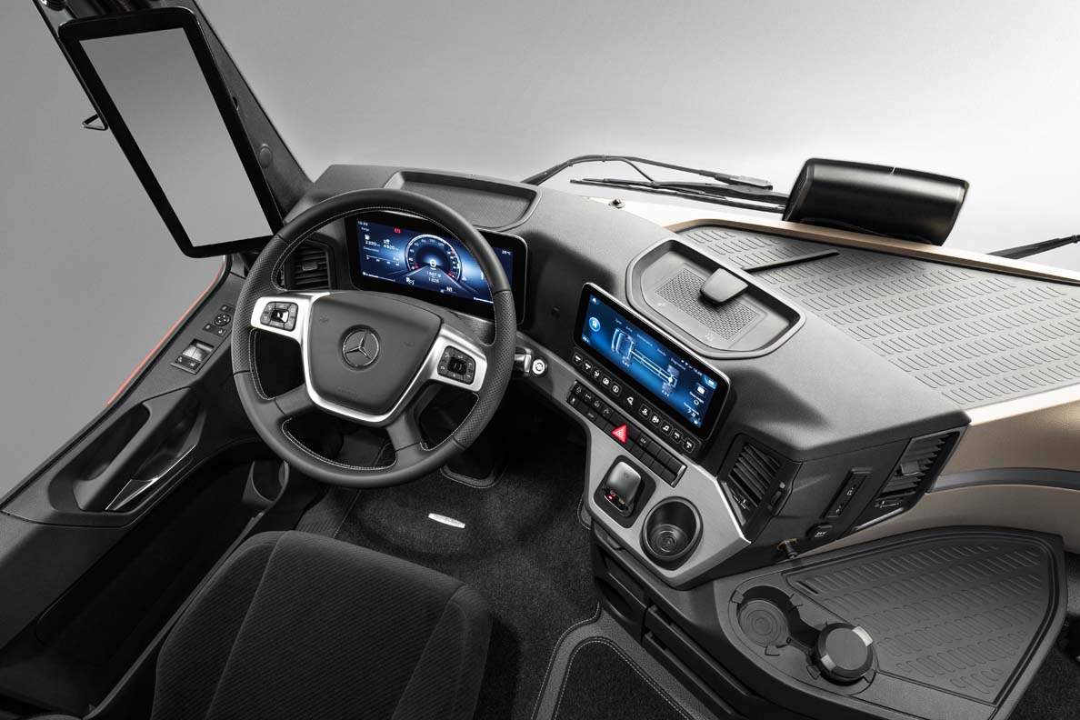 If you decide to purchase the Multimedia Cockpit Interactive as an upgrade to the standard version, you also receive fast access to the Mercedes-Benz Truck App Portal. This enables haulage companies to harness the new opportunities of connectivity and equip their vehicles with efficiency- and comfort-enhancing apps such as telematics services from FleetBoard. The individually combinable services enable intelligent networking of drivers, fleet and orders. All of them help to optimise consumption, reduce wear and increase vehicle utilisation. The Fleetboard Performance Analysis, for example, enables driving behaviour to be evaluated and optimised, Fleetboard Time Management provides a detailed insight into the driver’s driving times and break times, while Fleetboard Mapping displays the status and position of the vehicles. And with Fleetboard Driver Card and Mass Memory Download, it is possible to read, transmit and save all relevant data remotely.