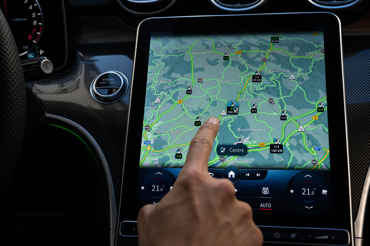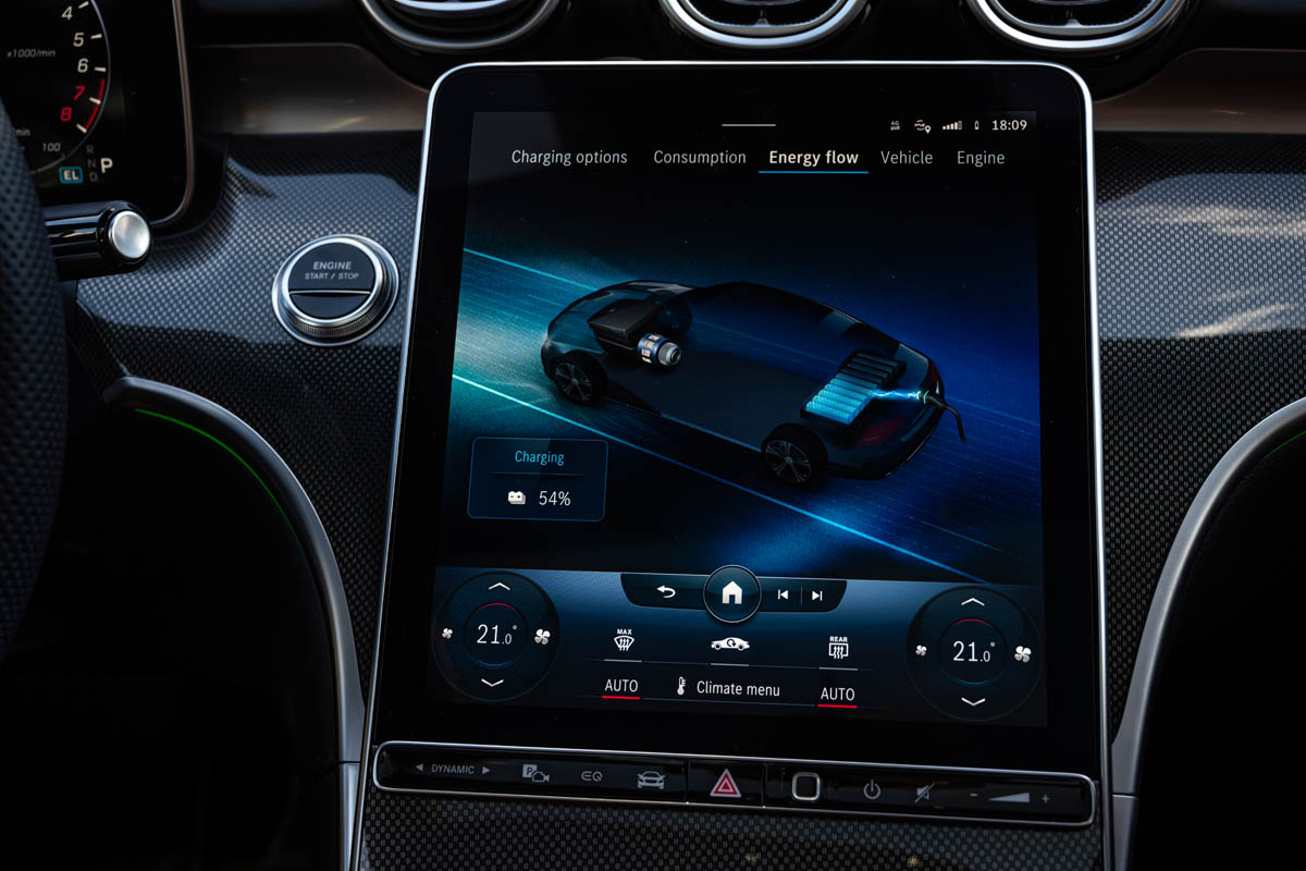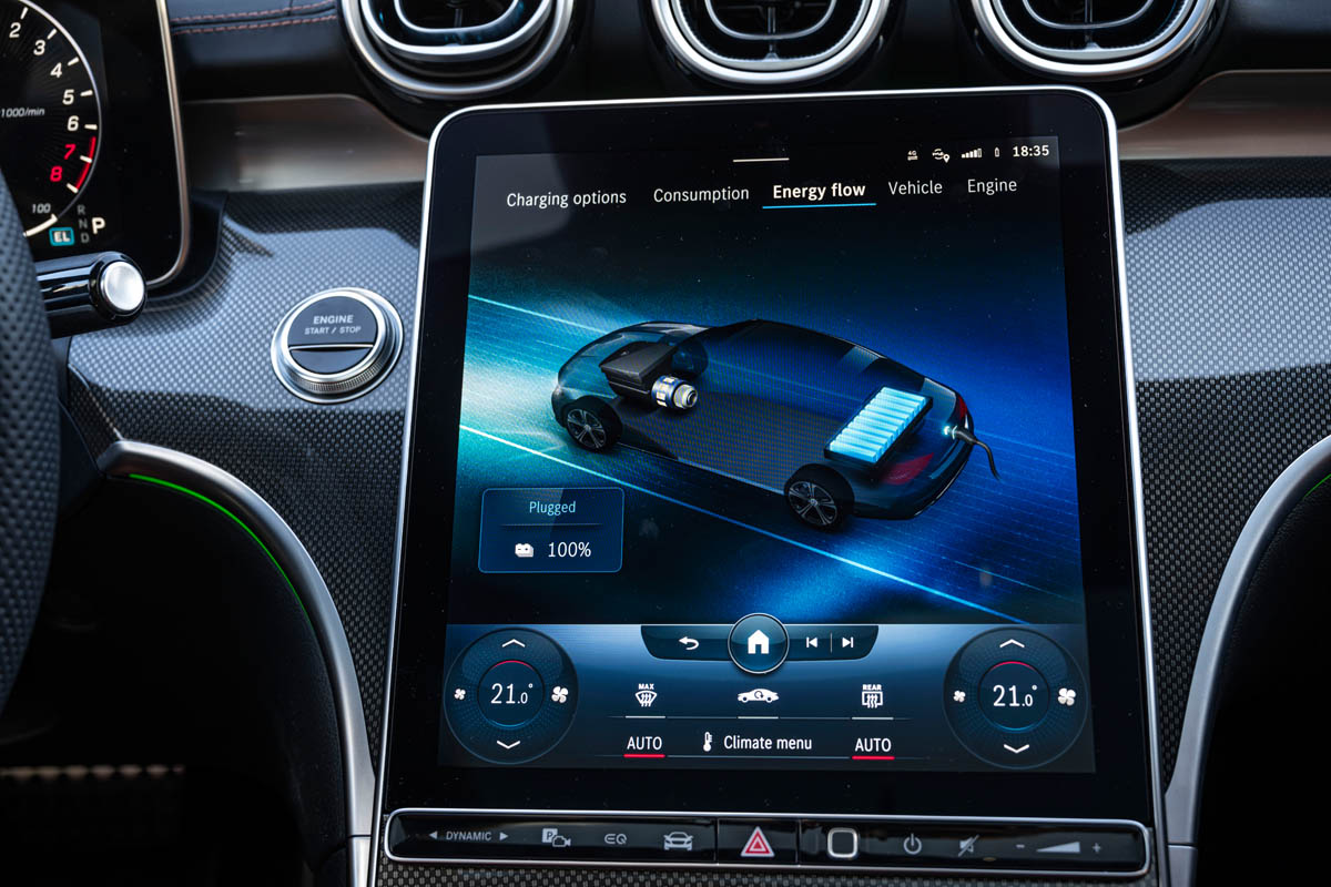 Considering the electric range increased to more than 100 km and the electric output of 95 kW (129 hp), everyday routes can for the most part be covered in all-electric mode without using the combustion engine. This is the two-litre variant of the ultra-modern M 254 four-cylinder petrol engine. Thanks to recuperation, kinetic energy is recovered when decelerating or driving downhill. The energy recovery output is now over 100 kW.