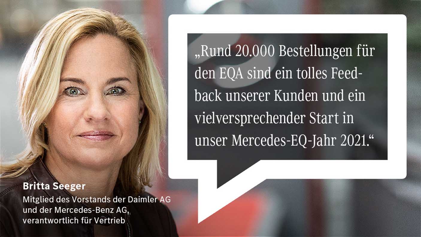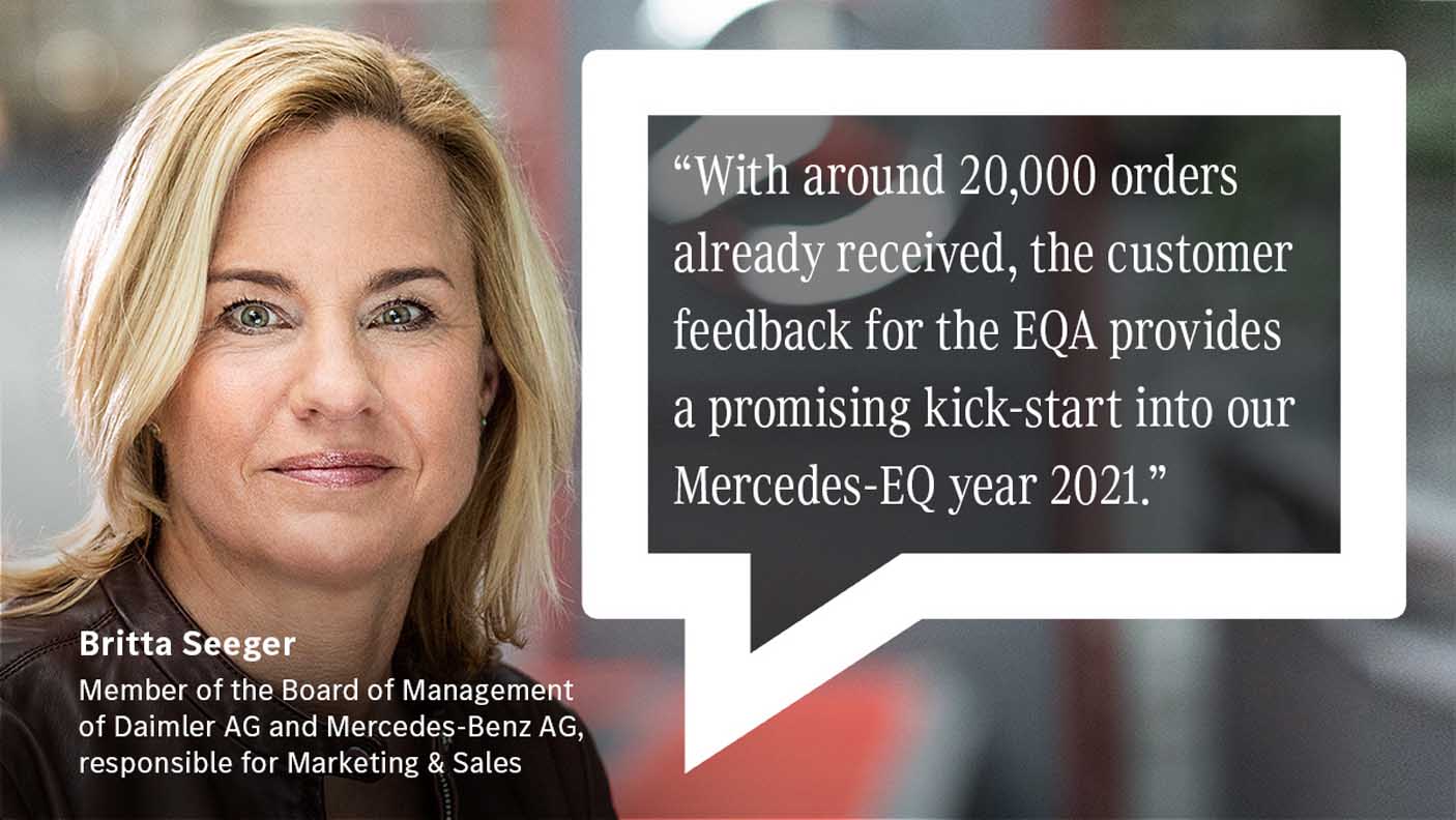 The EQA, presented in January, achieved a high level of order intake and customer inquiries. “With around 20,000 orders already received, the customer feedback for the EQA provides a promising kick-start into our Mercedes-EQ year 2021”, stated Britta Seeger, Member of the Board of Management of Daimler AG and Mercedes‑Benz AG responsible for Marketing and Sales. First deliveries of the EQA started at the end of March.
