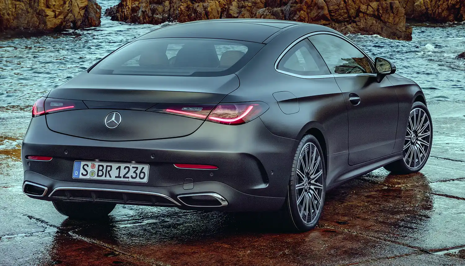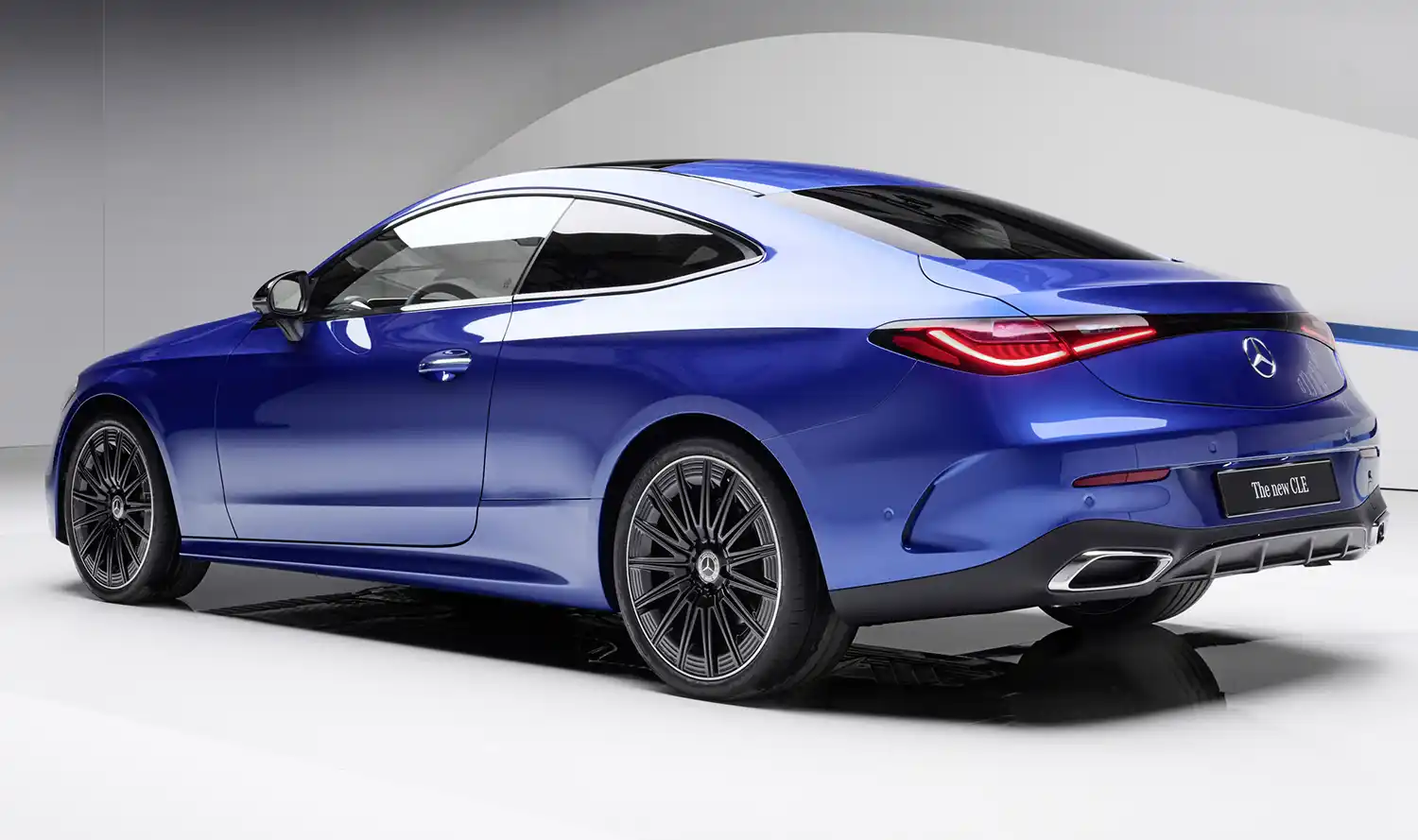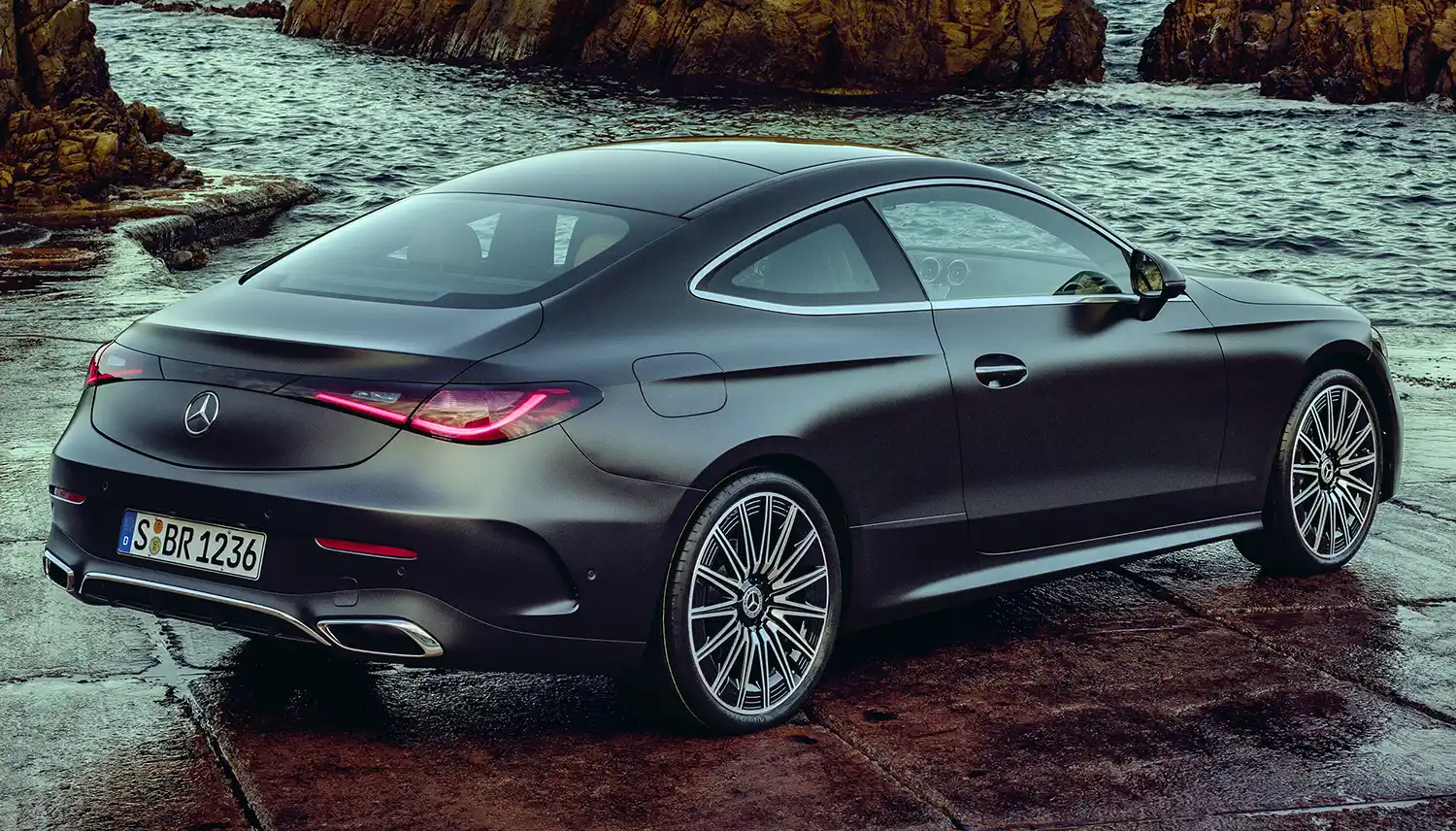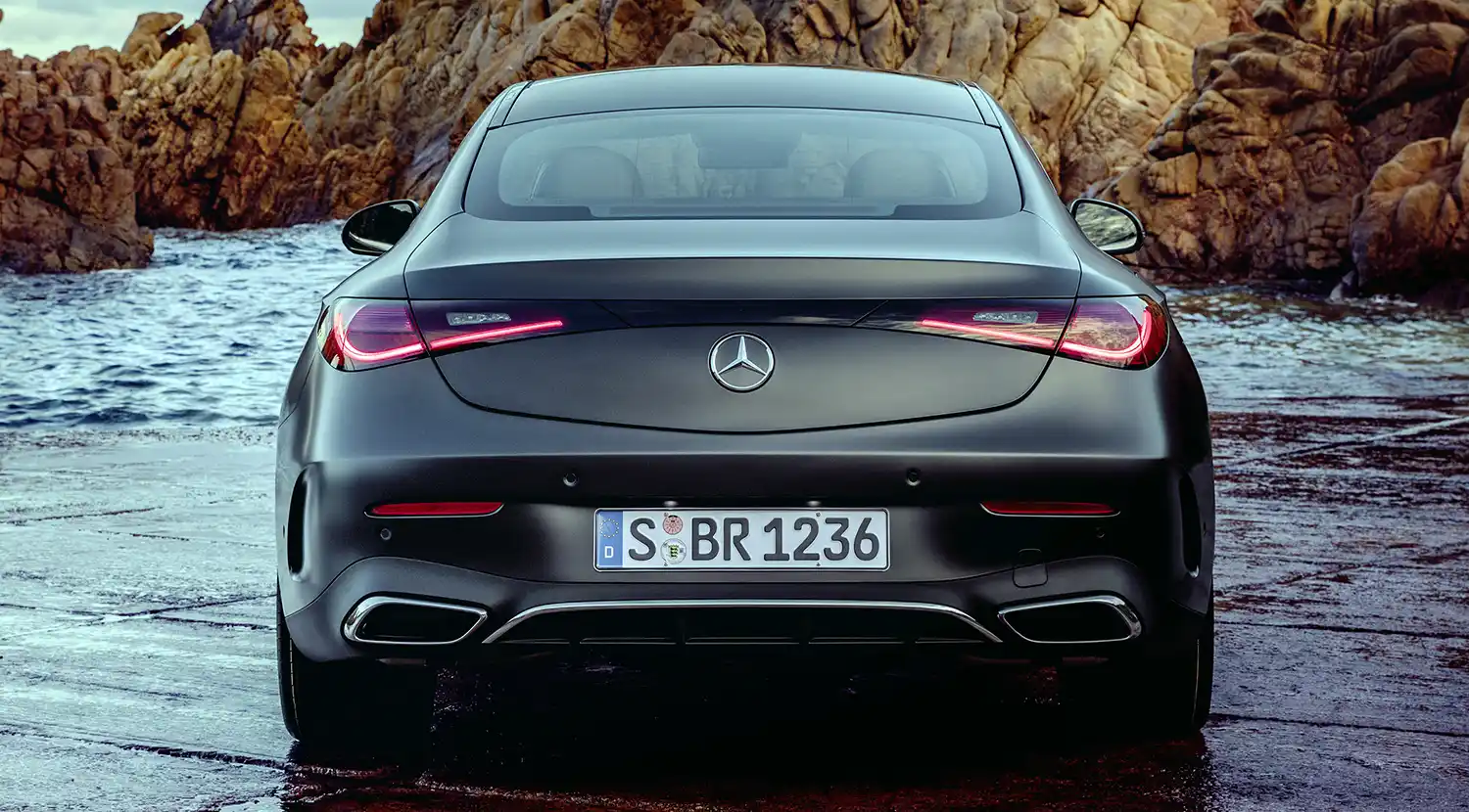 The new Mercedes-Benz CLE Coupé embodies an emotional statement from every perspective. The sporty, elegant two-door unites proportions typical of a coupé with the modern design language of Mercedes-Benz, whose aesthetic soul is shaped by the design philosophy of Sensual Purity. This creates a sculptural appearance for the CLE Coupé, which is characterised by flowing surfaces with seamless transitions. The progressive dynamics and elegance come into their own when viewed from the side: thanks to the combination of a low silhouette (1,428 mm) with a long wheelbase (2,865 mm), short overhangs (888 mm at the front/1,097 mm at the rear) and a particularly muscular shoulder the two-door fills the road. Other typical coupé features are the long bonnet embedded in the front end with two powerful power domes, the steeply sloping windscreen and the long, sloping roof towards the rear. The passenger cell, which is set far back, leads to the sporty, short rear via the rear window, which is also set flat.