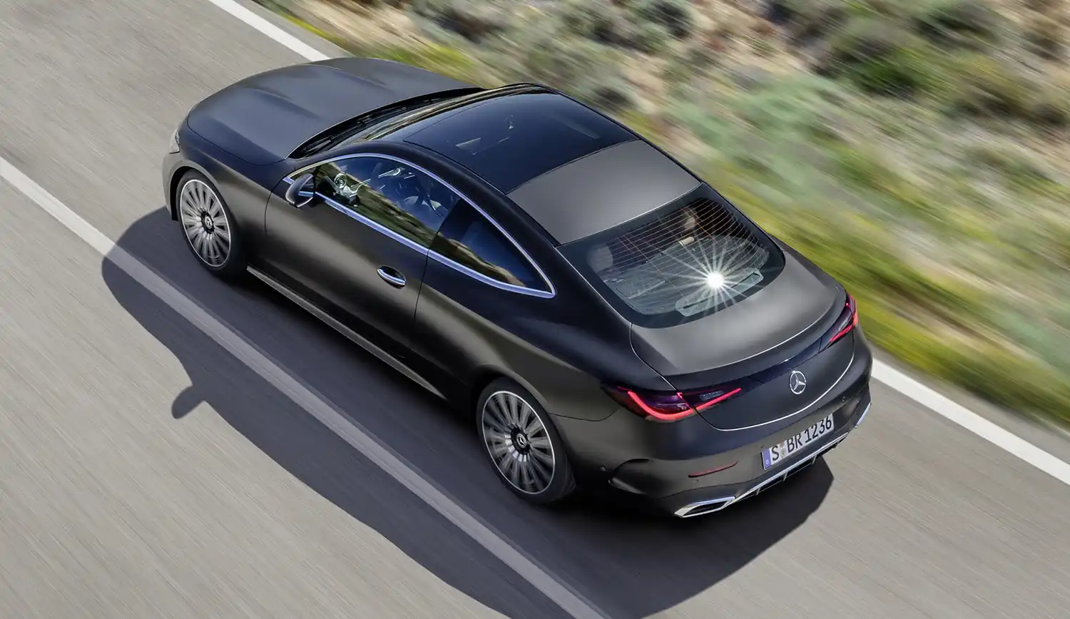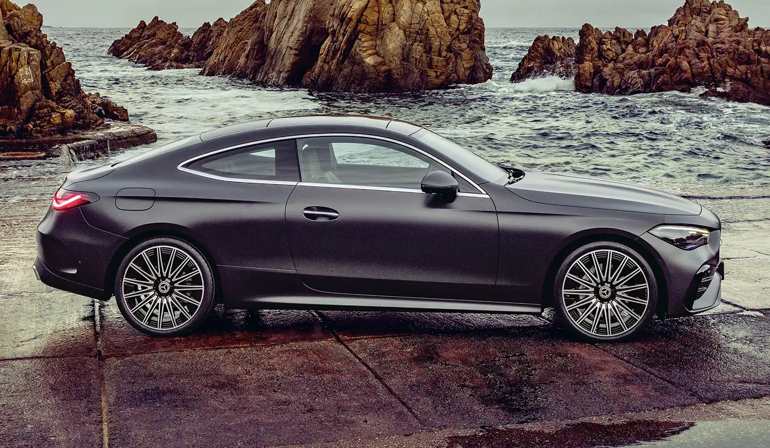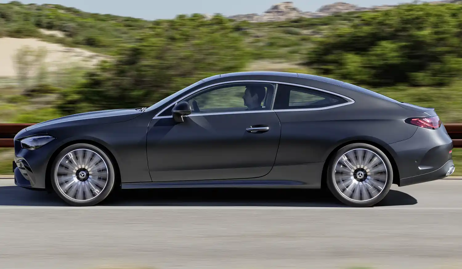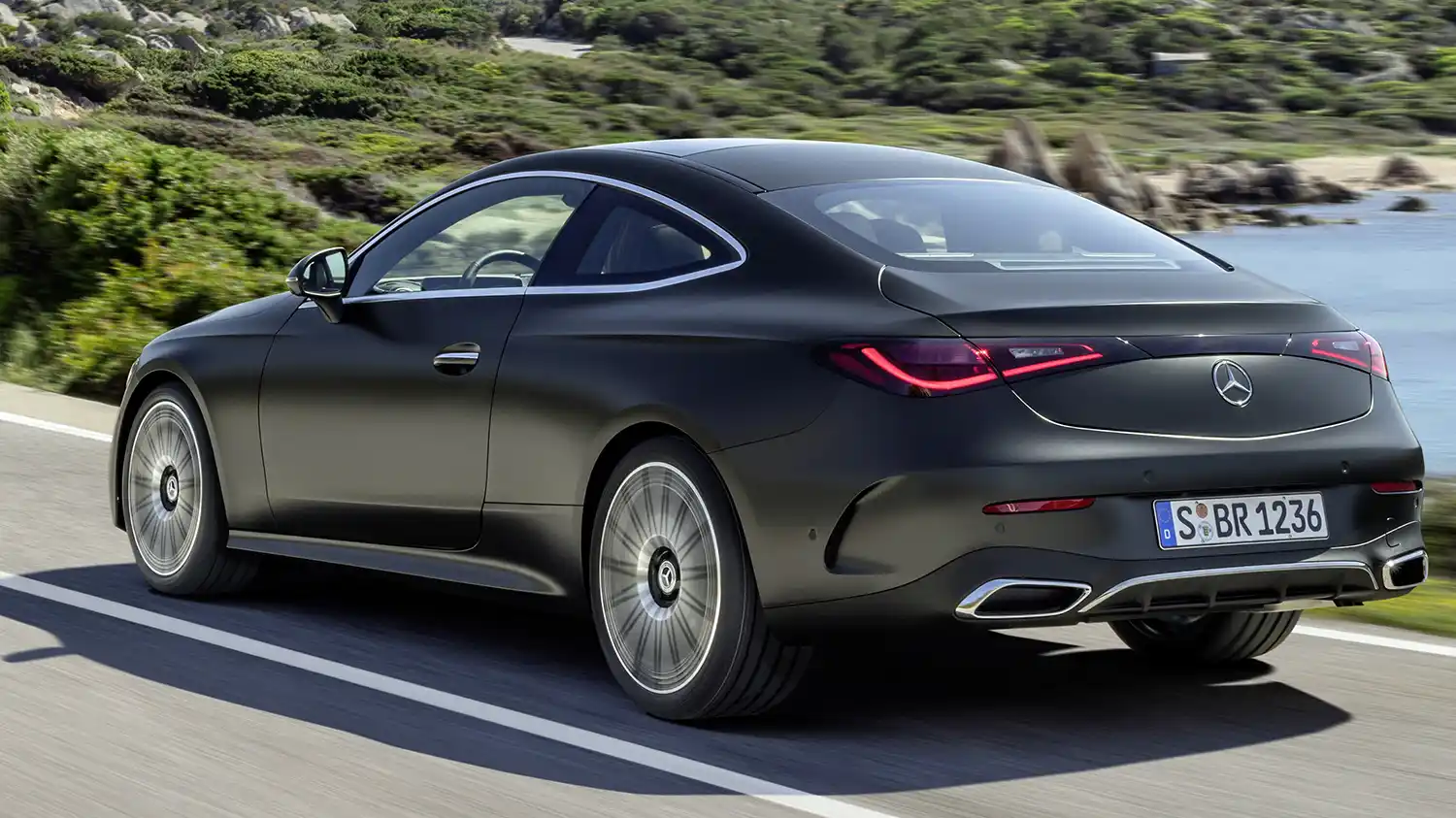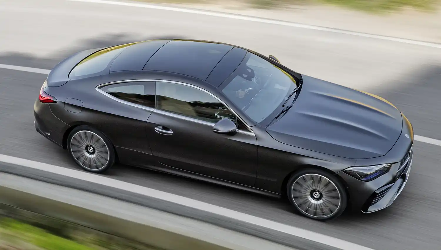 The new Mercedes-Benz CLE Coupé embodies an emotional statement from every perspective. The sporty, elegant two-door unites proportions typical of a coupé with the modern design language of Mercedes-Benz, whose aesthetic soul is shaped by the design philosophy of Sensual Purity. This creates a sculptural appearance for the CLE Coupé, which is characterised by flowing surfaces with seamless transitions. The progressive dynamics and elegance come into their own when viewed from the side: thanks to the combination of a low silhouette (1,428 mm) with a long wheelbase (2,865 mm), short overhangs (888 mm at the front/1,097 mm at the rear) and a particularly muscular shoulder the two-door fills the road. Other typical coupé features are the long bonnet embedded in the front end with two powerful power domes, the steeply sloping windscreen and the long, sloping roof towards the rear. The passenger cell, which is set far back, leads to the sporty, short rear via the rear window, which is also set flat.