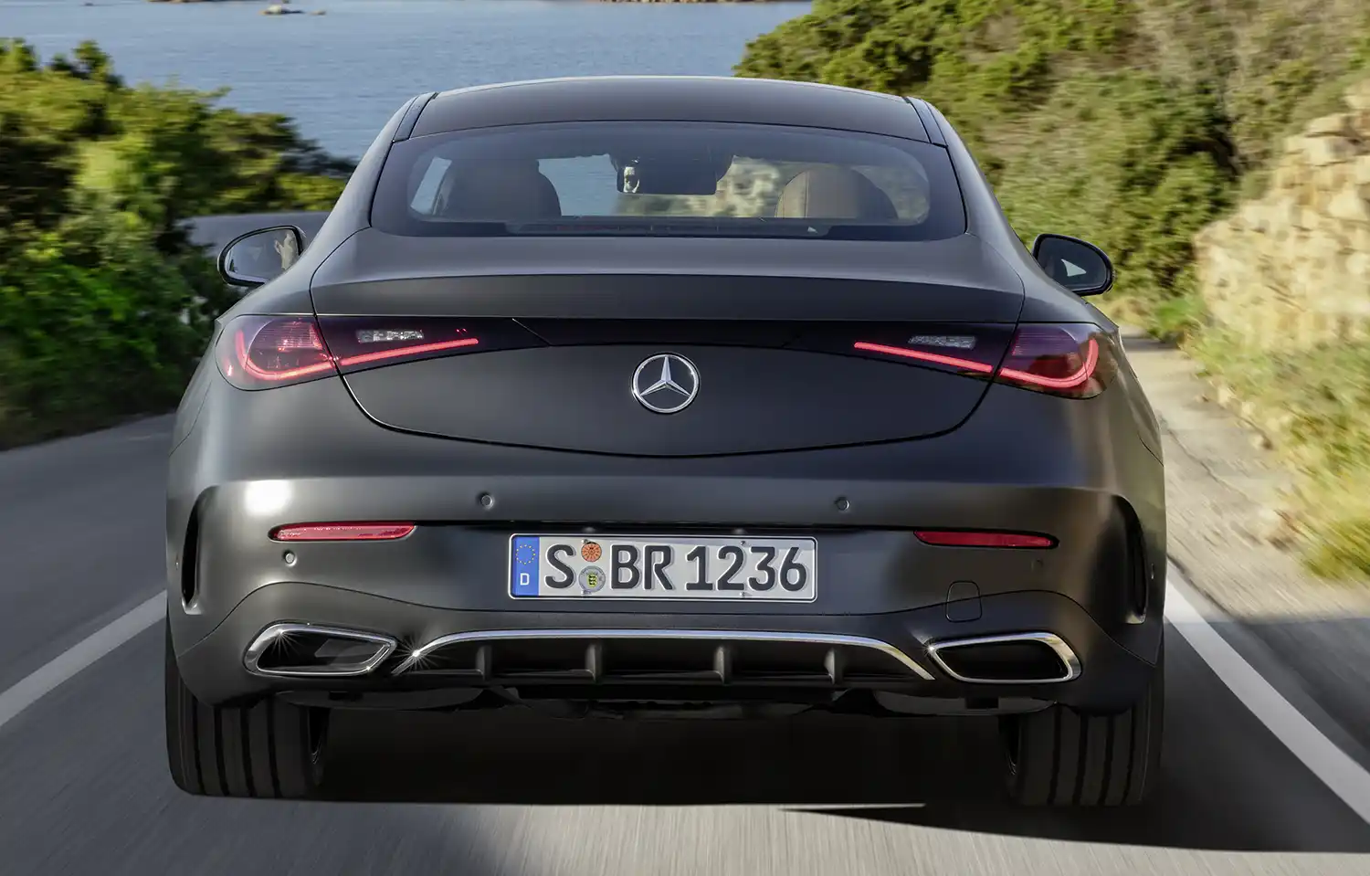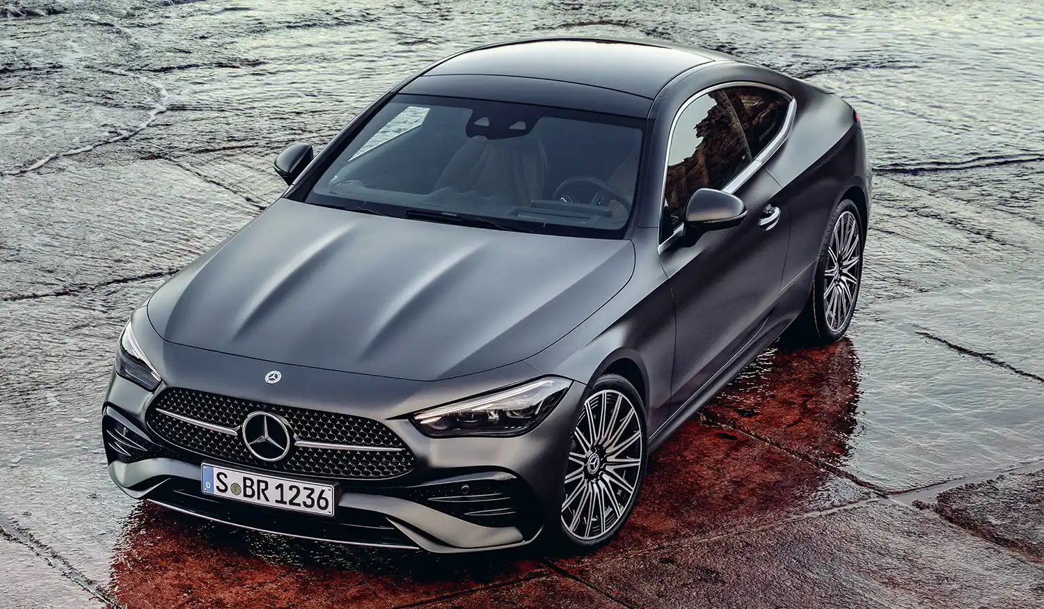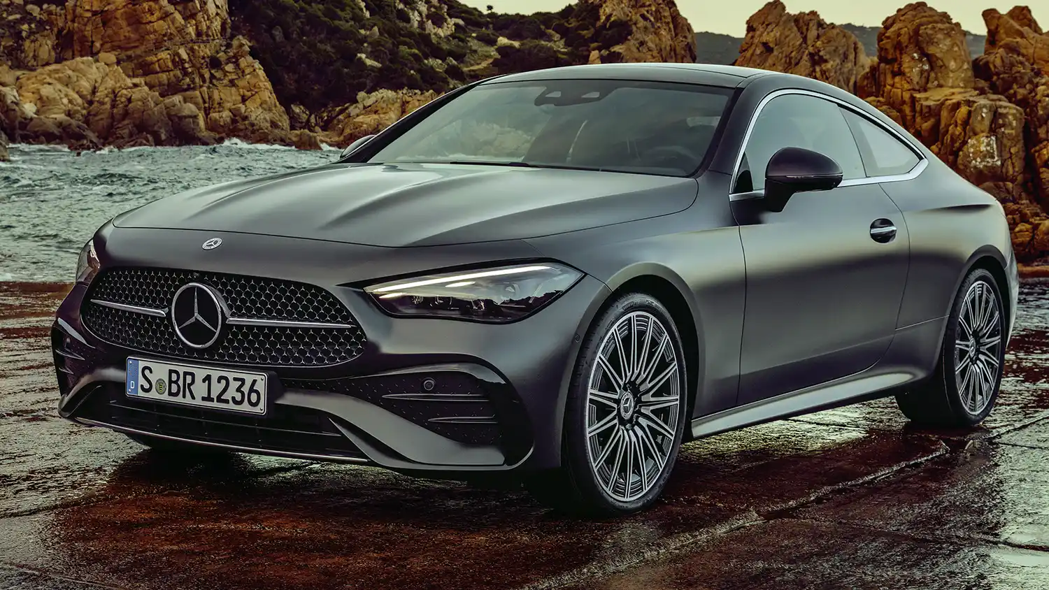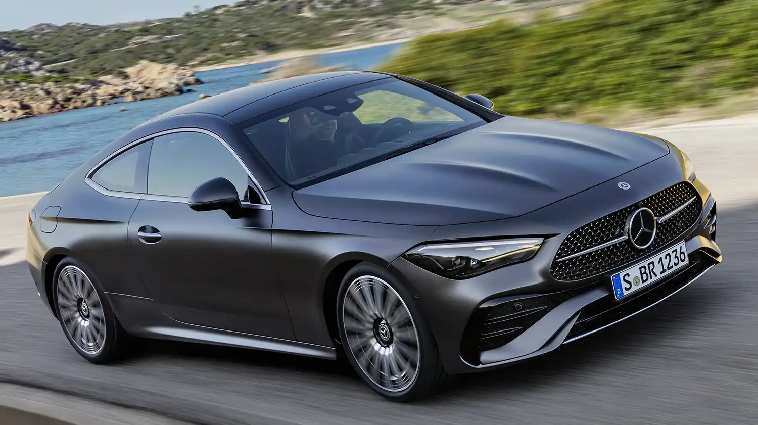 The new Mercedes-Benz CLE Coupé embodies an emotional statement from every perspective. The sporty, elegant two-door unites proportions typical of a coupé with the modern design language of Mercedes-Benz, whose aesthetic soul is shaped by the design philosophy of Sensual Purity. This creates a sculptural appearance for the CLE Coupé, which is characterised by flowing surfaces with seamless transitions. The progressive dynamics and elegance come into their own when viewed from the side: thanks to the combination of a low silhouette (1,428 mm) with a long wheelbase (2,865 mm), short overhangs (888 mm at the front/1,097 mm at the rear) and a particularly muscular shoulder the two-door fills the road. Other typical coupé features are the long bonnet embedded in the front end with two powerful power domes, the steeply sloping windscreen and the long, sloping roof towards the rear. The passenger cell, which is set far back, leads to the sporty, short rear via the rear window, which is also set flat.