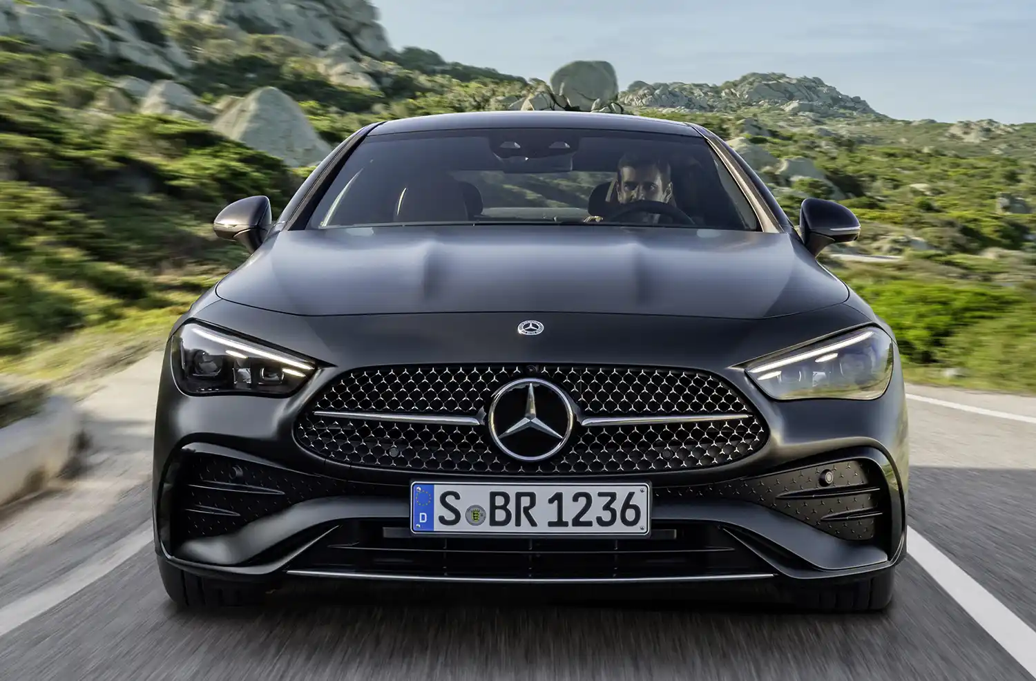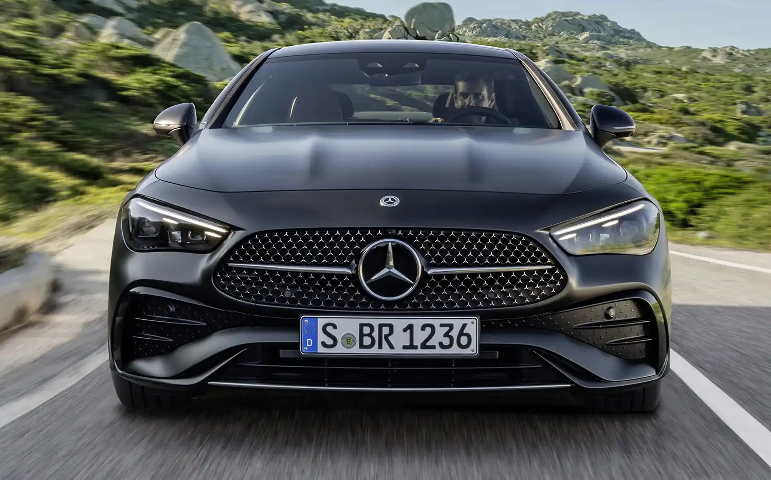The progressively forward-leaning front section (“shark nose”) with a low-slung bonnet, flat LED headlights with a unique design and a distinctive radiator grille ensure a decidedly athletic yet extremely elegant appearance. The strongly contoured power domes on the long hood reference the powerful engines with up to six cylinders. As is typical for coupés, the radiator grille has a single louvre in glossy black with chrome trim and a central star. Behind it shines a grille in a newly designed, three-dimensional chrome look with a Mercedes-Benz pattern. The downward-opening silhouette of the radiator grille (A-shape design) also emphasises the powerful forward drive of the Mercedes-Benz CLE Coupé. Together with the chrome frame around the shiny black central air intake in the front apron, it makes the two-door look lower and nestle closer to the road.