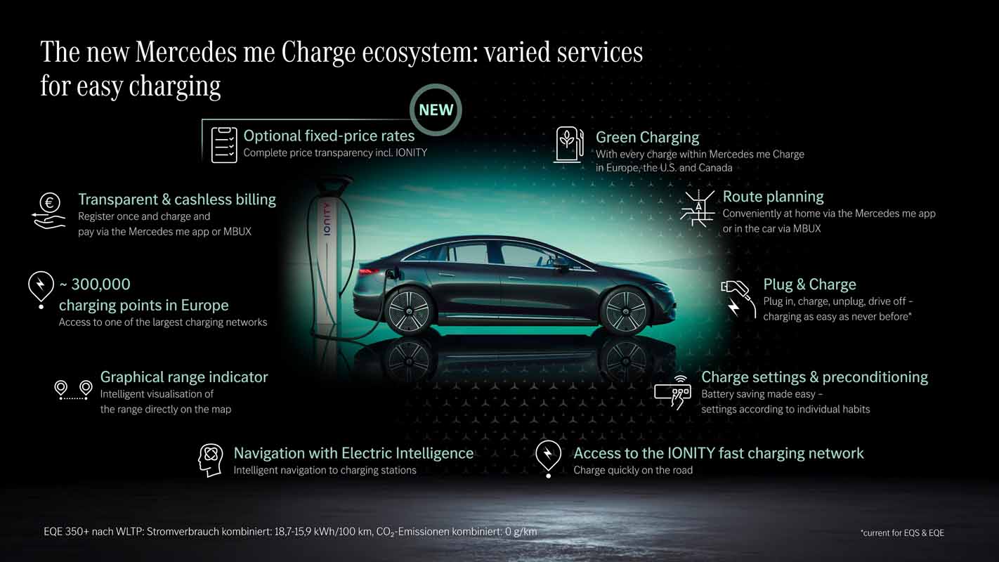 Mercedes me Charge allows its customers to charge with green electricity at any public charging station throughout Europe, the USA and Canada. Green Charging works by subsequently balancing a charging process with energy from renewable resources. This ensures that equivalent quantities of green energy are fed into the electric grid after the charging process is complete. For this purpose, high-quality guarantees of origin are used, which verifiably certify the origin of the energy and serve as a kind of birth certificate for electricity coming from renewable energy sources. Green electricity is defined and marked by the EKOenergy eco-label, which is given only by certified energy plants. In addition, incentives are created to invest in renewable energy plants. Mercedes me Charge also includes more than 1,500 charging points that run exclusively on green electricity. These are part of the IONITY fast charging network, co-founded by Mercedes-Benz in 2017, located along Europe’s major roads and motorways.