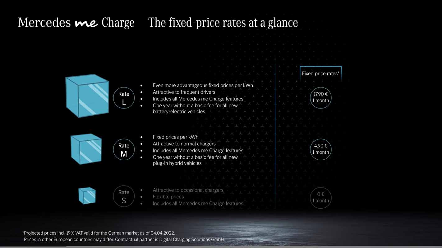 All charging points of the Mercedes me Charge network can be used without a monthly basic fee. The costs for charging depend on the terms of the respective charging network operator. Tariff S is particularly interesting for customers who mainly charge at their own wallbox charger at home, or at their workplace, and who only occasionally want to benefit from the convenience of having access to one of the largest charging networks.