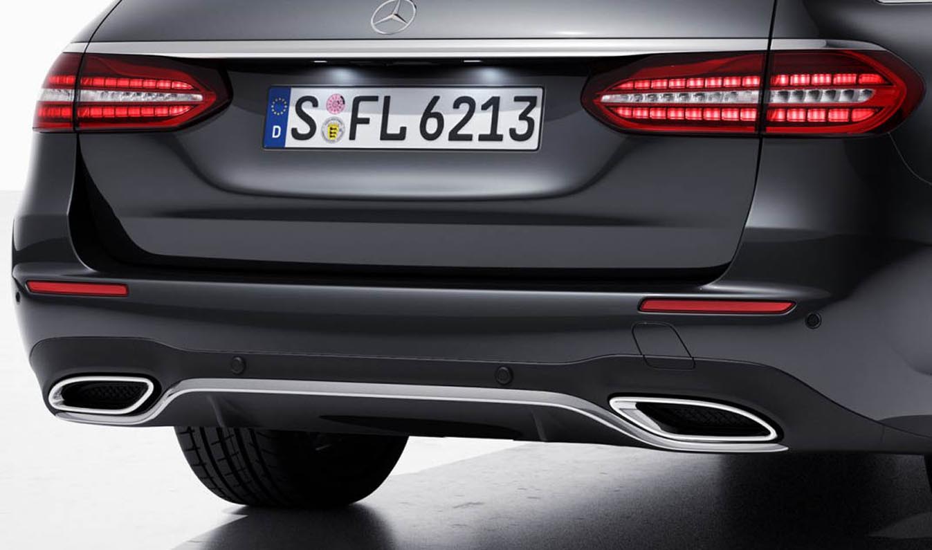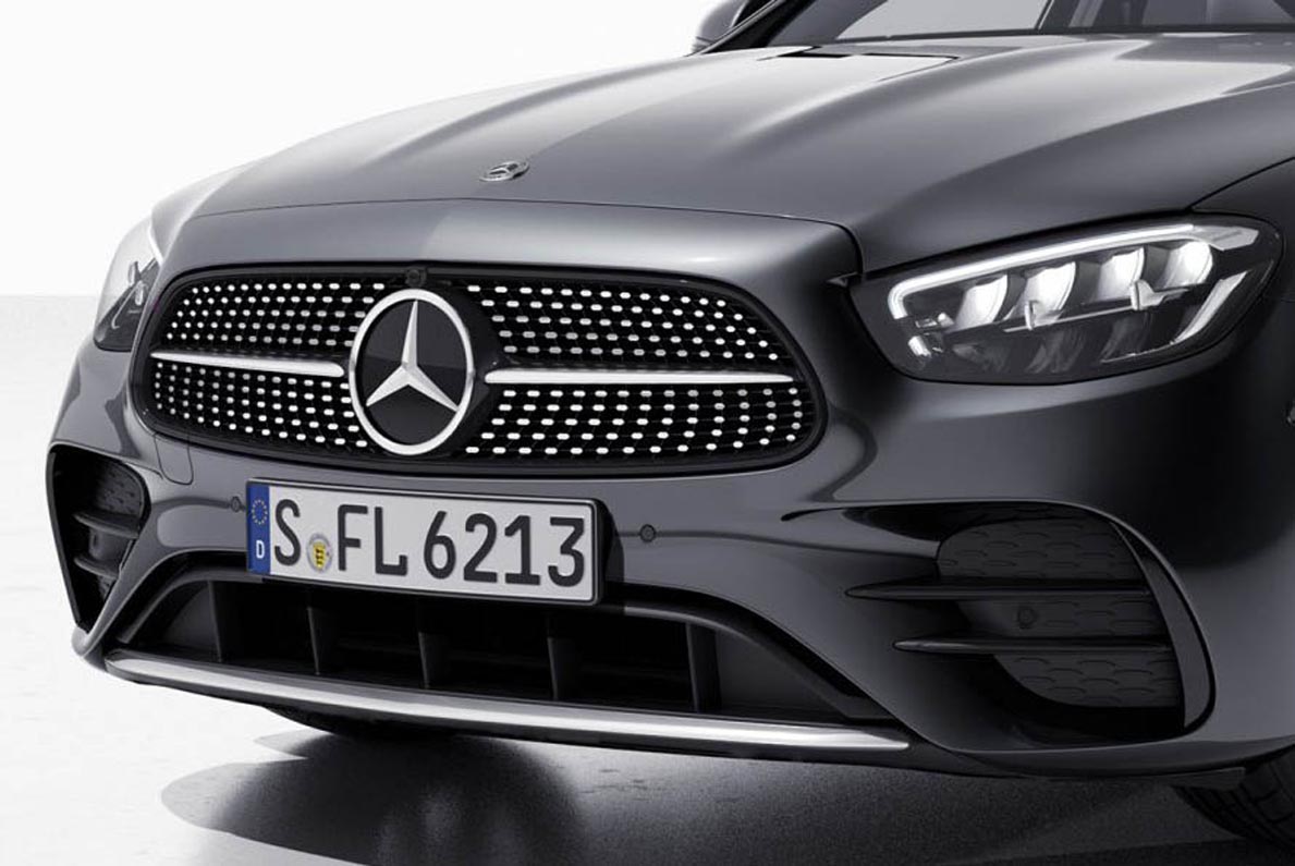 The enhanced dynamics and the upgrade of the Mercedes-Benz E-Class are reflected in the model range: Now the entry-level model already comes with the sporty Avantgarde Line exterior. As a result, the base model of the E-Class features a central star at the front for the first time. The new front end with increased chrome content plays a role in the fresh appearance: The grille of the Avantgarde Line was redesigned with two chrome louvres and vertical high-gloss black struts. Chrome and high-gloss black trim elements in the front bumper underscore the sporty and elegant appearance. The likewise available Exclusive Line lives up to its name: The special grille, the upright star on the bonnet and the large chrome elements in the front bumper emphasise this positioning.