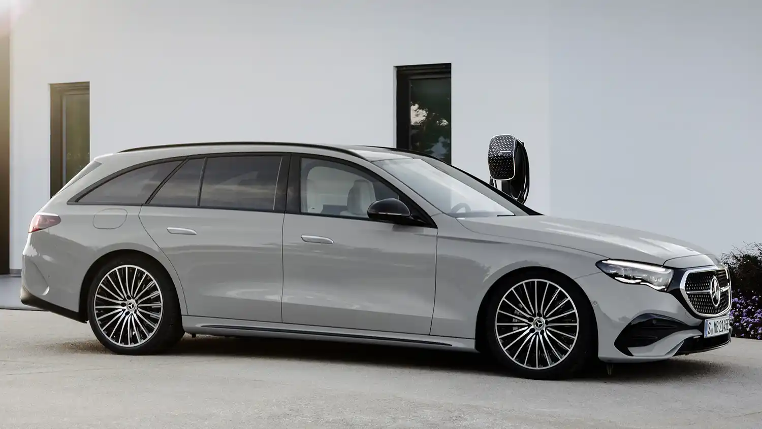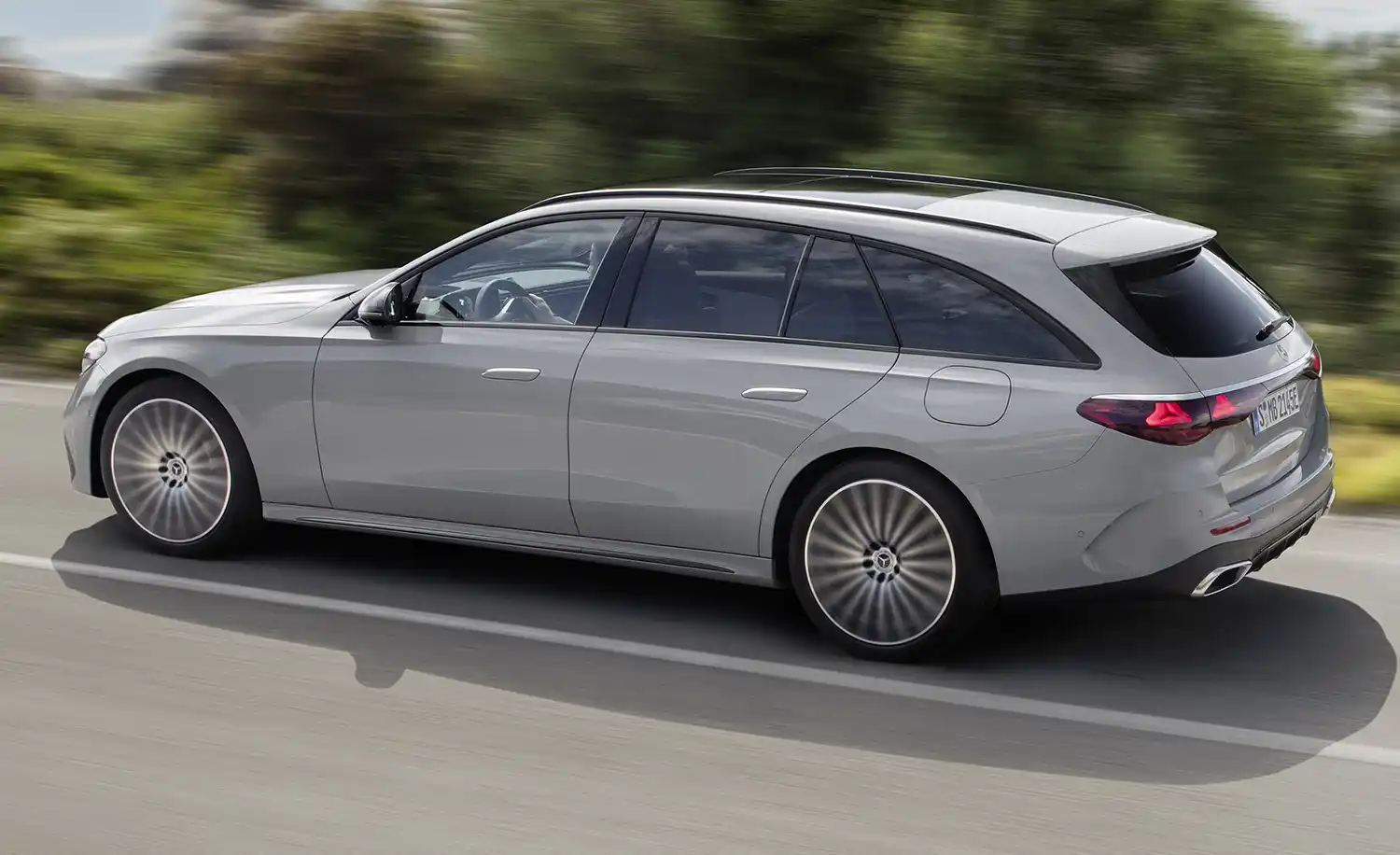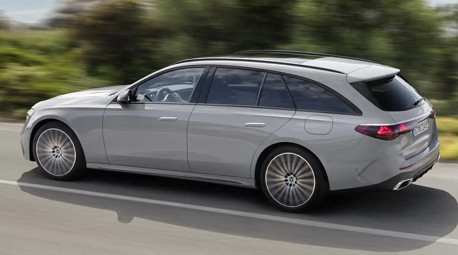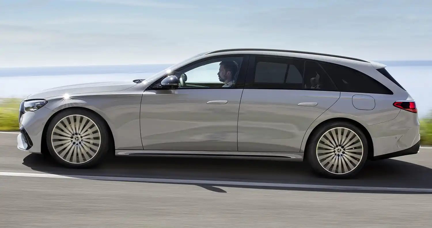 With its distinctive side profile, the Estate clearly sets itself apart from the competition. The two character lines familiar from the Saloon create a powerfully stretched car body and give the Estate a sporty and stylish appearance. Sophisticated, three-dimensional and optimised down to the last detail, the surface finish exudes elegance. The E-Class Estate is equipped with the flush-fitting door handles familiar from the Mercedes-Benz luxury-class models. They extend electrically when the driver approaches or strokes the outer surface of the door handle. The attached roof rails combine form and utility. Light-alloy wheels with high-quality surfaces and up to 21 inches in size round off the expressive side view.