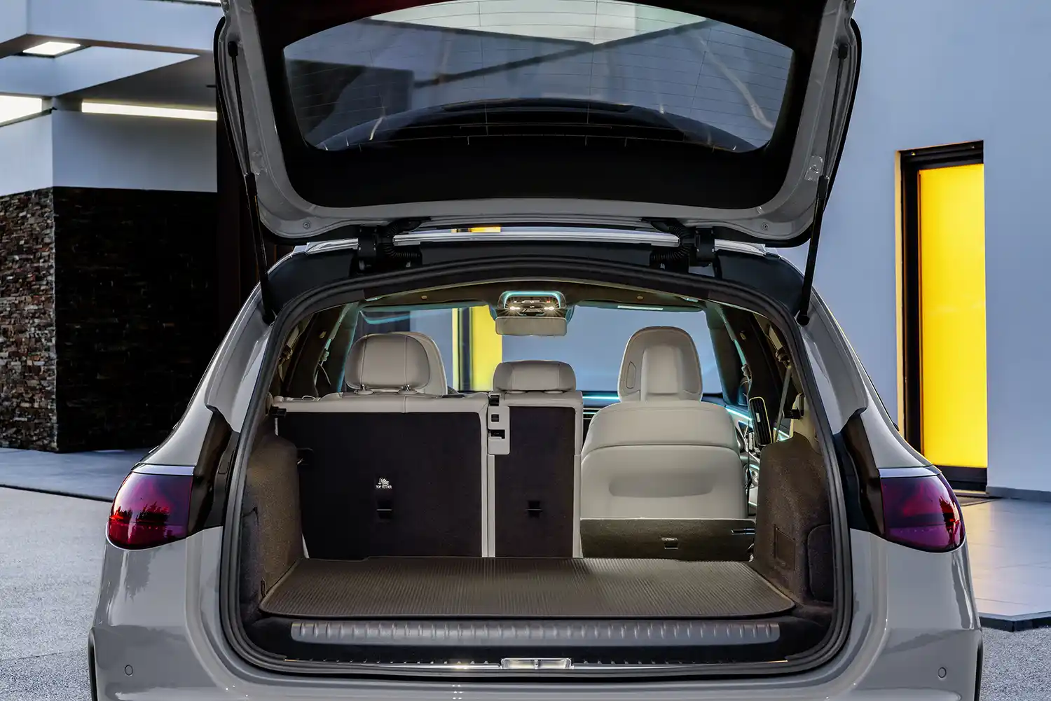 Compared to its predecessor, the Mercedes-Benz E-Class Estate has increased in width by 28 millimetres. This gives the rear passengers even more space: The elbow room in the rear is 1519 millimetres – 25 millimetres more than before. The wheelbase has increased by 22 millimetres to 2961 millimetres. As a result, rear-seat passengers enjoy more knee room (84 millimetres; plus 9 millimetres) and leg room (934 millimetres; plus 15 millimetres). The load compartment can be expanded from 615 litres to up to 1830 litres. In the plug-in hybrid model, the luggage capacity is 460-1675 litres, and the load compartment is level there, too.