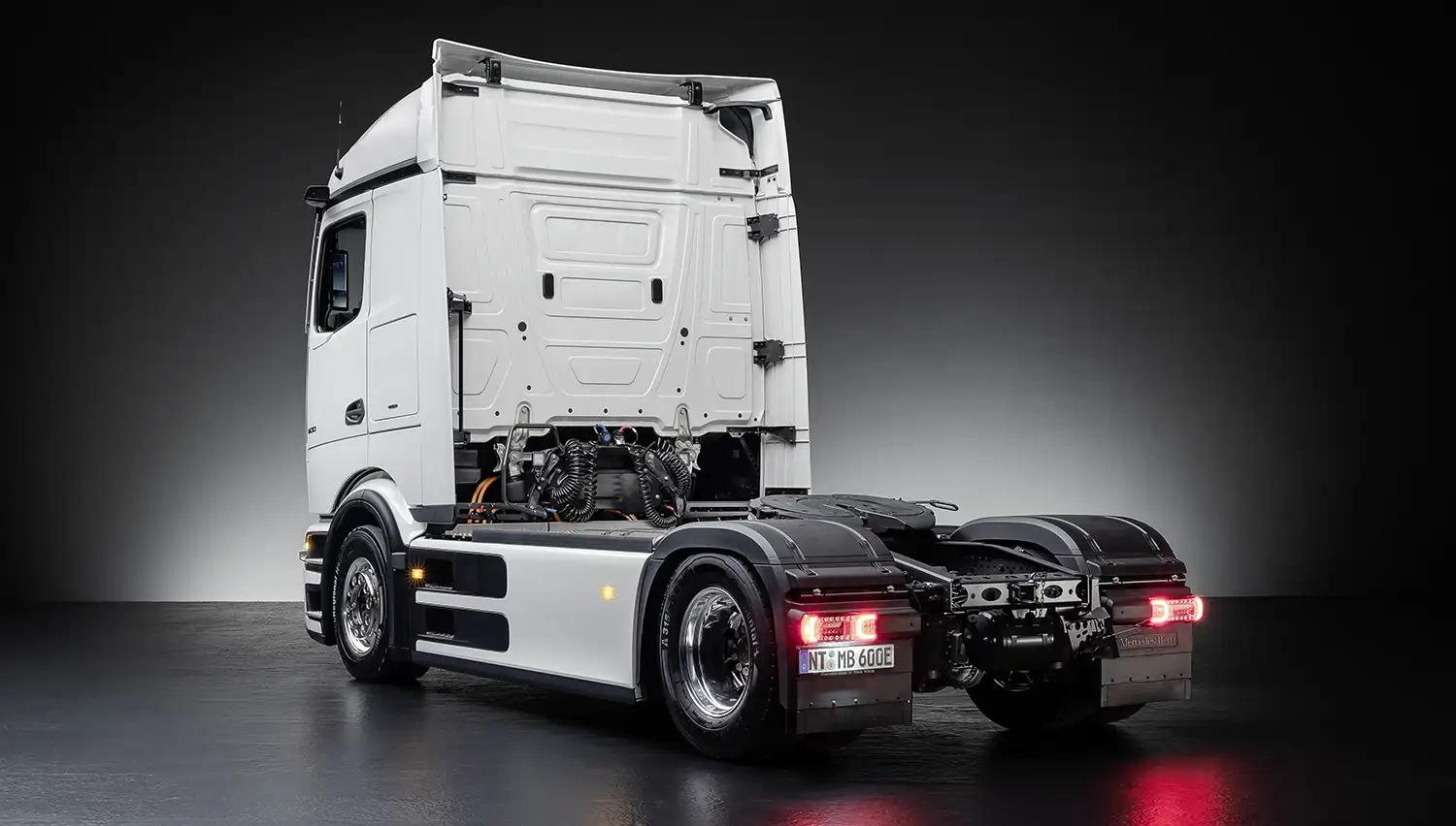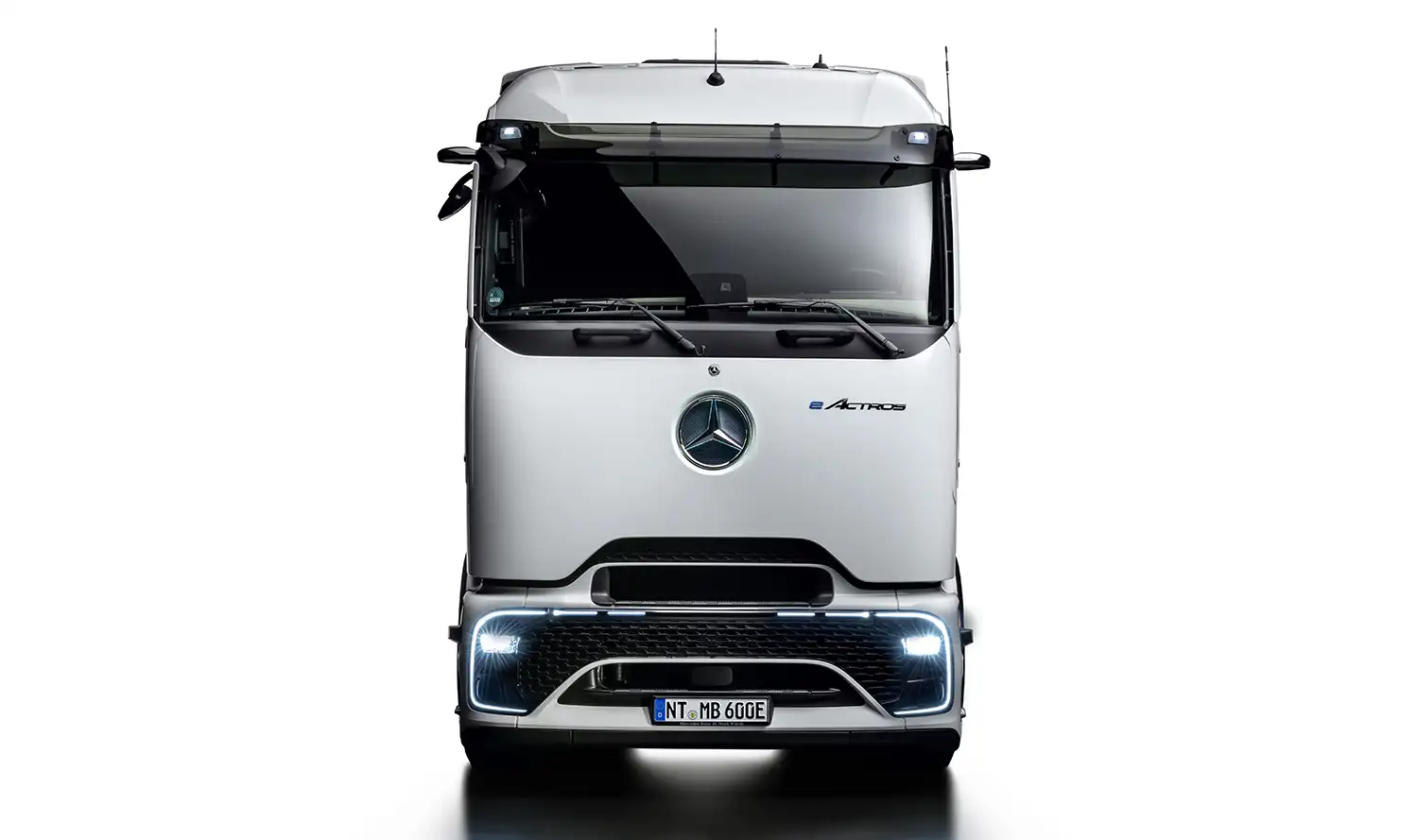 The new design language of the driver’s cab of the eActros 600 is characterized by particularly efficient aerodynamics. This is achieved with the large, completely closed and rounded-off front hood, an optimized bumper, including underbody paneling, an aerodynamically improved driver access and extended end flaps designed like sails. Air deflectors on the A-pillars, an additional spoiler on the roof and a sealed motor compartment complement the aerodynamic improvements to the cab. Over and above this, the cab is equipped with aluminum step plates, a new headlamp concept with matrix LED headlamps and an LED light strip. Mercedes-Benz Trucks markets the cab under the “ProCabin” name.