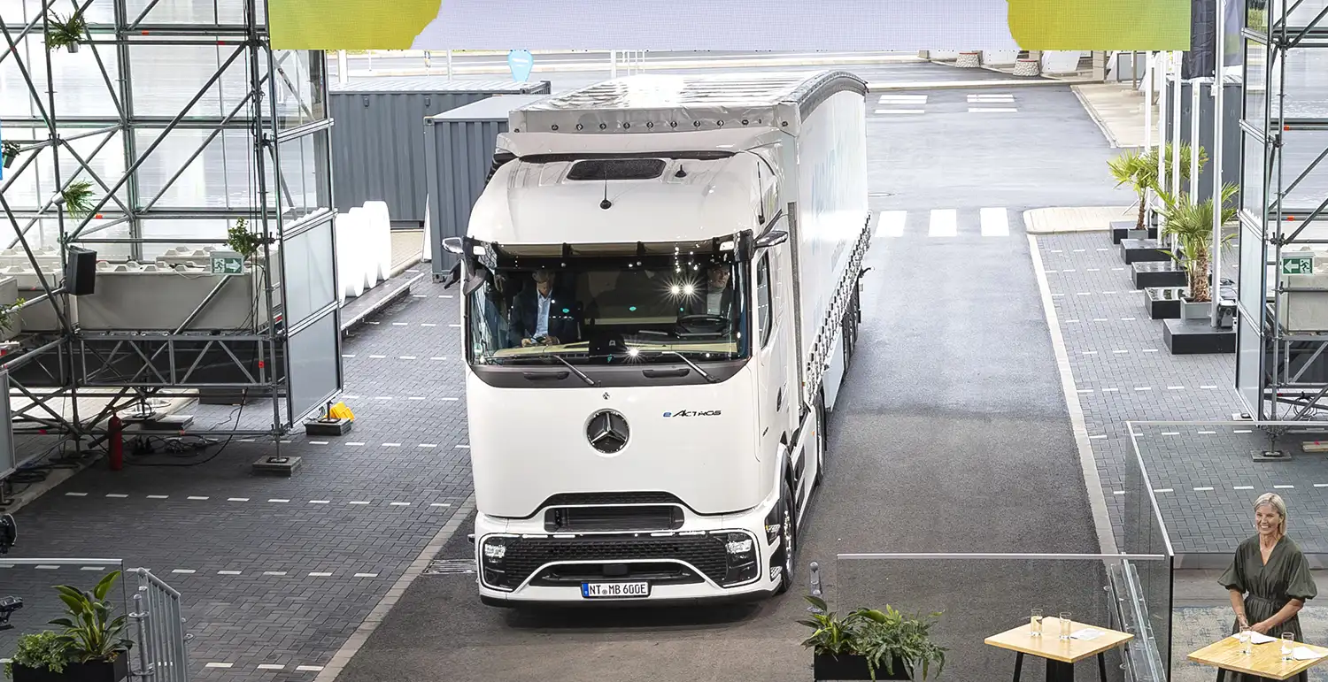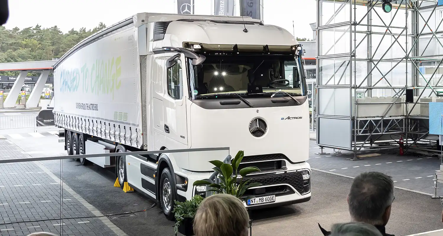 The world premiere of the eActros 600 took place at the Break Autohof Hamburg Nordheide directly at the A7 highway in Egestorf.