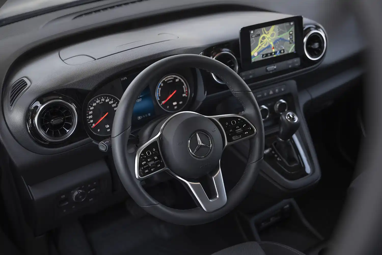 The eCitan Panel Van and Tourer are available in the BASE and PRO equipment lines. The PRO line has visual upgrades and even more functionality. For example, the door handles and the cover of the sliding door rail are painted in the vehicle colour. The interior and the load compartment have LED lighting. As standard, the eCitan PRO also comes with the Mercedes-Benz audio system, a -adjustable driver’s seat, air conditioning, electric front windows with comfort function and plastic flooring in the load compartment. The optional Interior Design Package offers further high-quality features such as high-gloss black trim in the instrument panel, chrome surrounds on the air vents in the instrument panel and on the loudspeakers, as well as chrome-plated door handles in the interior.