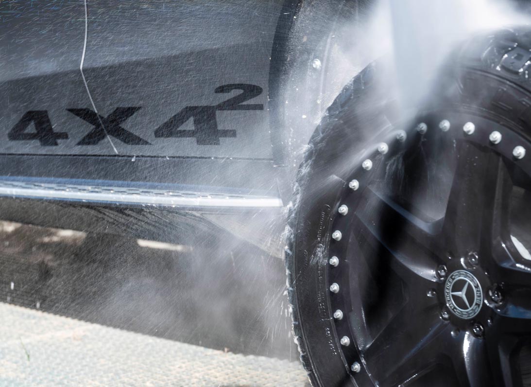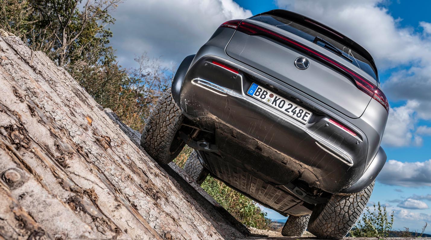 At 293 millimetres, the Mercedes-Benz EQC 4×4² rides more than twice as high as a production EQC (140 millimetres). Even a G-Class rides 58 millimetres lower. The fording depth is increased by 15 centimetres, to 40 centimetres.