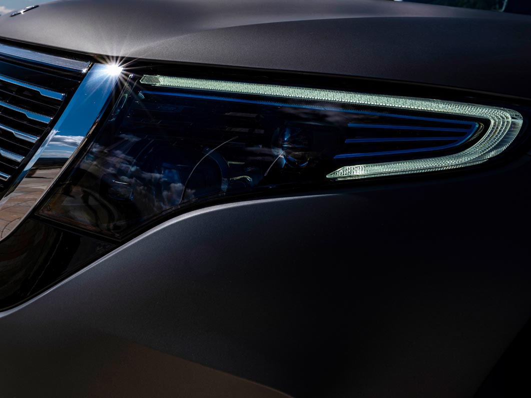 The production EQC uses the external noise generator (Acoustic Vehicle Alert System, AVAS) required by law to reproduce the sounds. The EQC 4×4² has a more powerful AVAS composed specifically for it and uses the headlamps as external speakers for this purpose. The reason being that the sound experts of Mercedes-Benz have made creative use of the available installation space in the headlamp housings – the “lampspeaker” was born.