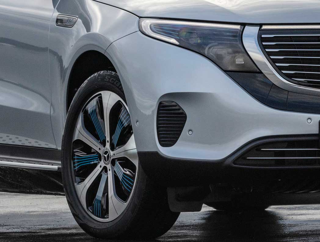 AMG Line Exterior for the EQC 400 4MATIC AMG Line includes the AMG-specific Black Panel front grille in a twin-blade design with a surround in high-gloss black, an AMG-specific front apron in a jet-wing design with air inlets featuring trim elements in chrome and inserts in high-gloss black plus visible and functional AIR CURTAINS, 48.3 cm (19-inch) aerodynamically optimised AMG 5-twin-spoke light-alloy wheels painted in tantalum grey with a high-sheen finish, a wider, AMG-specific rear apron with visible, non-functional air outlets and a diffuser insert in black with chrome trim, and exterior mirrors in the vehicle colour.