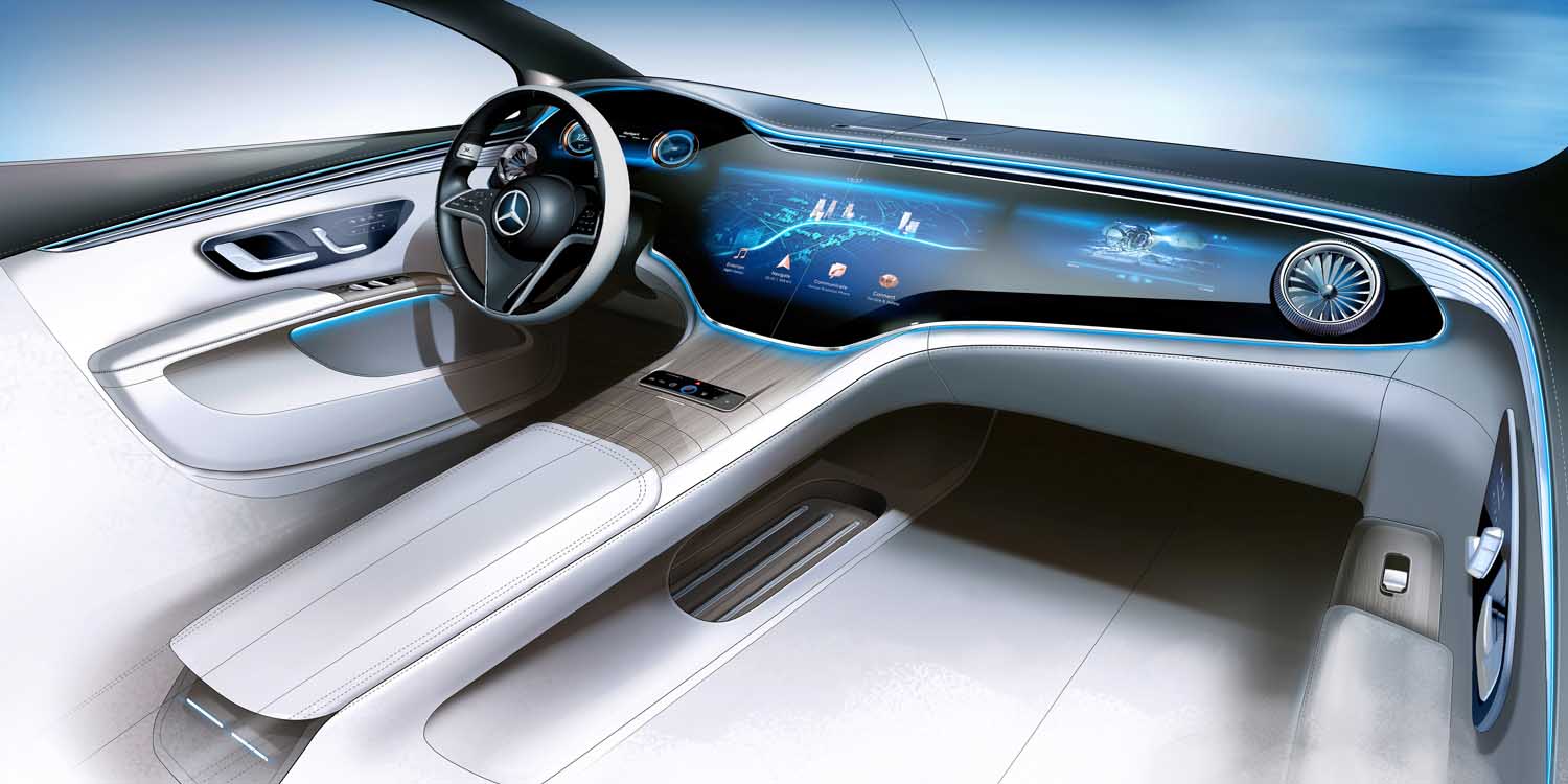 The EQS is the luxurious and avant-garde top-of-the-range model from Mercedes-EQ. With this completely new type of vehicle, the designers had the mission and the opportunity to take a completely new approach to the interior design as well. They made use of this freedom and, in addition to the MBUX Hyperscreen, relied on consistent digitisation for many other elements.