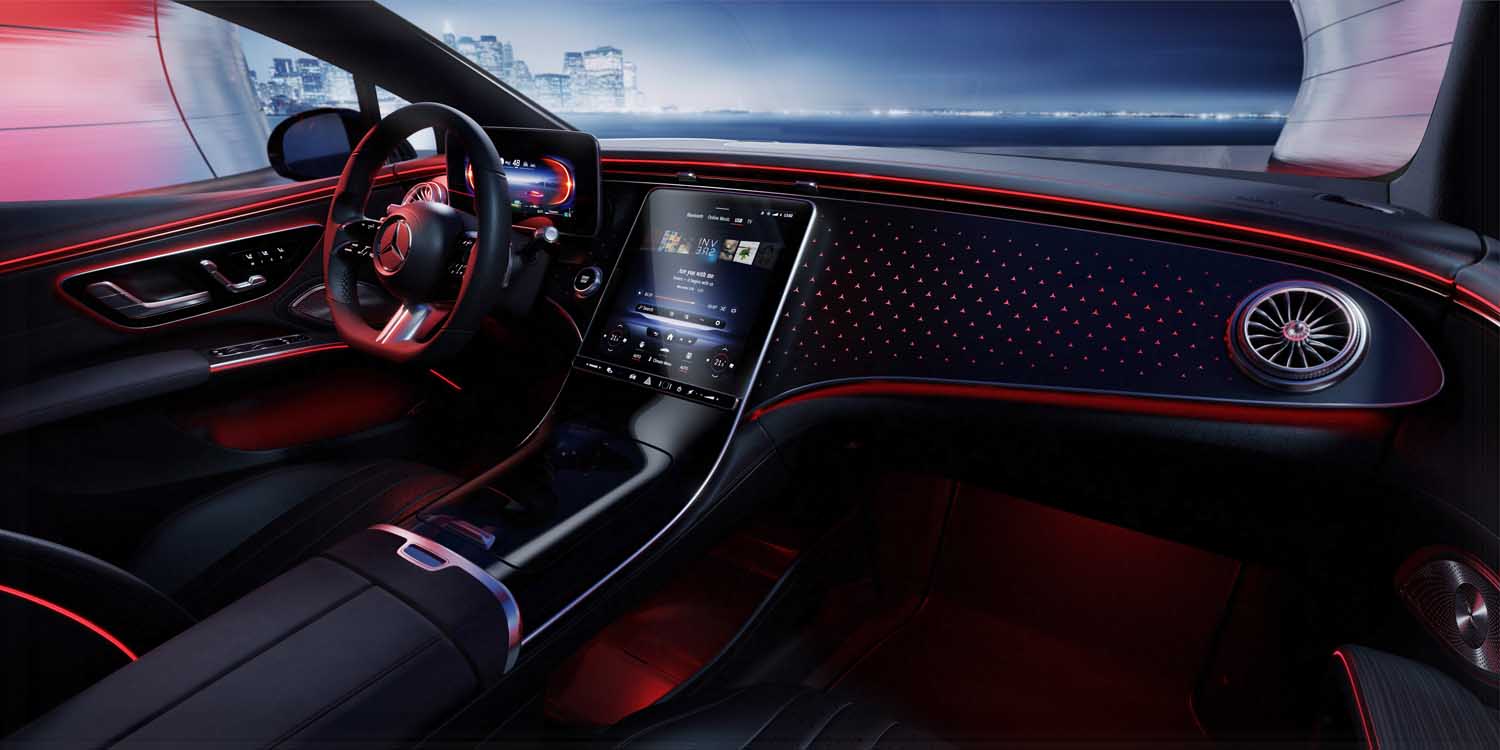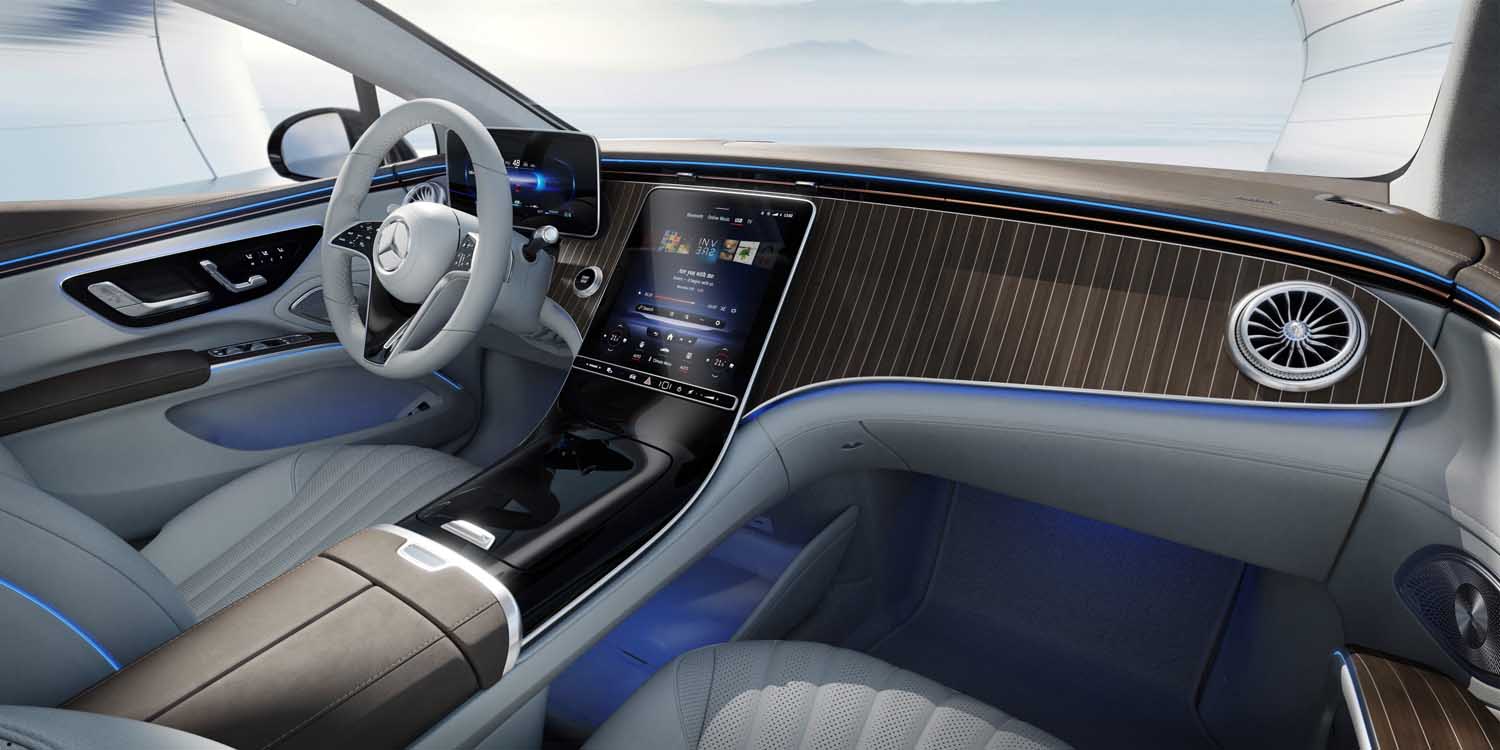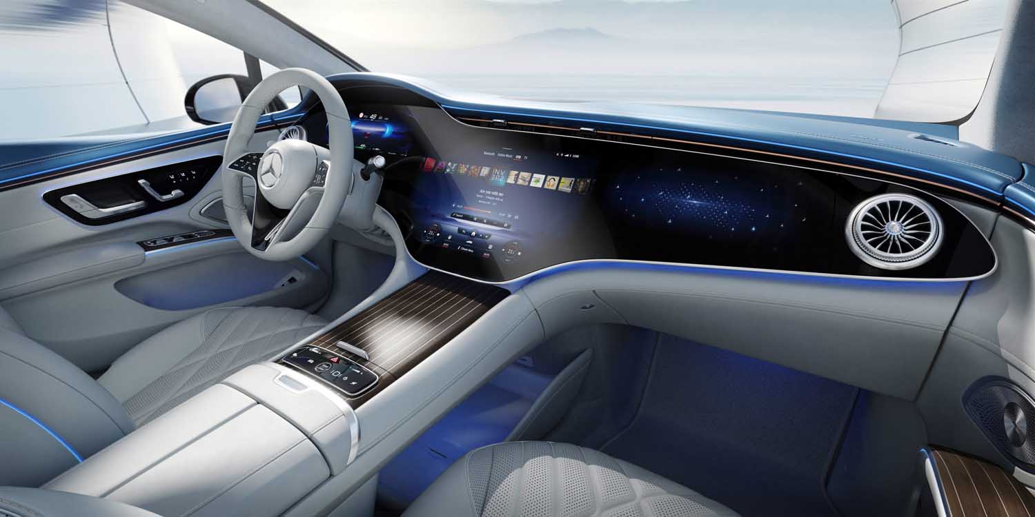 - Visual perception: over 100 million rods and cones are located in the retina of the human eye. These sensory cells enable us to see, for example, the features of the EQS that are revolutionary for the luxury class, such as the cab-forward design or the coupé-like “one-bow” lines with fastback. This clearly distinguishes the EQS from vehicles with combustion engines at first glance and is further emphasised by the Black Panel front and the design of the lights.The designers had the mission and the chance to tread a completely new path in styling the interior. They made use of this freedom: the MBUX Hyperscreen is one of the highlights in the new EQS. The concave screen stretches out in front of the occupants from the left to the right A-pillar like an ocean wave. Besides the sheer size, the high-quality, detailed design also guarantees a “wow” effect. The MBUX Hyperscreen is integrated into the instrument panel in minimalist fashion. Only a thin silver shadow frame, a vent band and a narrow leather frame surround it. The vent band spans across the entire at the top and is very slim at the same time. These extreme proportions, together with the glass wave of the MBUX Hyperscreen, create the avant-garde architecture of the cockpit. The calm and clear design of the door panels borrows from the interior design of modern living spaces. Avant-garde as well as traditional materials and colours give the interior a special atmosphere. Another visual highlight is the head-up display with augmented reality content.