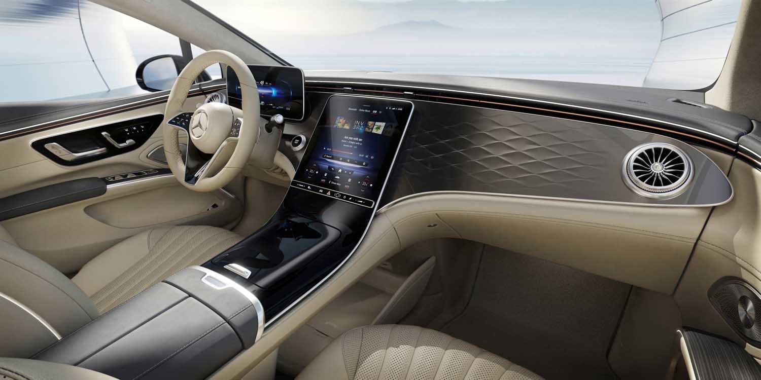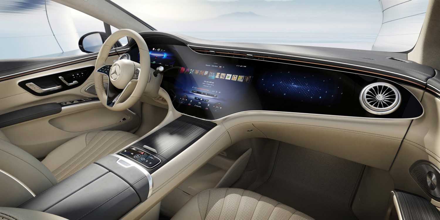 The MBUX Hyperscreen is the absolute highlight in the interior. This large, curved screen unit sweeps almost from A-pillar to A-pillar. Three screens sit under a common bonded cover glass and visually merge into one display. In addition to the so-called zero-layer design, the MBUX Hyperscreen offers intuitive touch operation with haptic feedback and force feedback. The scratch-resistant glass is coated to make cleaning easier.