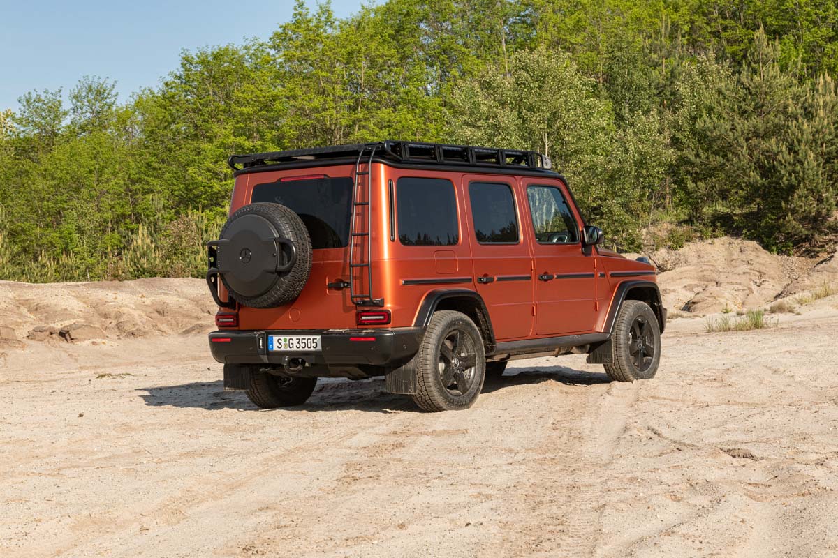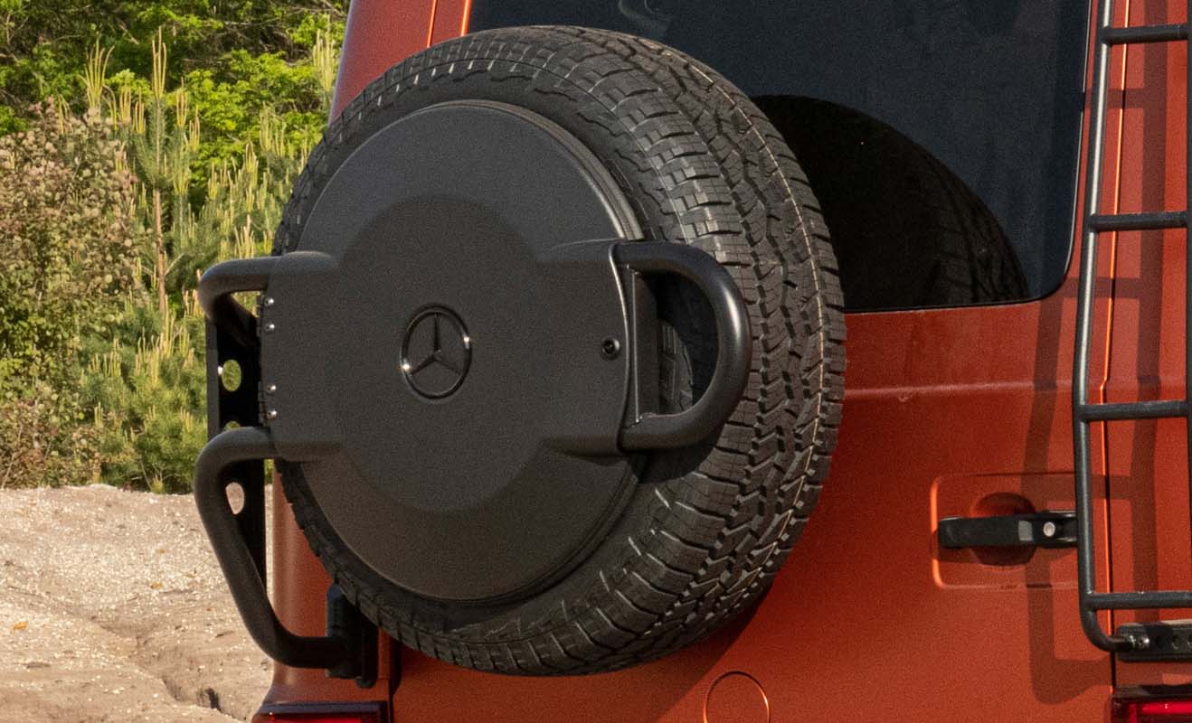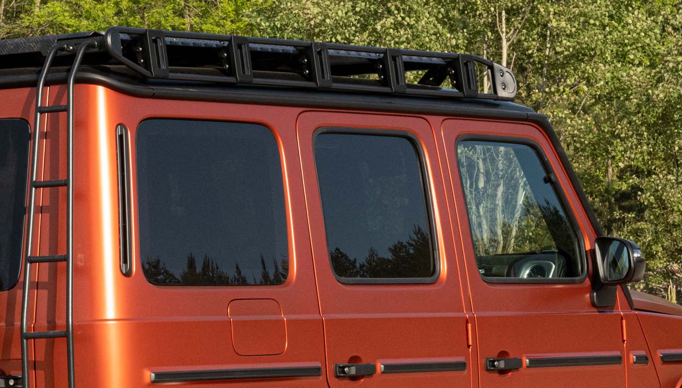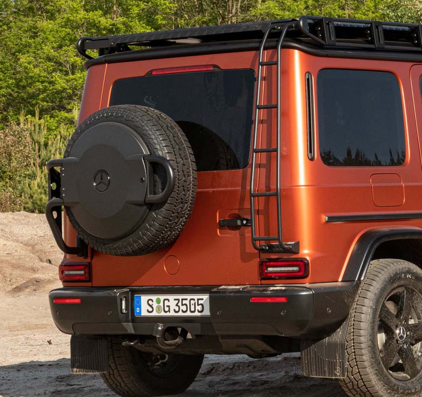The G manufaktur copper orange magno paintwork makes the PROFESSIONAL Line Exterior displayed at IAA MOBILITY particularly eye-catching, contrasting handsomely with the roof, bumpers and wheel arch extensions in G manufaktur night black magno. Other features include the PROFESSIONAL spare wheel holder on the rear door and the PROFESSIONAL roof rack on which, among other things, a roof tent can be erected, transforming the G-Class into an off-road camper van. Like the wheels, these two PROFESSIONAL options are finished in matte black for a harmonious overall appearance. The exterior mirror housings, Mercedes star and number plate are also finished in black as part of the optional Night package. Inside, the black leather upholstery and open-pore ash veneer with black tinting underline the high degree of the G-Class’ opportunities for individualisation.