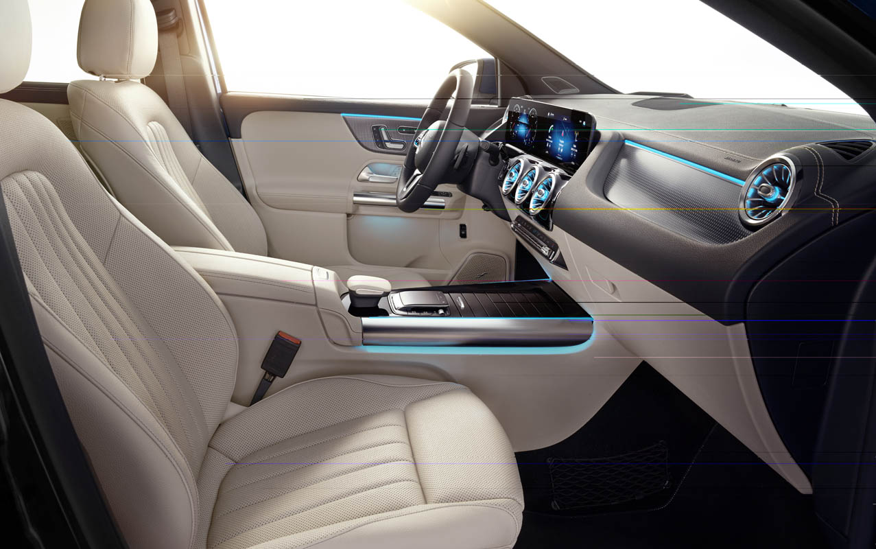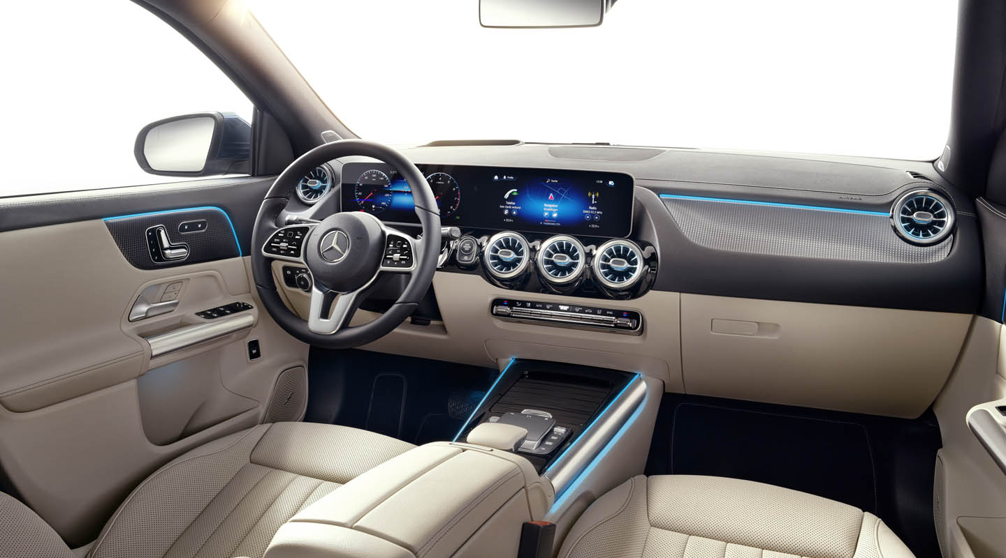 The seating position for both the driver and the front passenger is higher and more upright than in the predecessor model, and thus more typical of an SUV. The driver and front passenger sit 140 mm higher than in the A-Class and 50 mm higher than in the B-Class. All-round visibility has also been improved in comparison with the previous model – mainly due to an optimised cross-section for the roof pillars, which now block out less of the surrounding area.