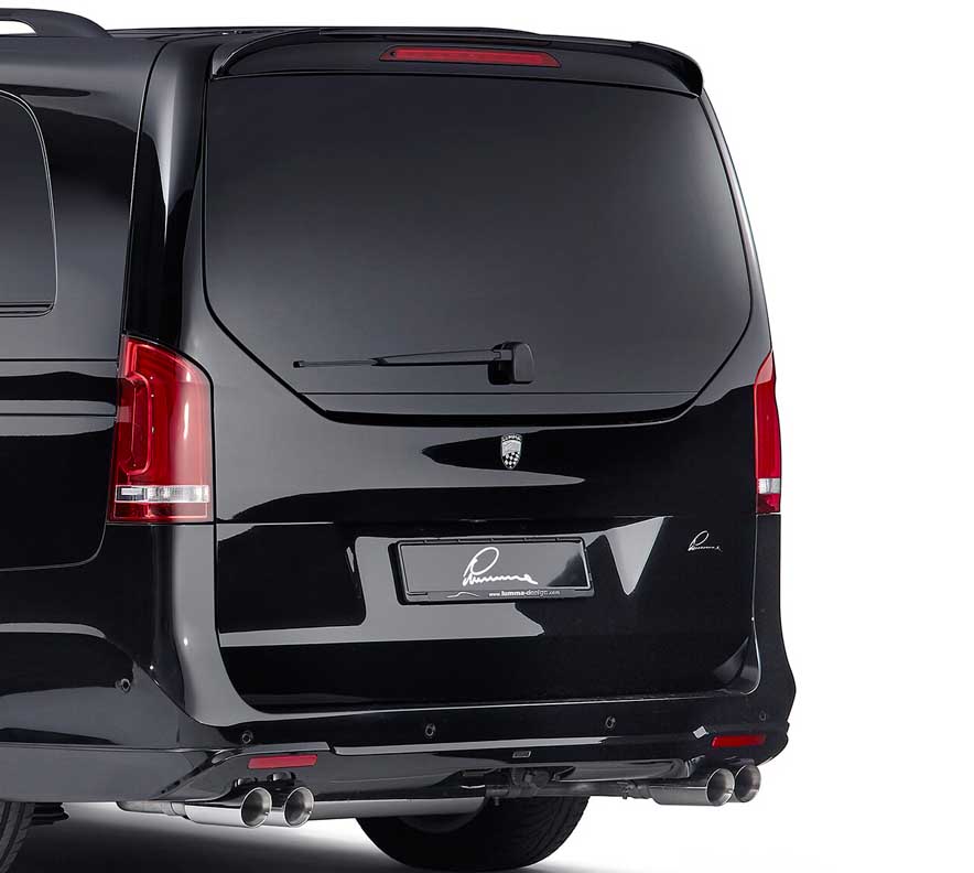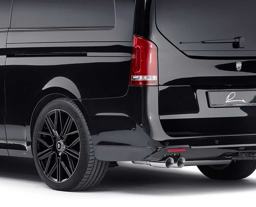 The LUMMA rear silencer is as if tailor made for the new outfit but is also suitable for the V-Class as a series vehicle. Four round stainless steel tailpipes impressively stage the rear view and amplify the sound.