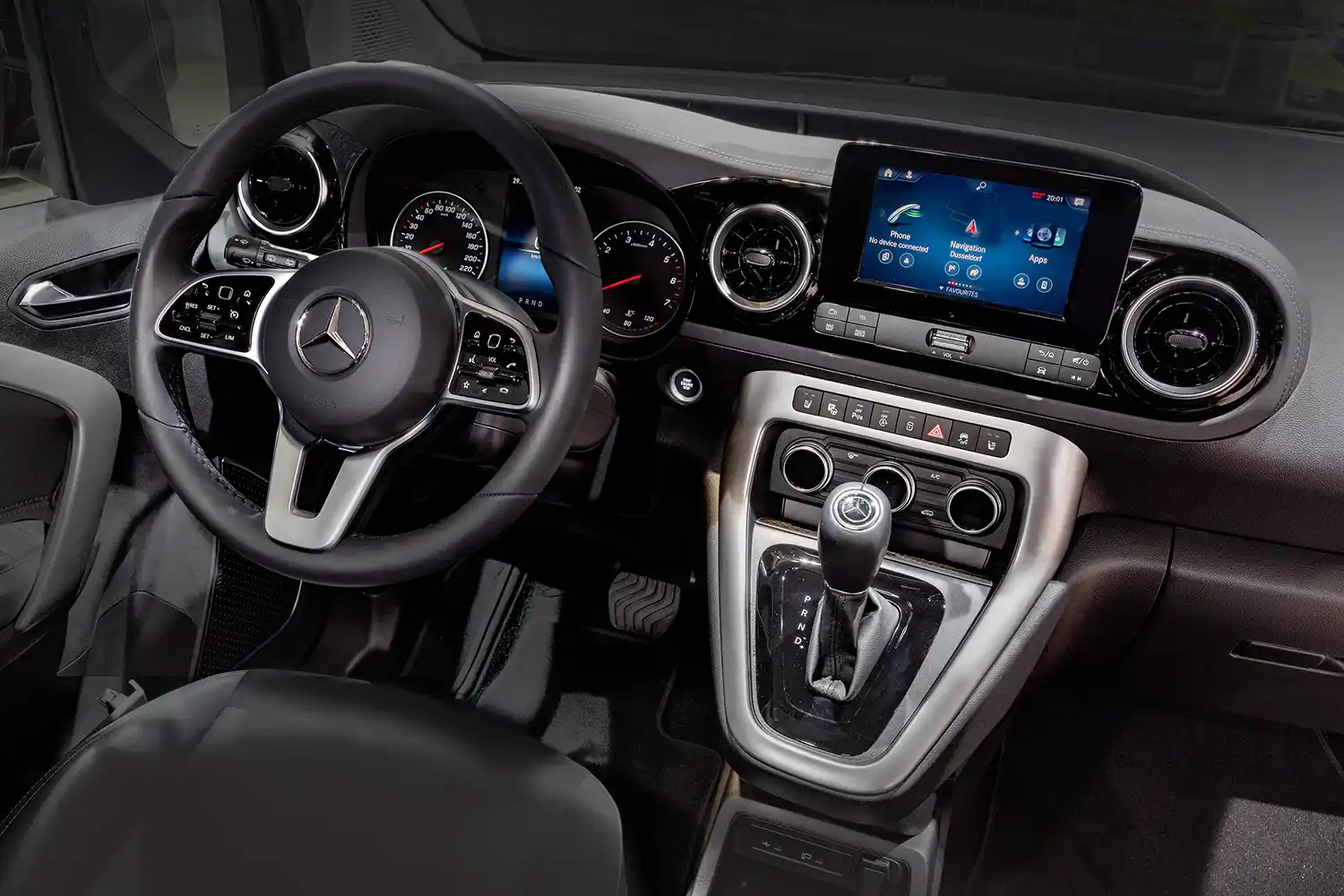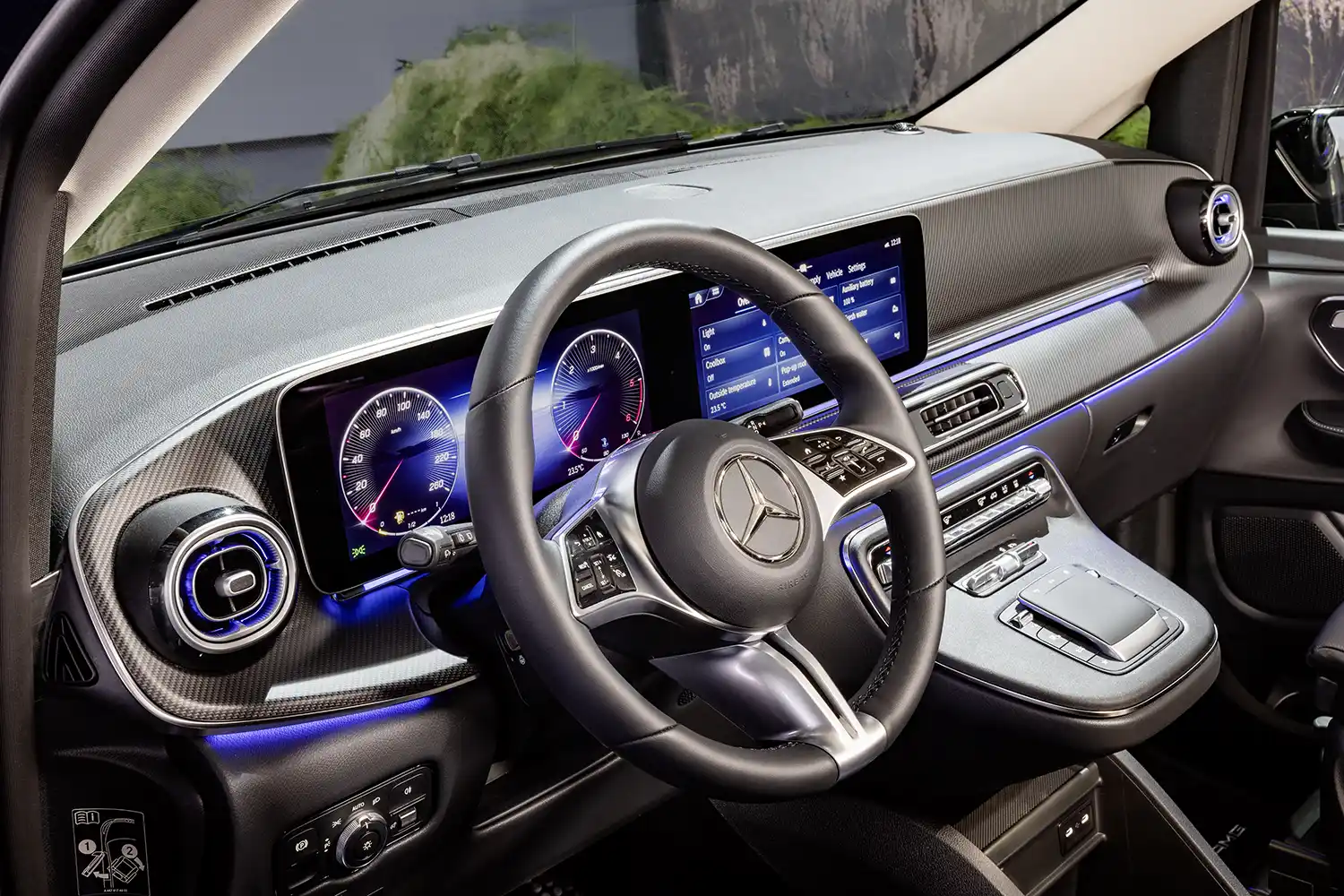 Other new comfort features include the optional steering wheel heating as well as the optional dimmed rear lighting for night-time driving. The ambient lighting, which can now also be found in the rear sliding door in the camper as an option for the first time, offers an even more individual lighting mood with 64 new colours. Another significant comfort gain is the introduction of the current MBUX generation. On request, this brings additional functions on board, such as the ENERGIZING comfort control or navigation with augmented reality.
