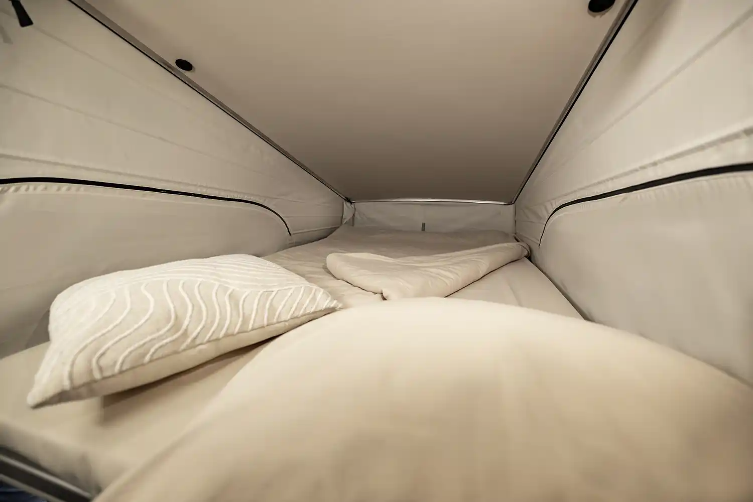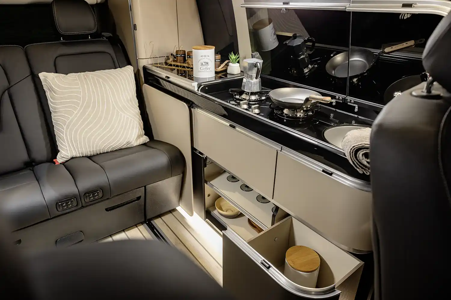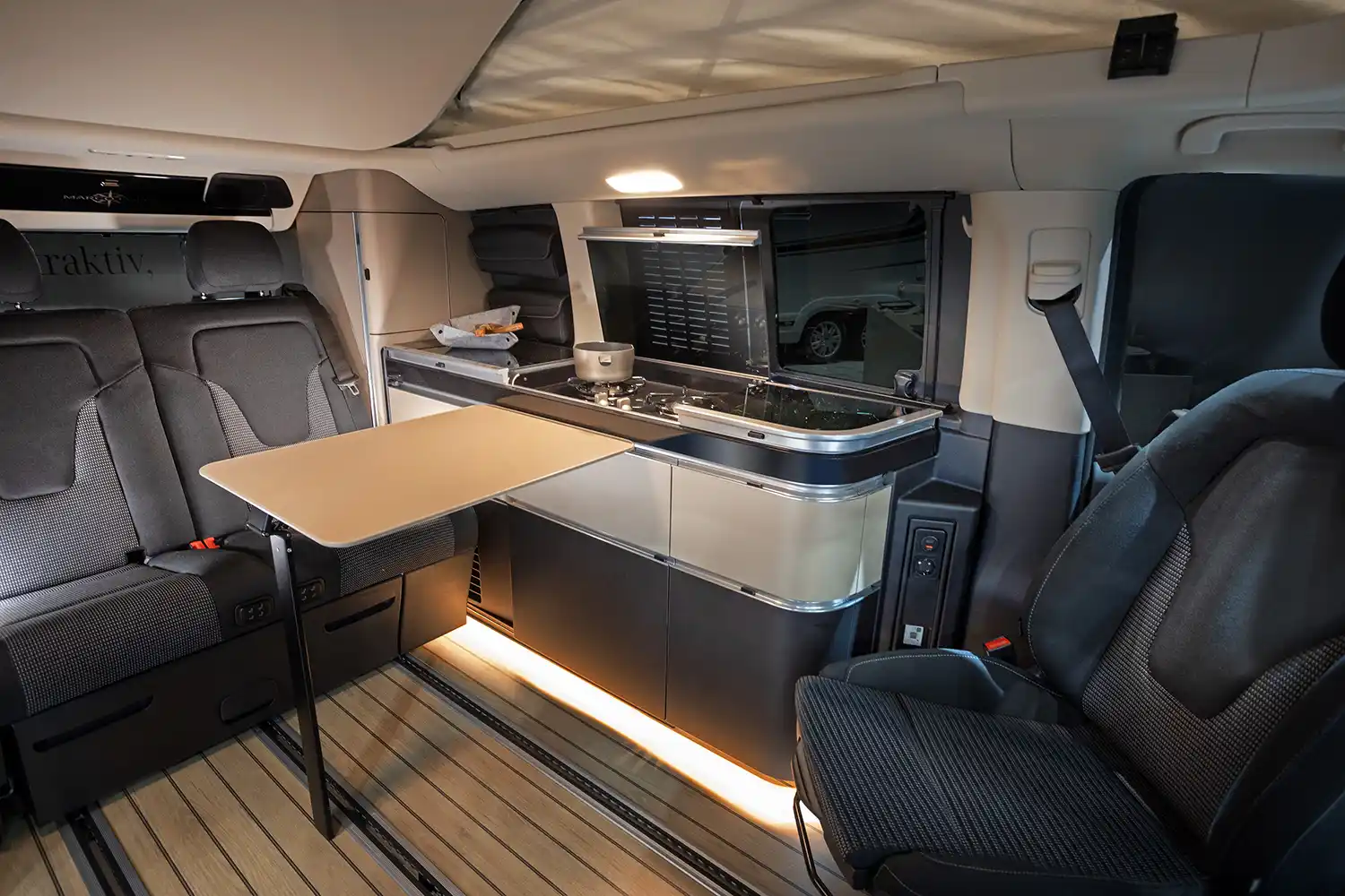 The proven living space concept in the new V-Class Marco Polo remains unchanged. The camper still offers space for up to four people and comes as standard with, among other things, a pop-up roof with roof bed, a seat/bunk combination, a folding table, a fully equipped kitchen and a wardrobe.