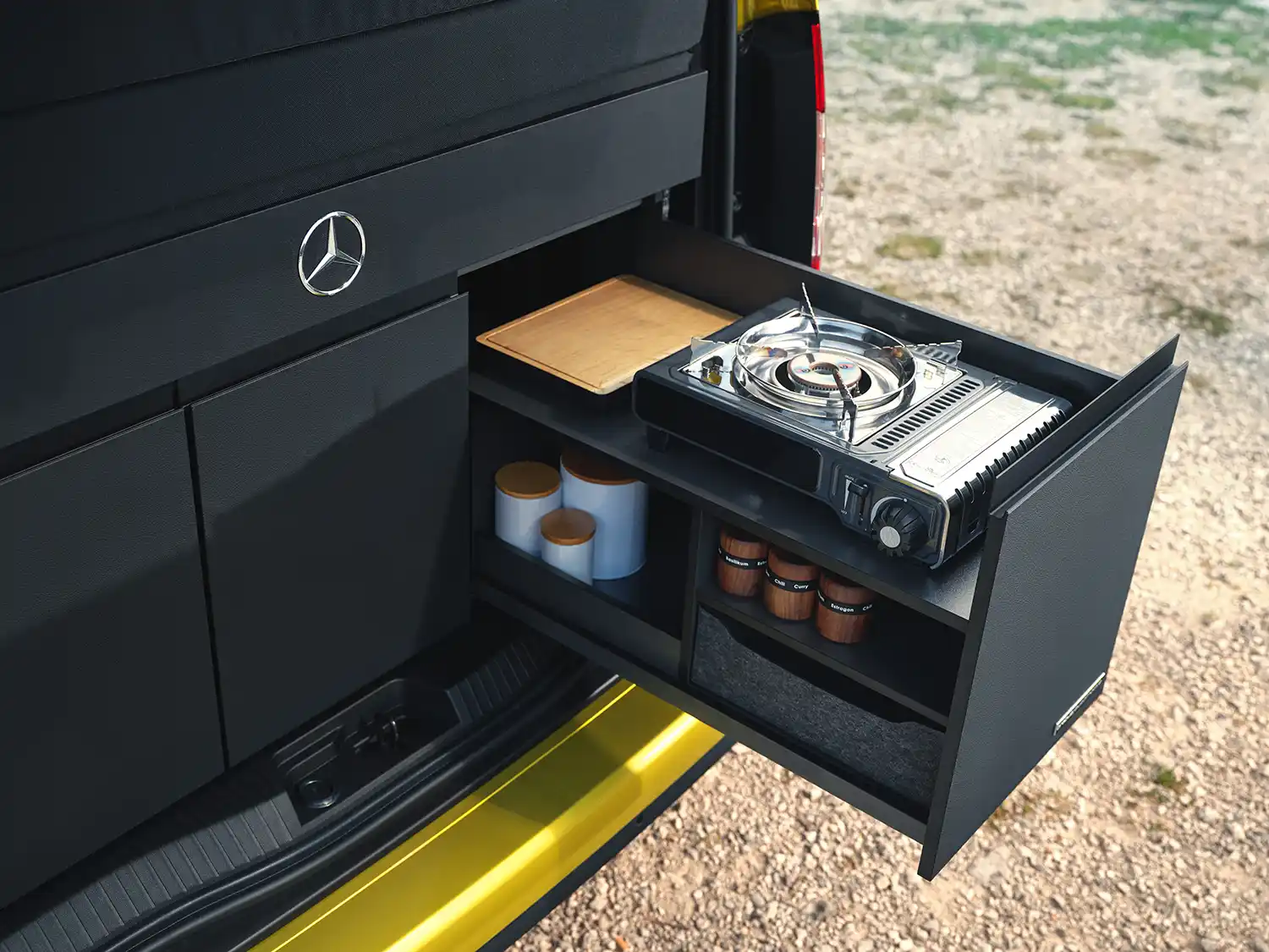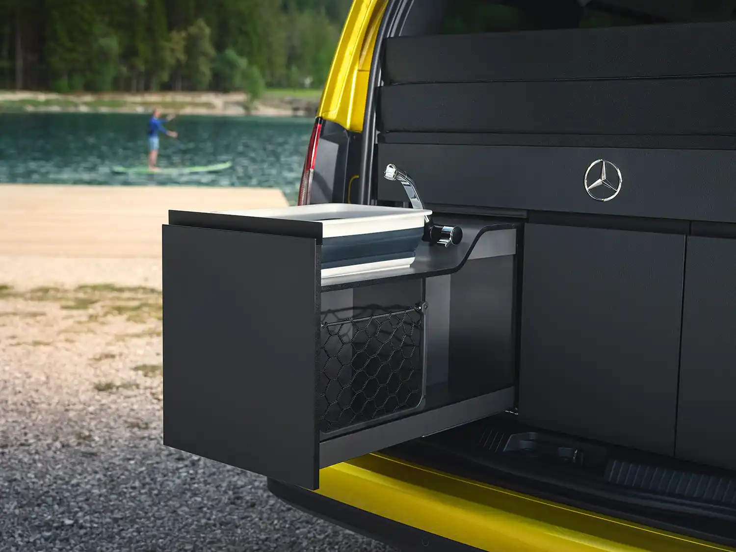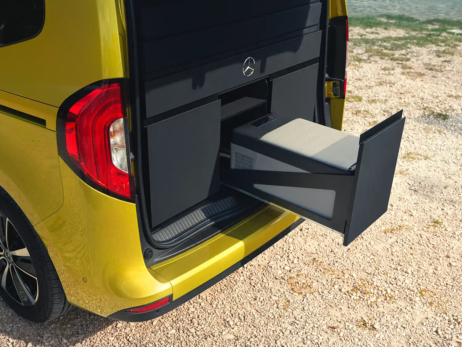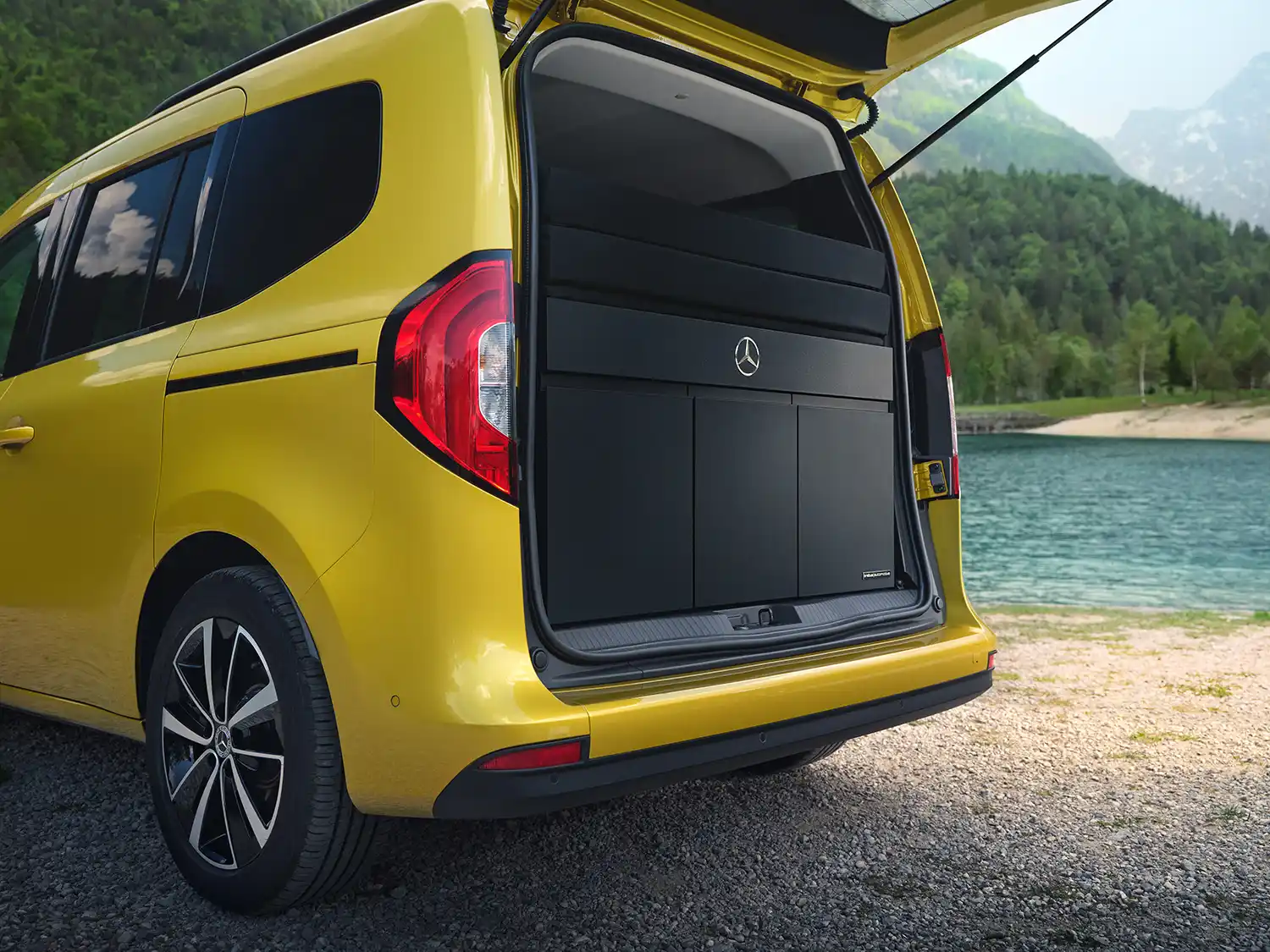 The Marco Polo Module transforms the small vans with the star, including the T-Class, into micro-campers in no time at all, thus rounding off the Marco Polo family downwards. The module is placed in the boot of the vehicle and fixed to lashing eyelets.[1] It consists of a standard bed unit for two people and an optional kitchen unit with sink and gas cartridge cooker. If desired, a refrigerator box can also be added, which finds space in the kitchen unit.