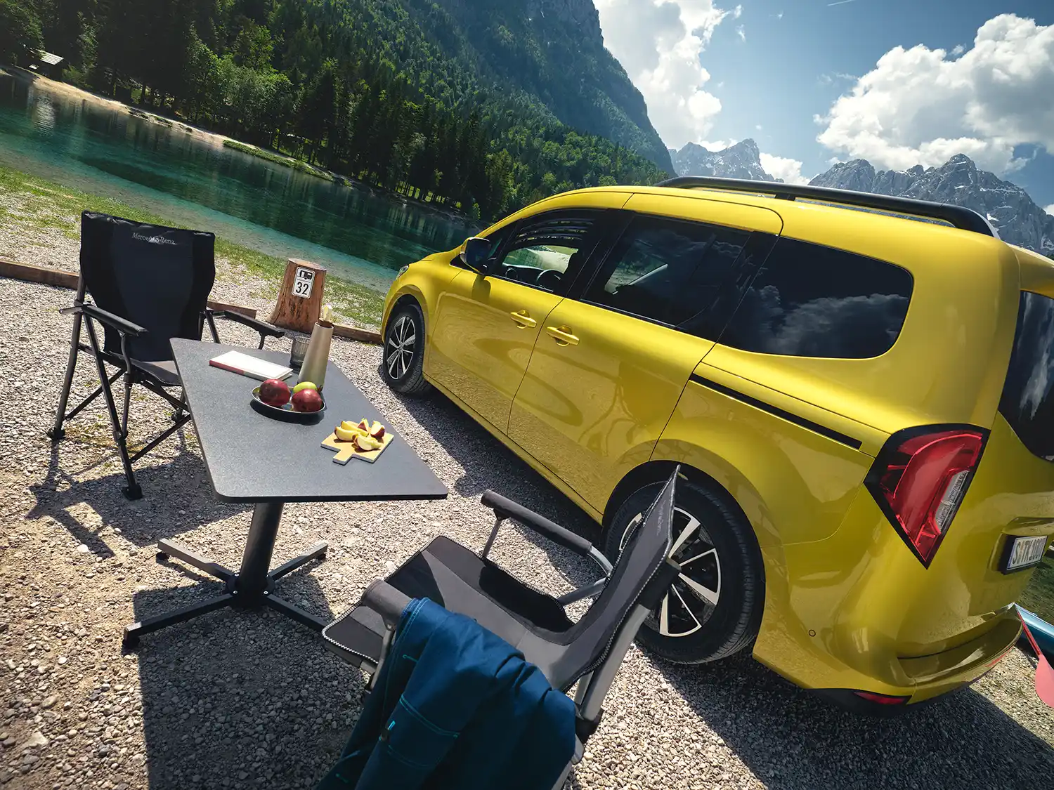 Other optional features include an auxiliary battery, the Sleeping Package with blackout elements and ventilation grilles with insect screens for the window panes, and window pockets that can be fitted between the C- and D-pillars; also a table and camping chairs. The table comes with two different feet. This means that it can be set up outdoors as well as fixed in the rear – a first in the segment.