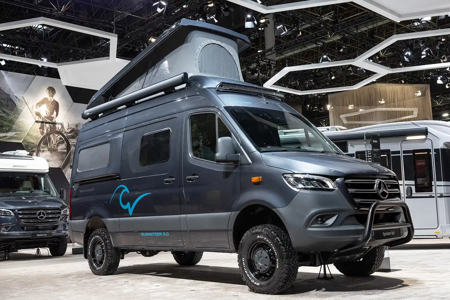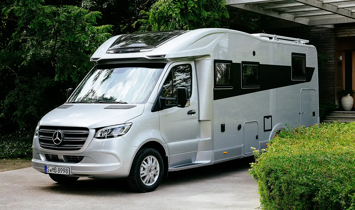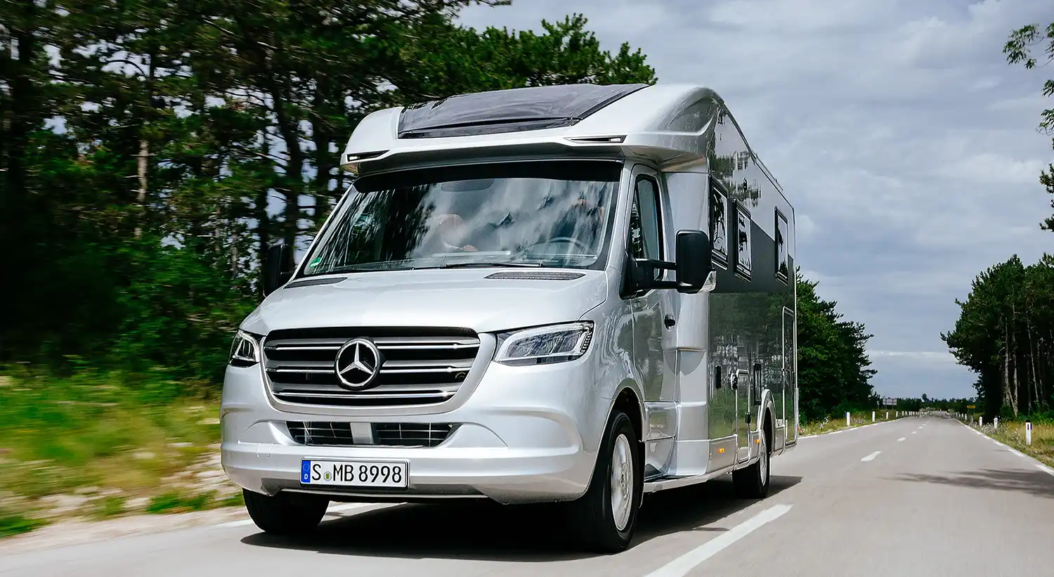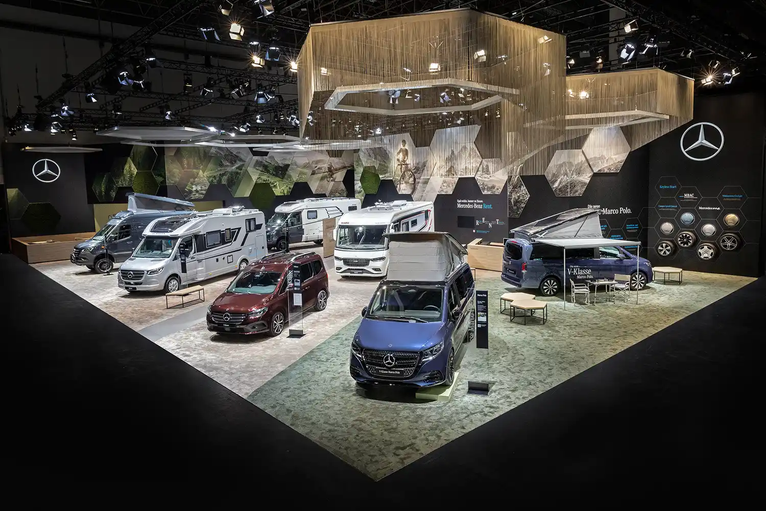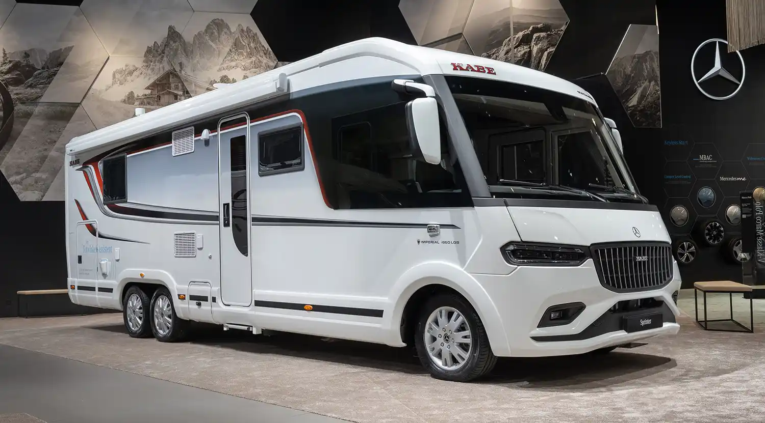The Mercedes-Benz Sprinter, an icon among vans, also in the RV industry, must of course not be missing at the leading trade fair for RVs and caravans. There are four of them on the Mercedes booth in Hall 16 – the Summiteer 6.0 panel van from Wochner, the semi-integrated RVs ML-T 580 from Hymer and Coral Supreme MB 650 SL from Adria and the fully integrated Travel Master Imperial 860 LQB from Kabe, which is a three-axle vehicle.
