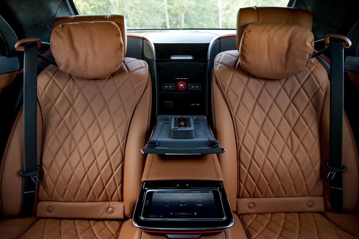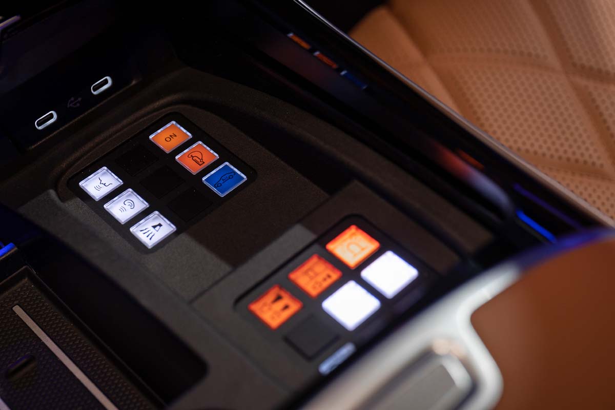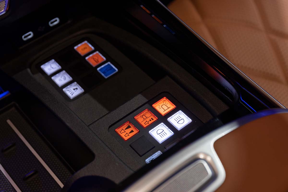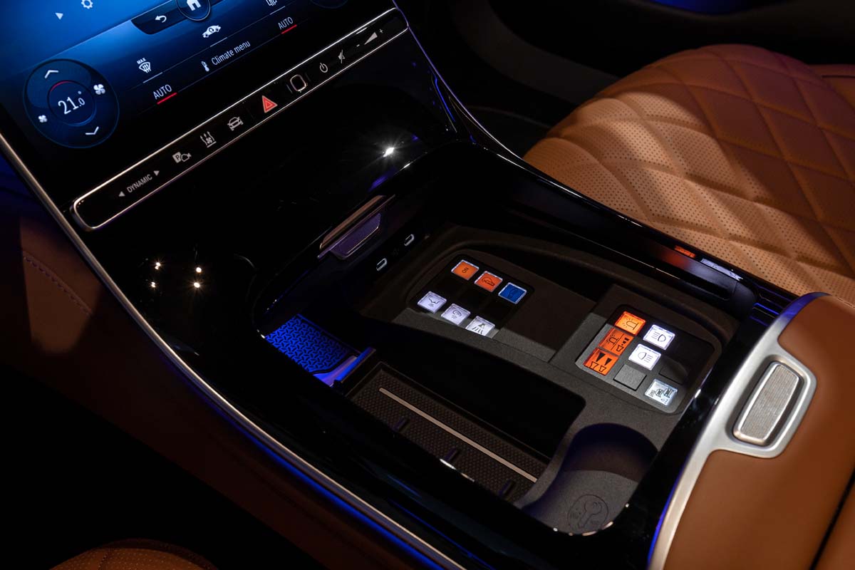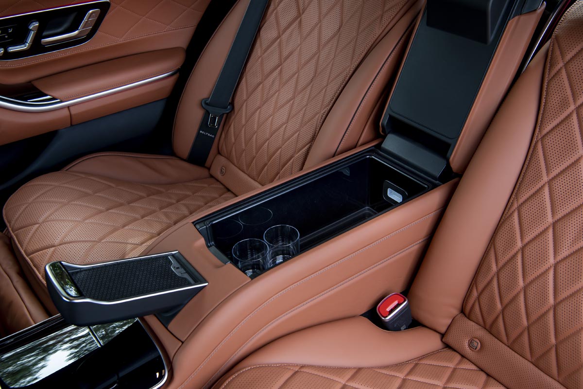 All in all, the luggage compartment holds about 390 litres, as the (optional) refrigerator is located in the centre armrest in the rear. Behind it is an armoured firewall.